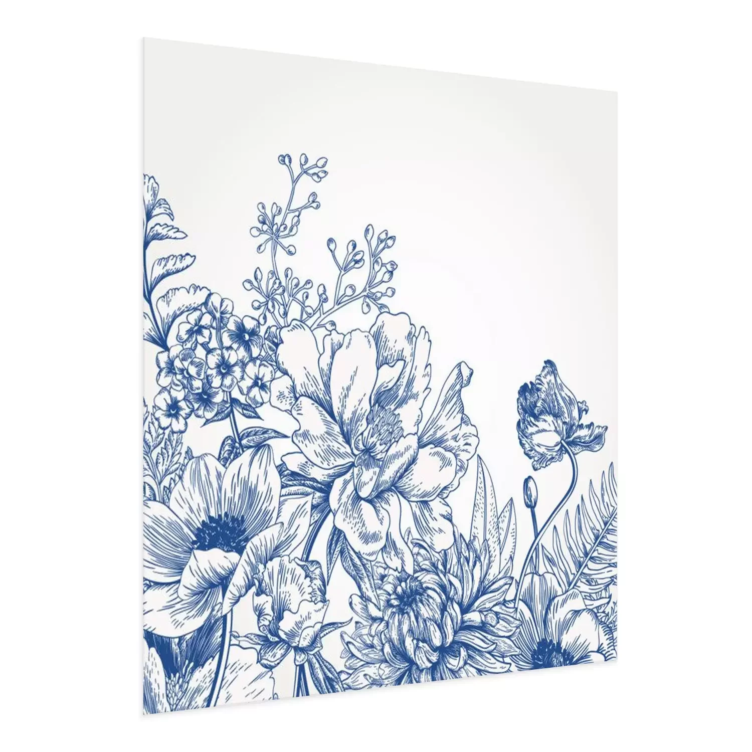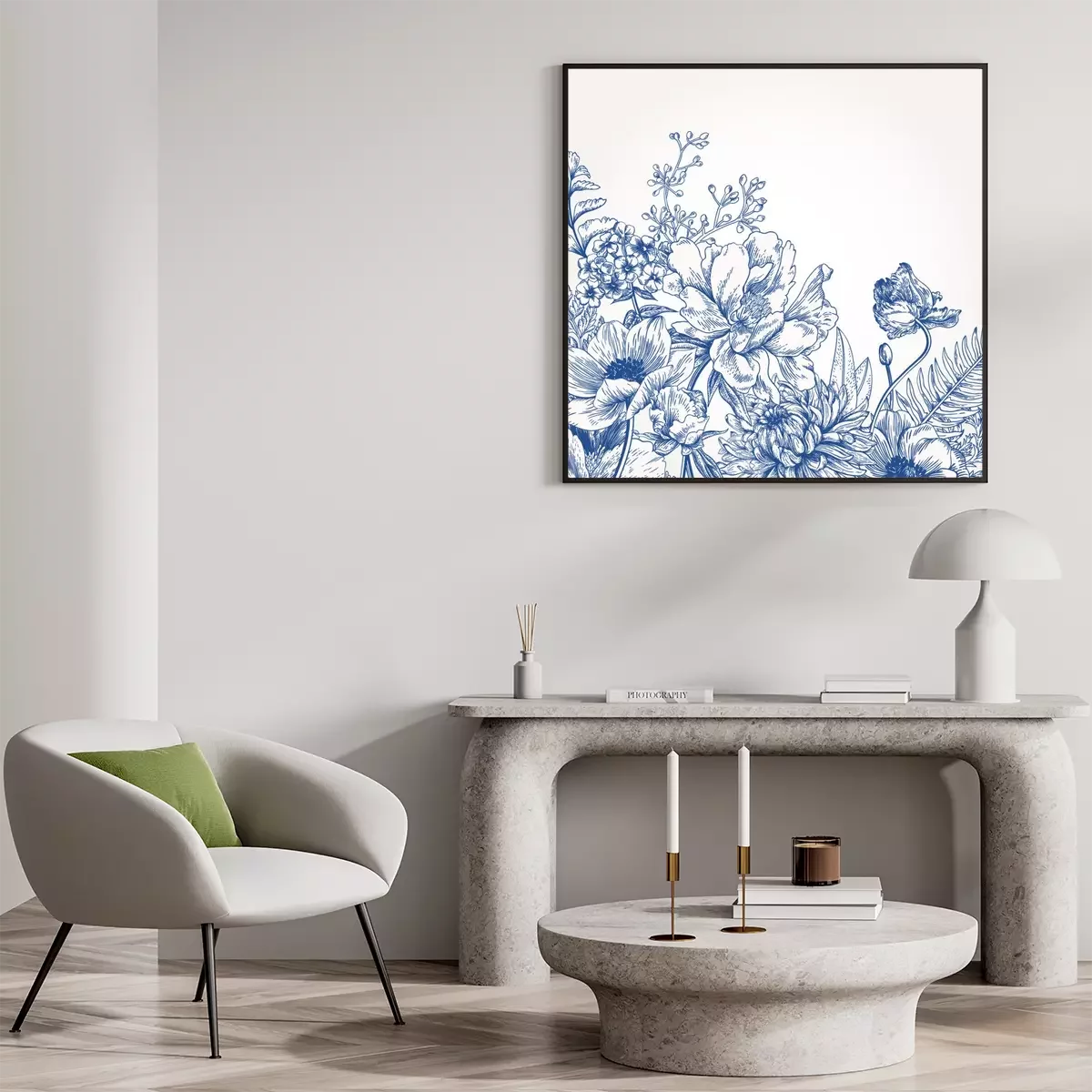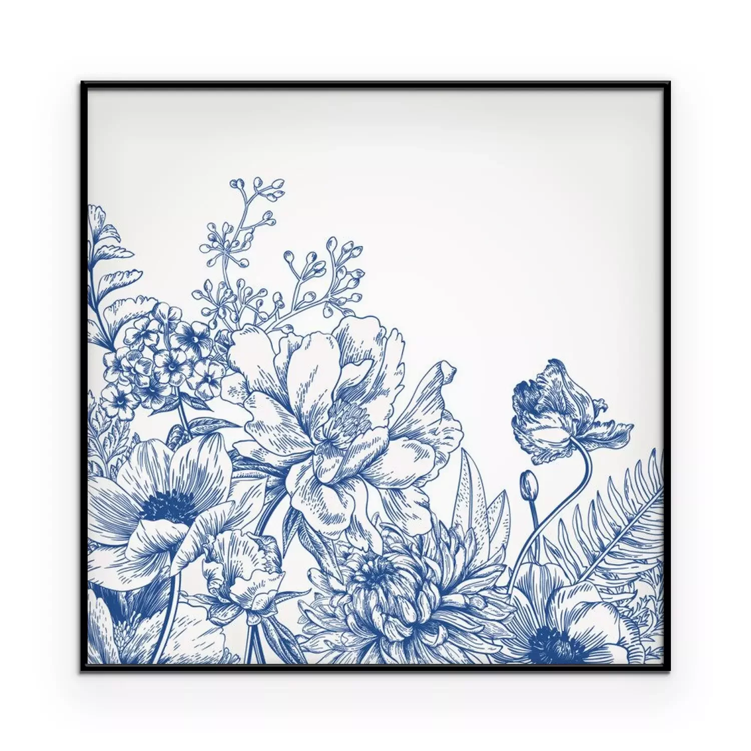 Poster  Pivoines et plantes des champs dessinées avec une ligne bleue