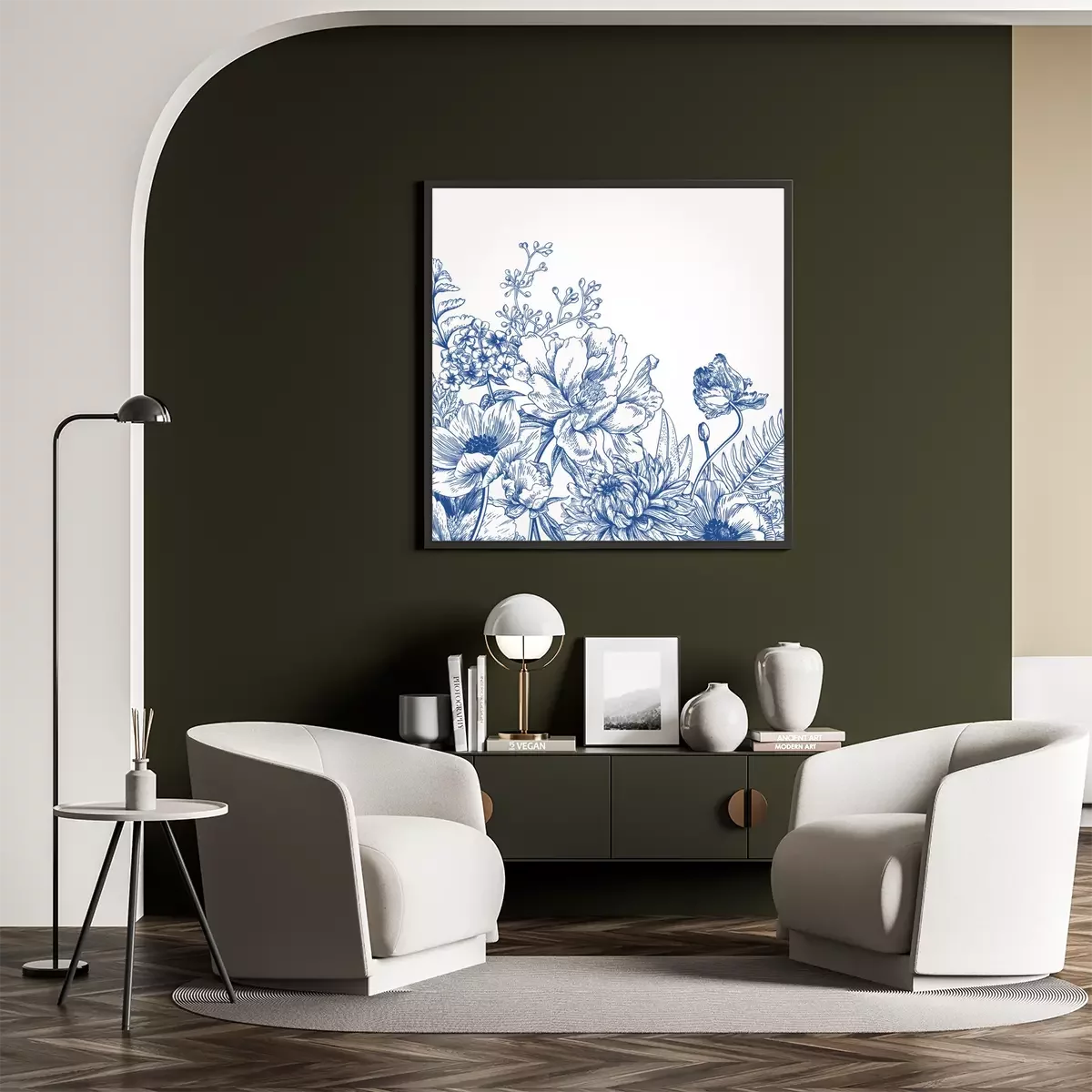 Poster : Pivoines et plantes des champs dessinées avec une ligne bleue