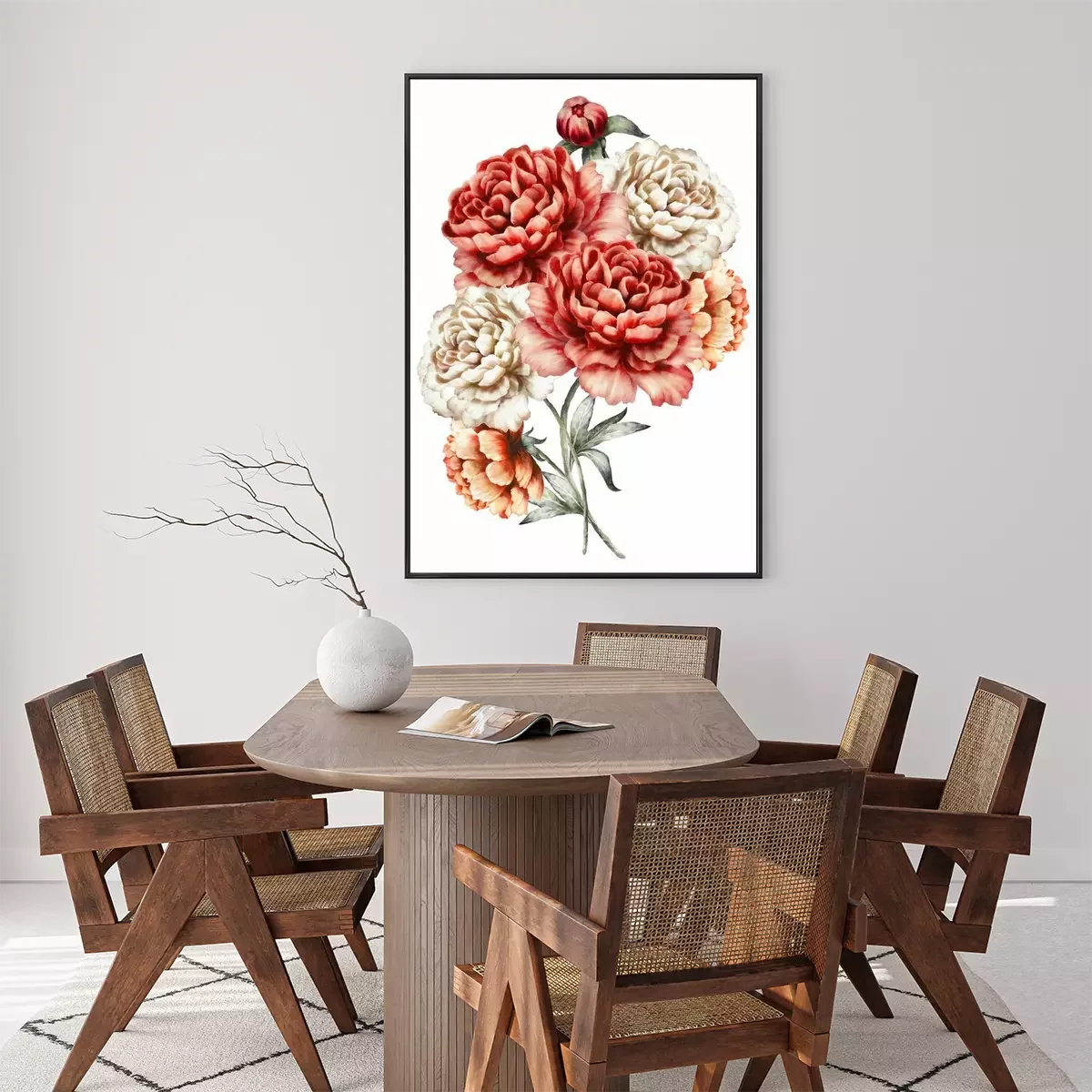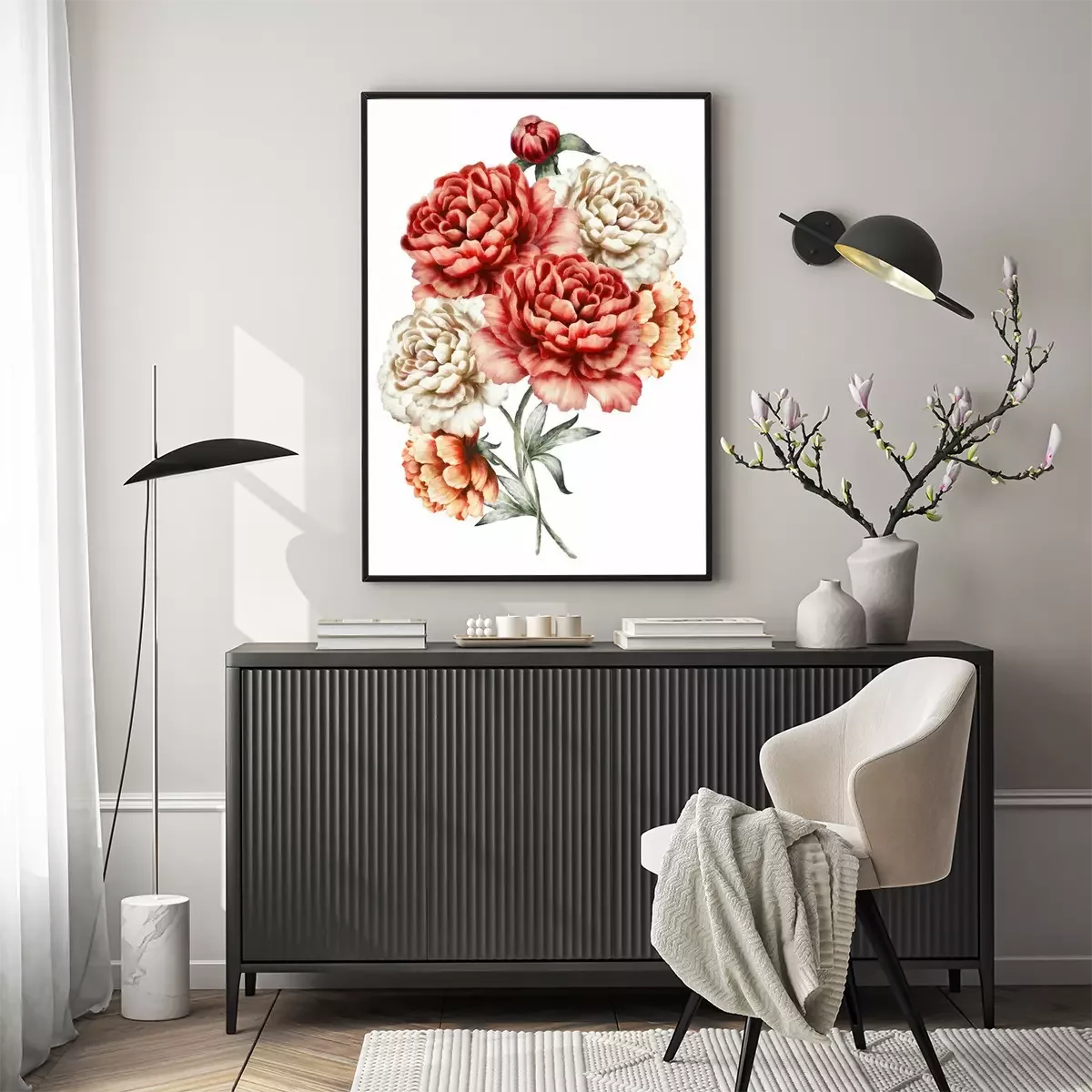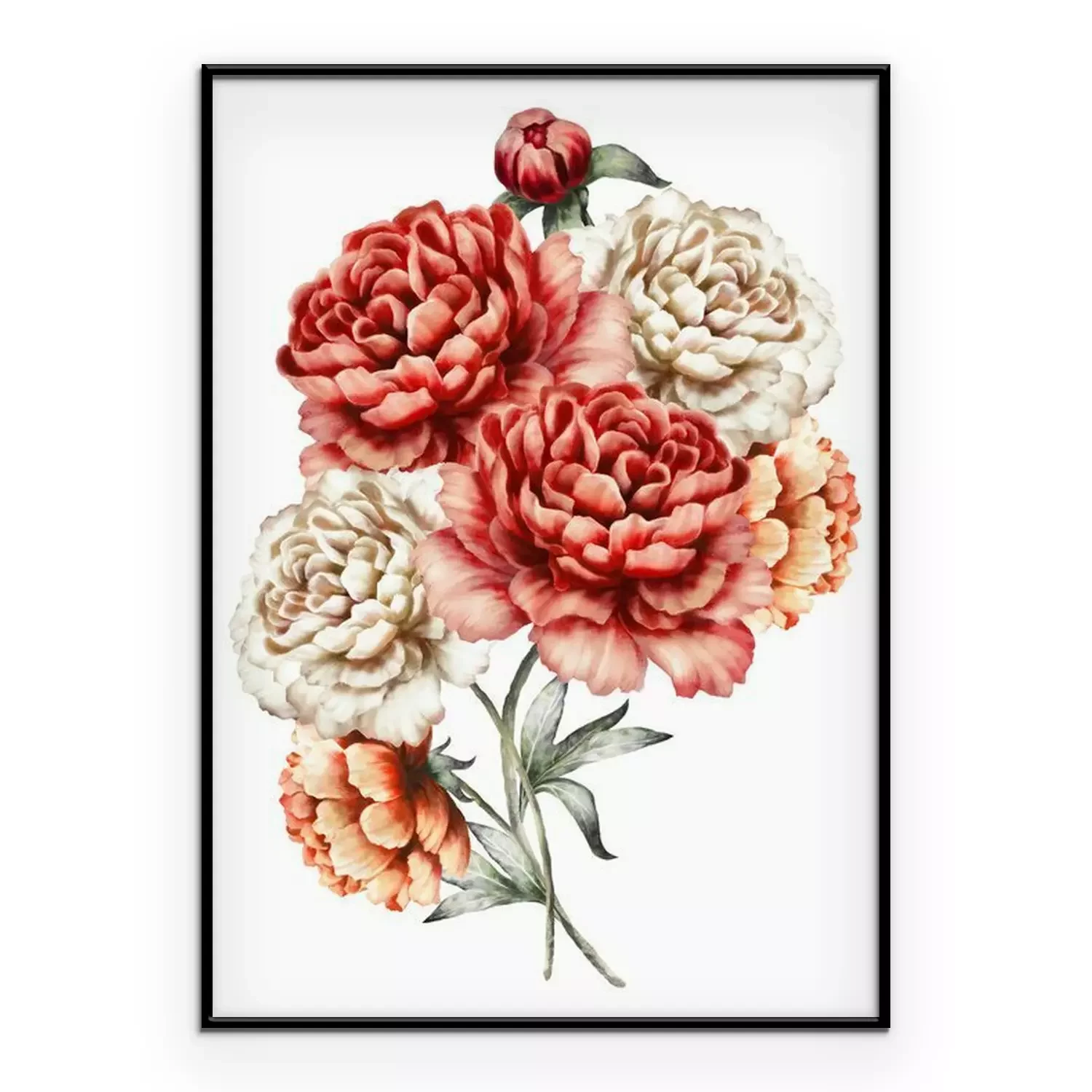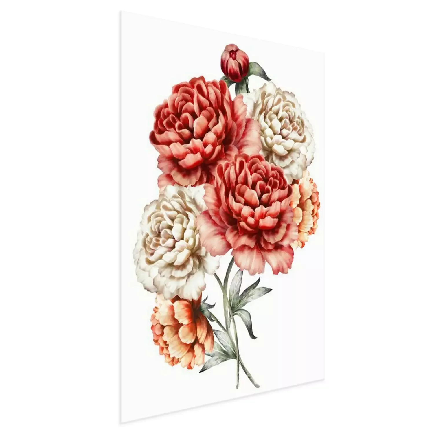 Poster  Pivoines rouges. Fleurs d'aquarelle. Illustration florale dans des couleurs en pastel. Bouquet de fleurs isolé sur fond blanc. Feuilles et bourgeons. Composition romantique pour le mariage ou la carte