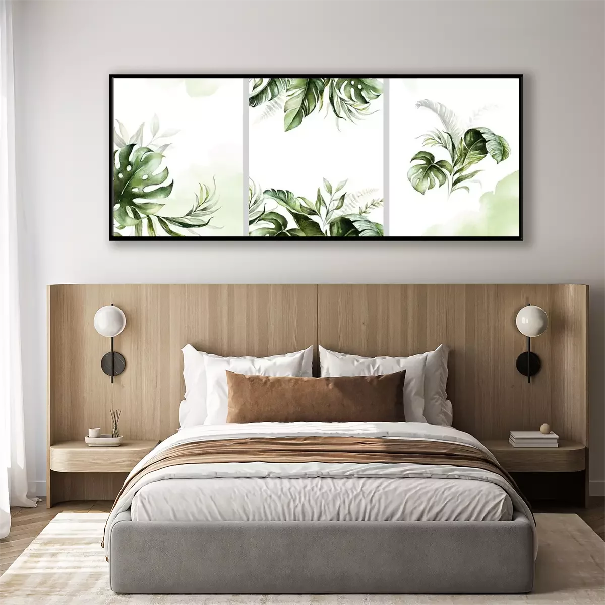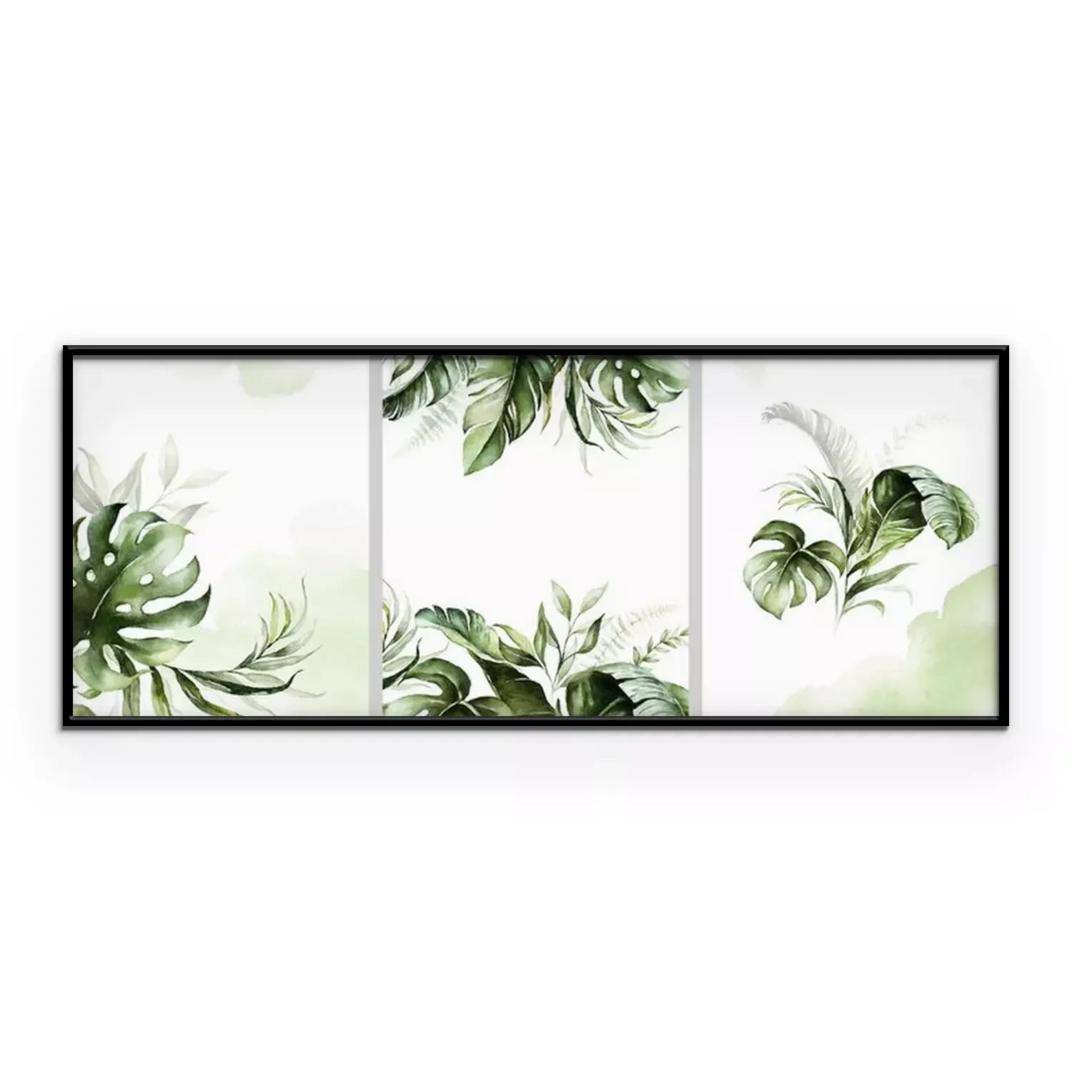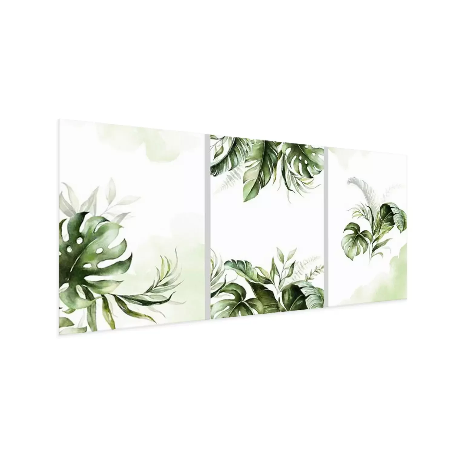 Green tropical leaves on white background. Watercolor hand painted seamless border. Floral tropic illustration. Jungle foliage pattern.