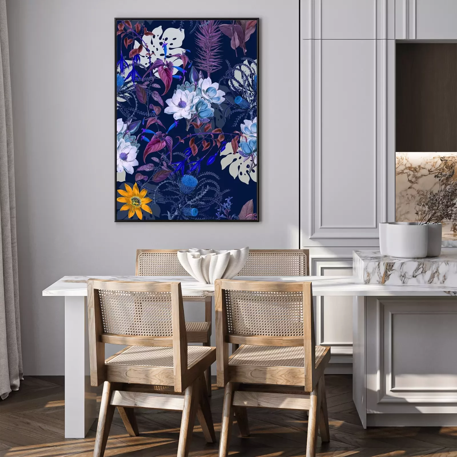 Un thème élégant avec des fleurs et de la peinture bleue