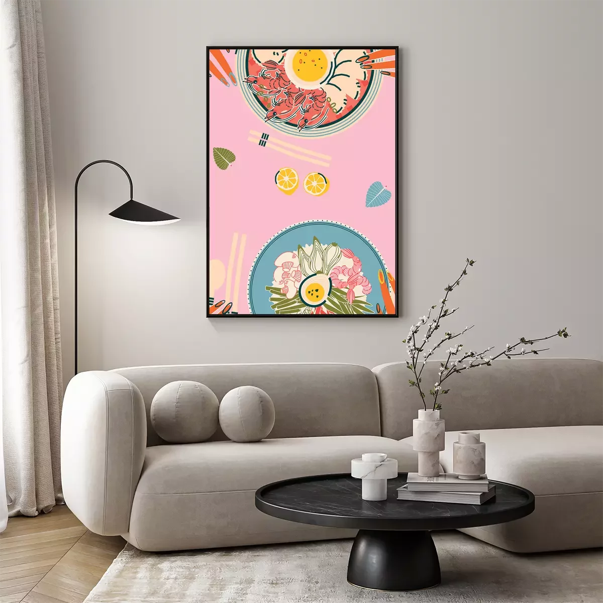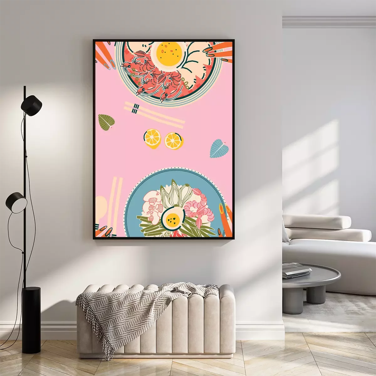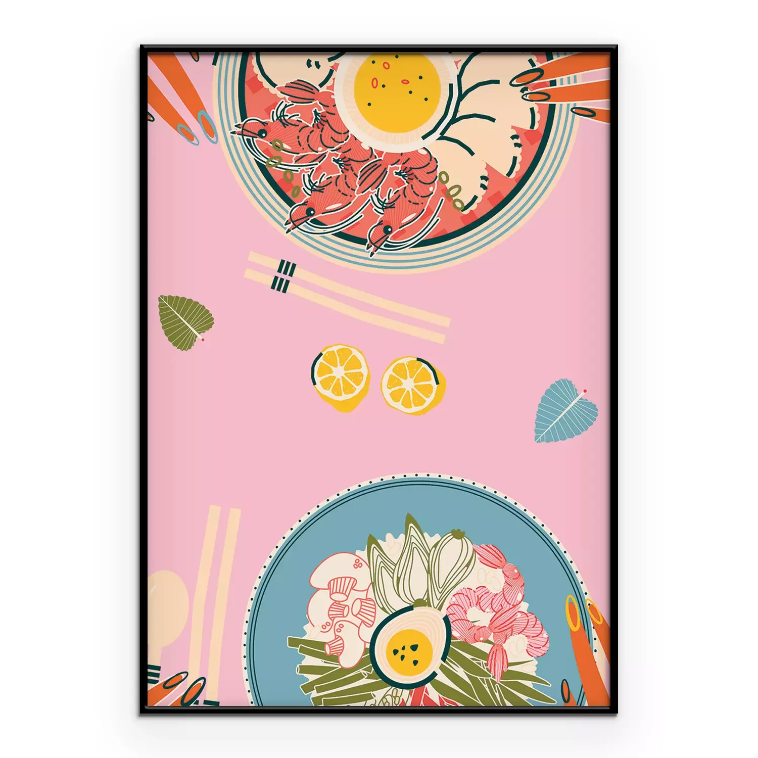 Poster : Plats de cuisine asiatique sur fond rose graphique