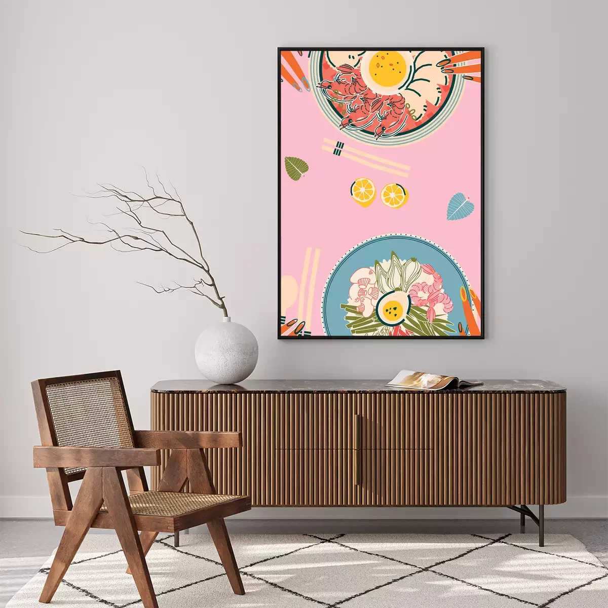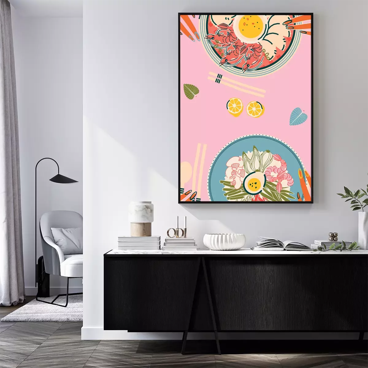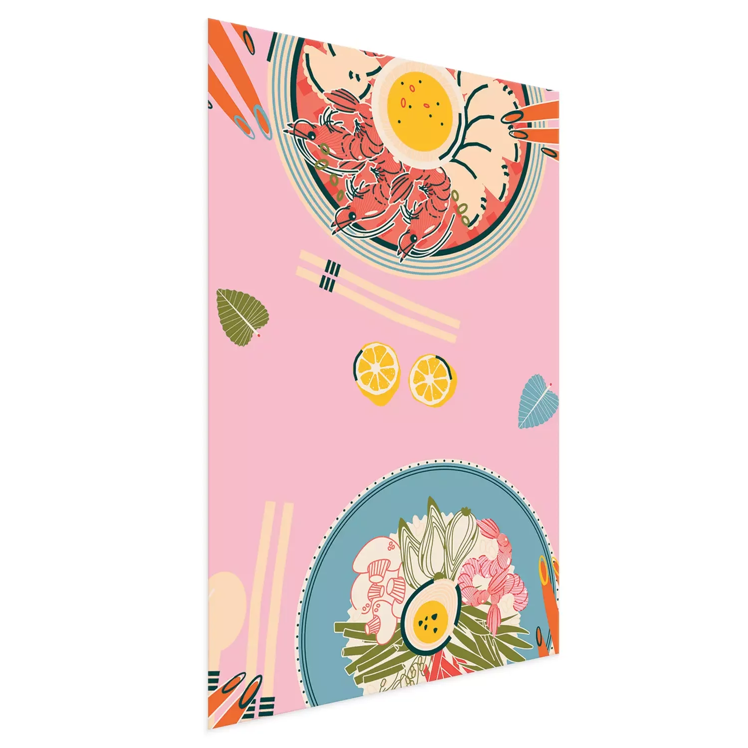 Poster : Plats de cuisine asiatique sur fond rose graphique