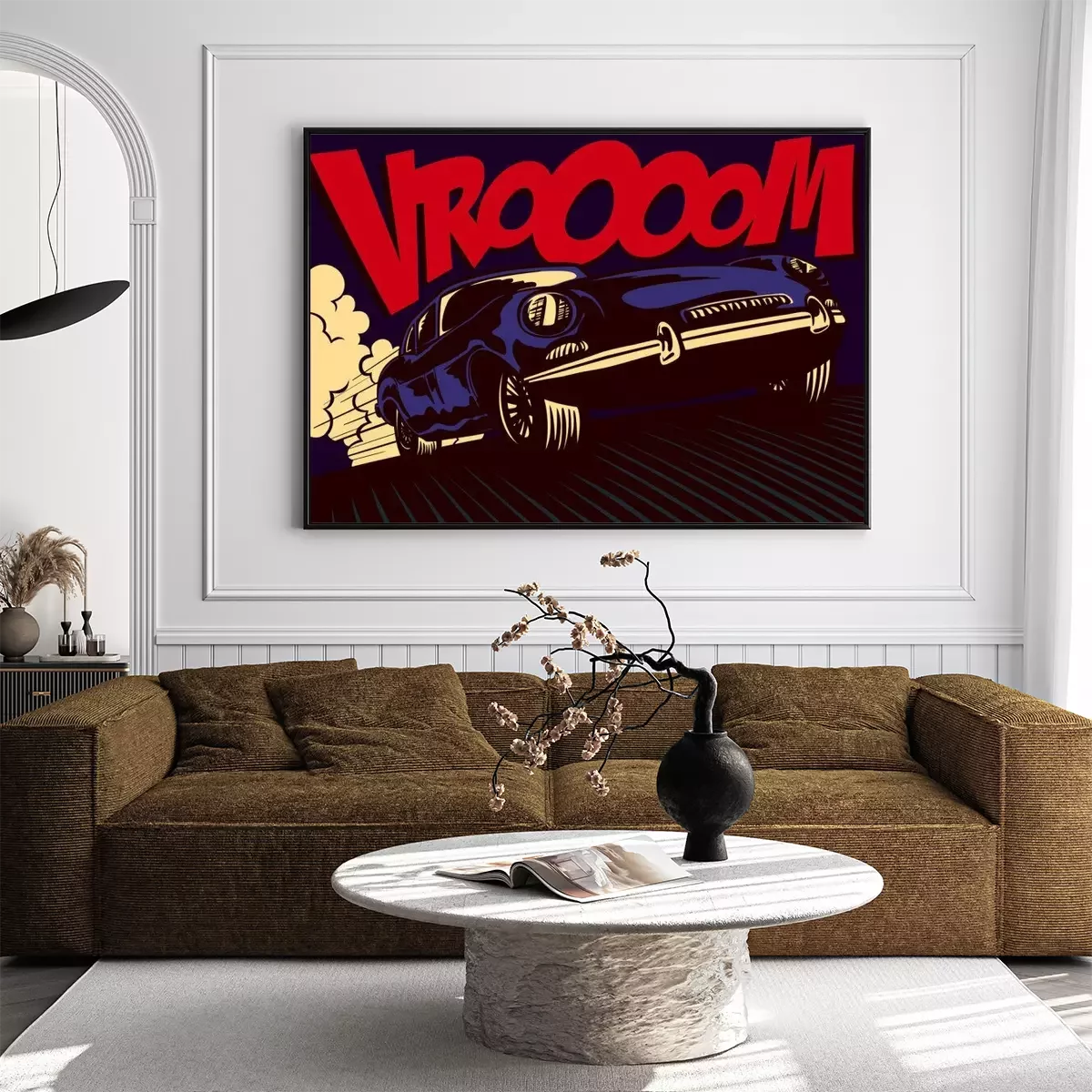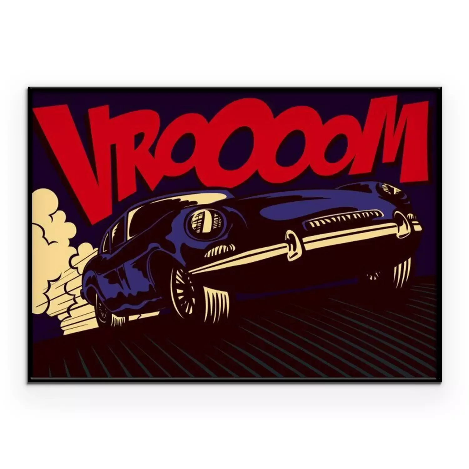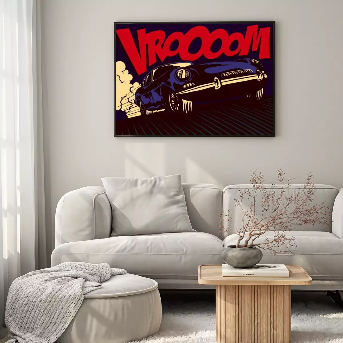 Poster  Pop art bande dessinée style voiture de sport rapide conduite à pleine vitesse avec vrooom onomatopée vector illustration affiche design