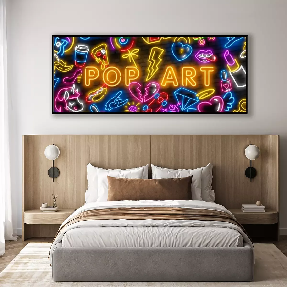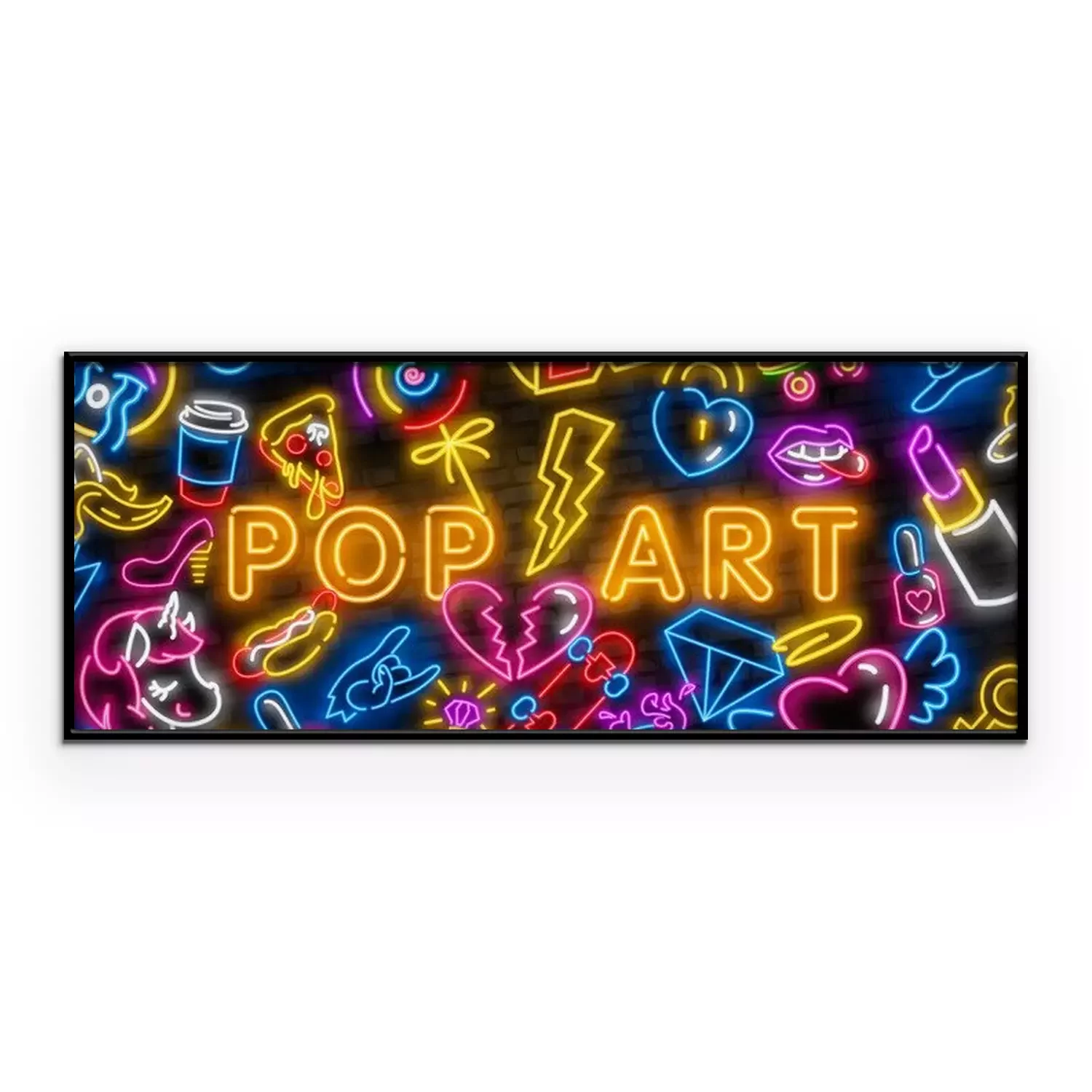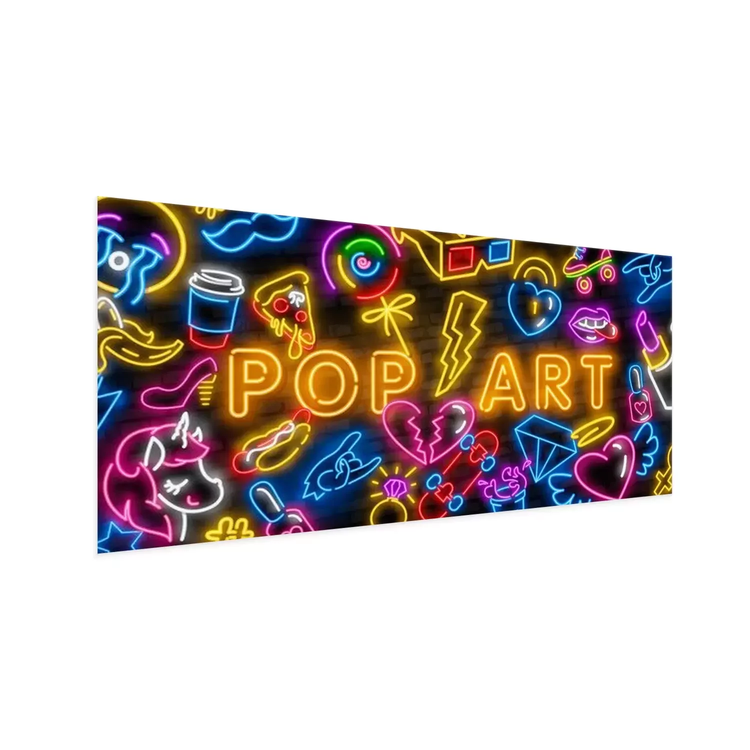 Poster : Pop art icons set. Pop art neon sign. Bright signboard, light banner. Neon isolated icon, emblem. Heart, diamond, pizza, smile, hand, ice cream, star, donut and unicorn vector neon icon