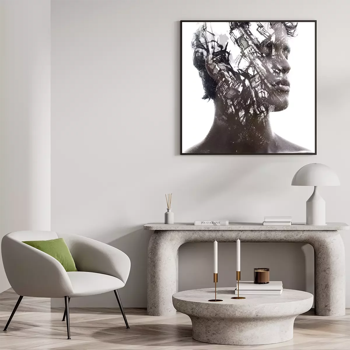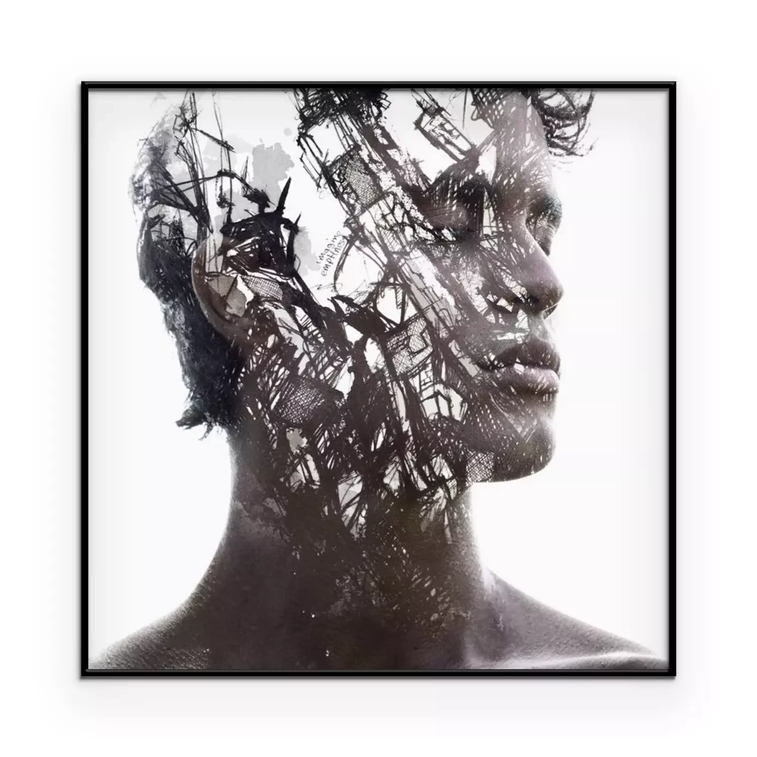 Paintography. Double exposure of a shirtless male model combined with handmade pen drawing of birds flying away and disintegrating, black and white