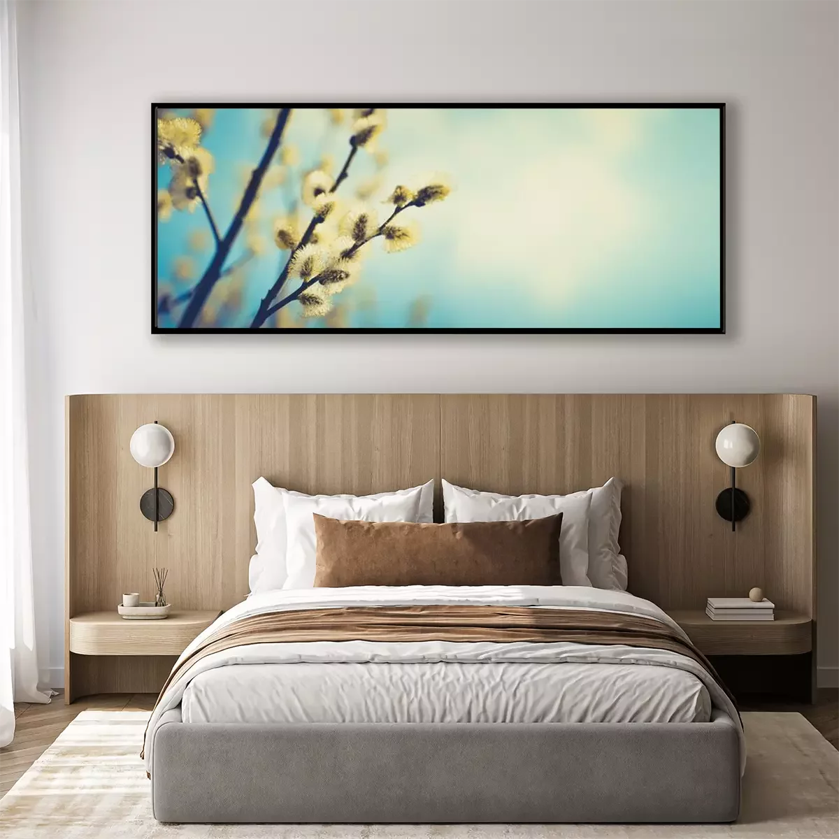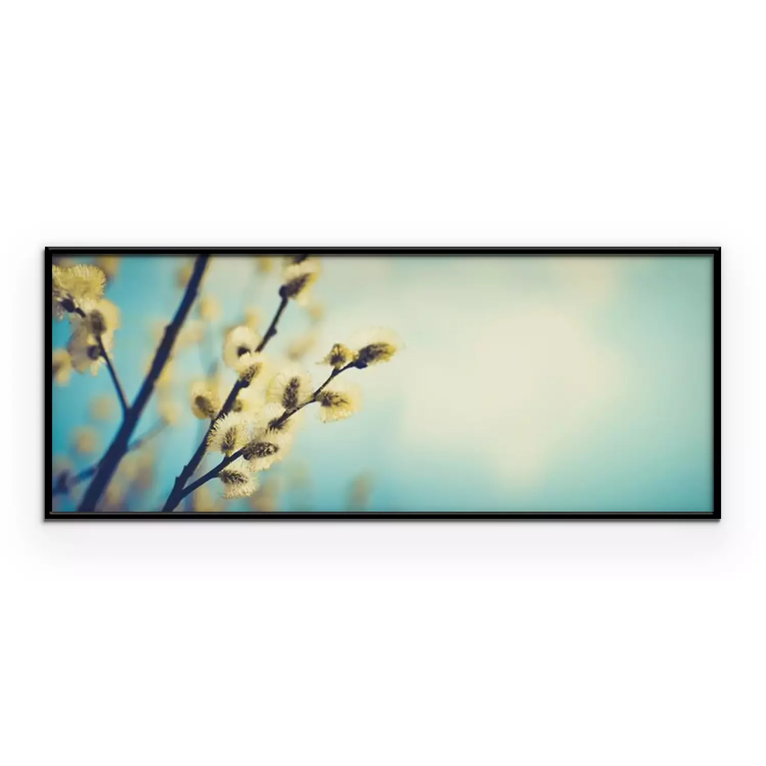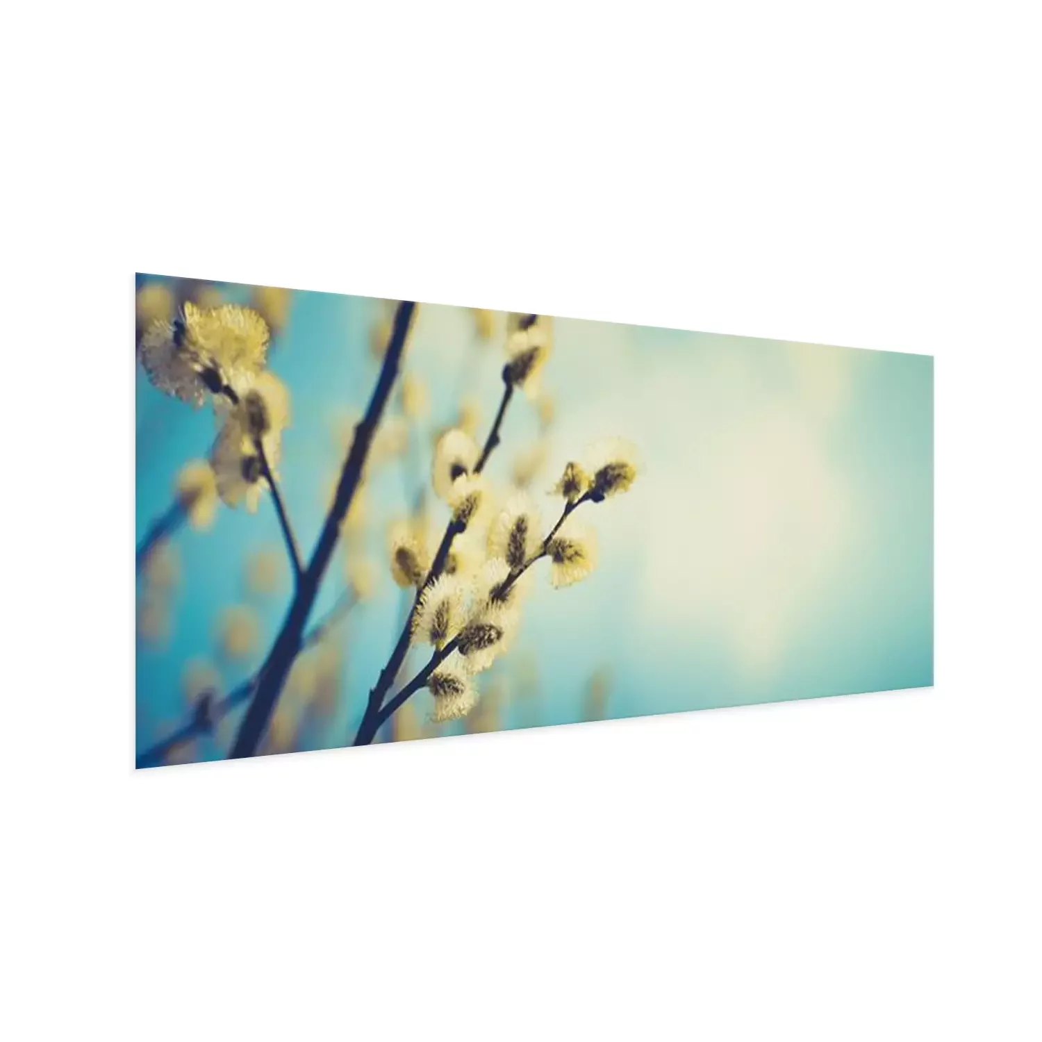 Defocused spring landscape. Beautiful nature with flowering willow branches and  rural road against blue sky and bright sunlight, soft focus. Ultra wide format.