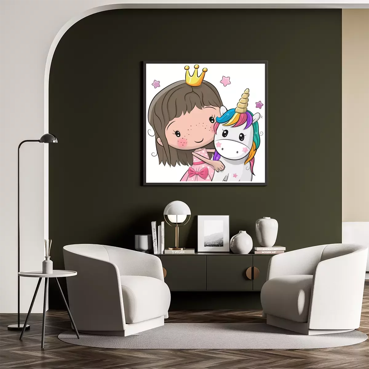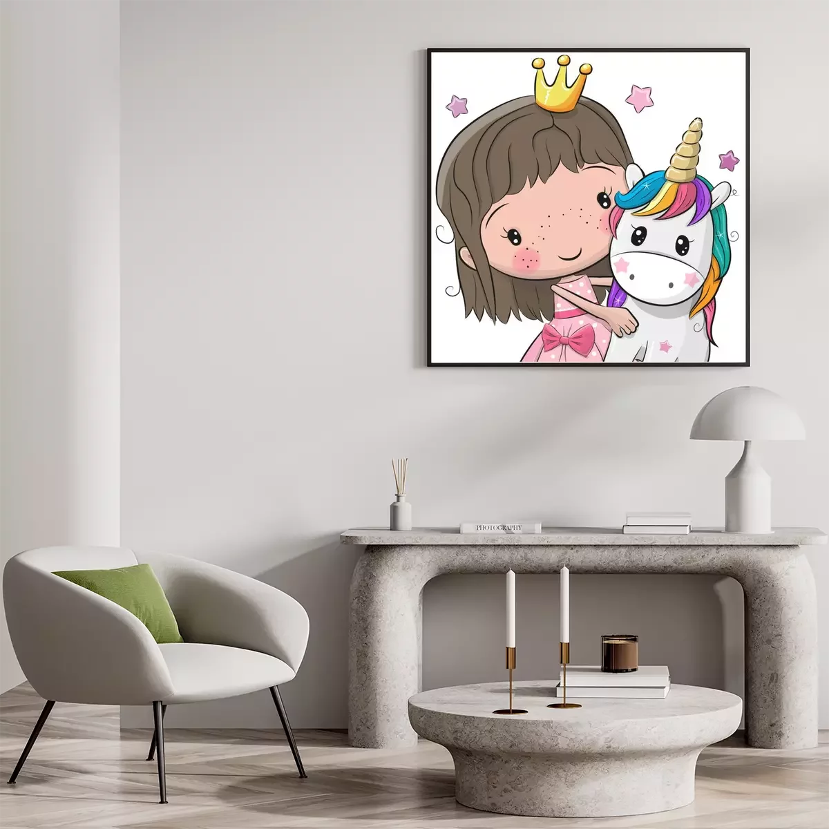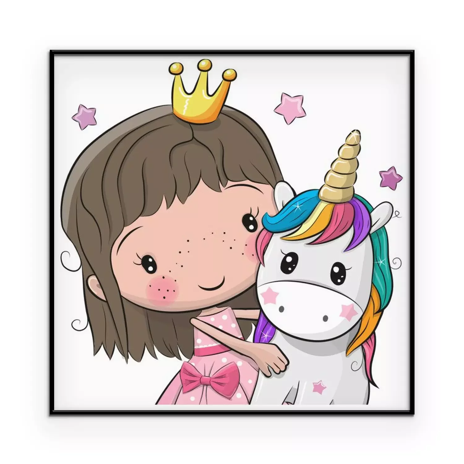 Une princesse et une licorne sur fond d'arc-en-ciel multicolore