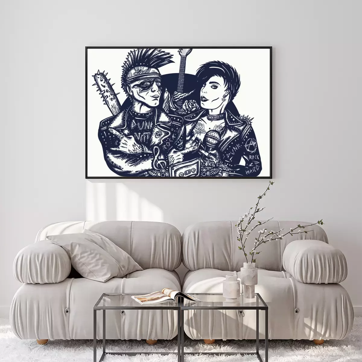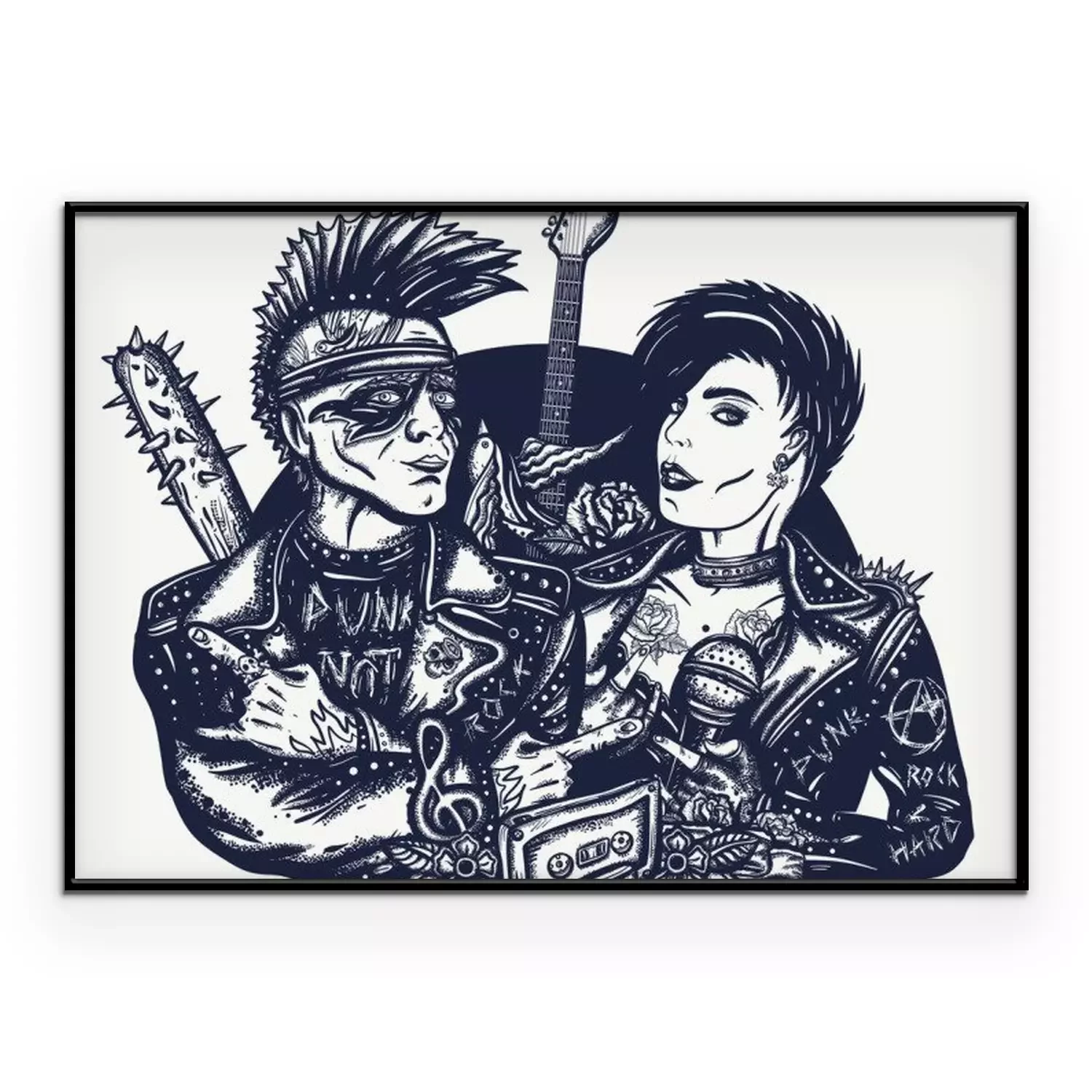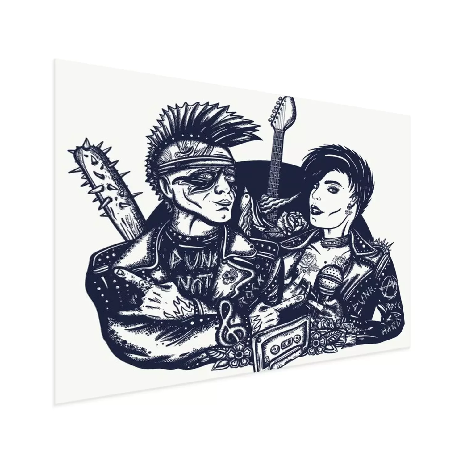 Poster : Punk music. Musicians and electric guitar. Street music culture. Tattoo and t-shirt design. Punker with mohawk hairstyle, guitarist. Anarchy art. Rock and roll couple. Hooligans lifestyle