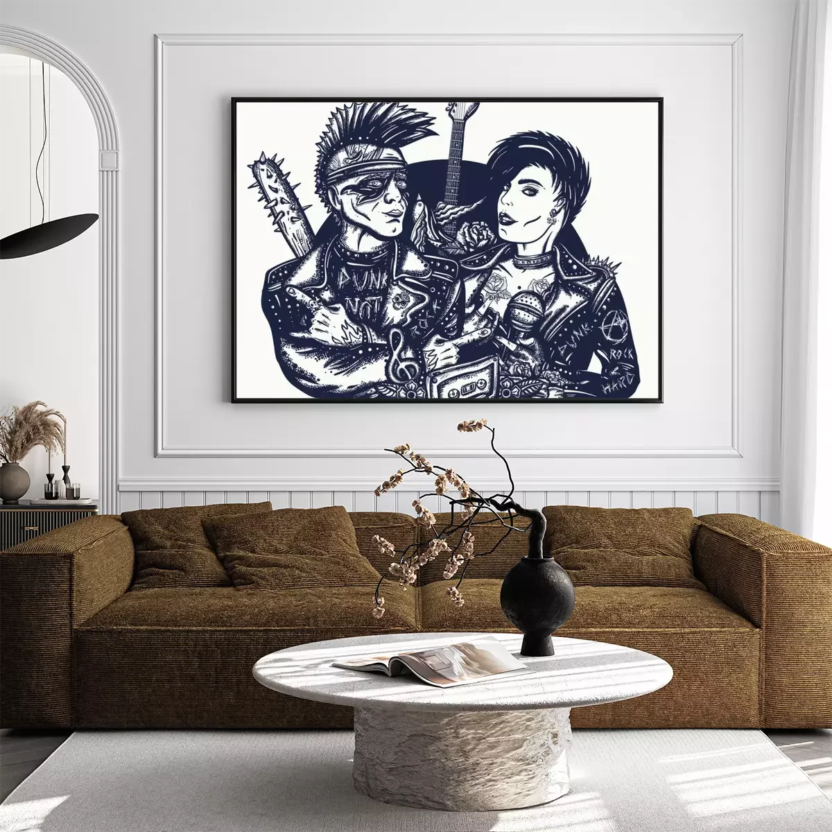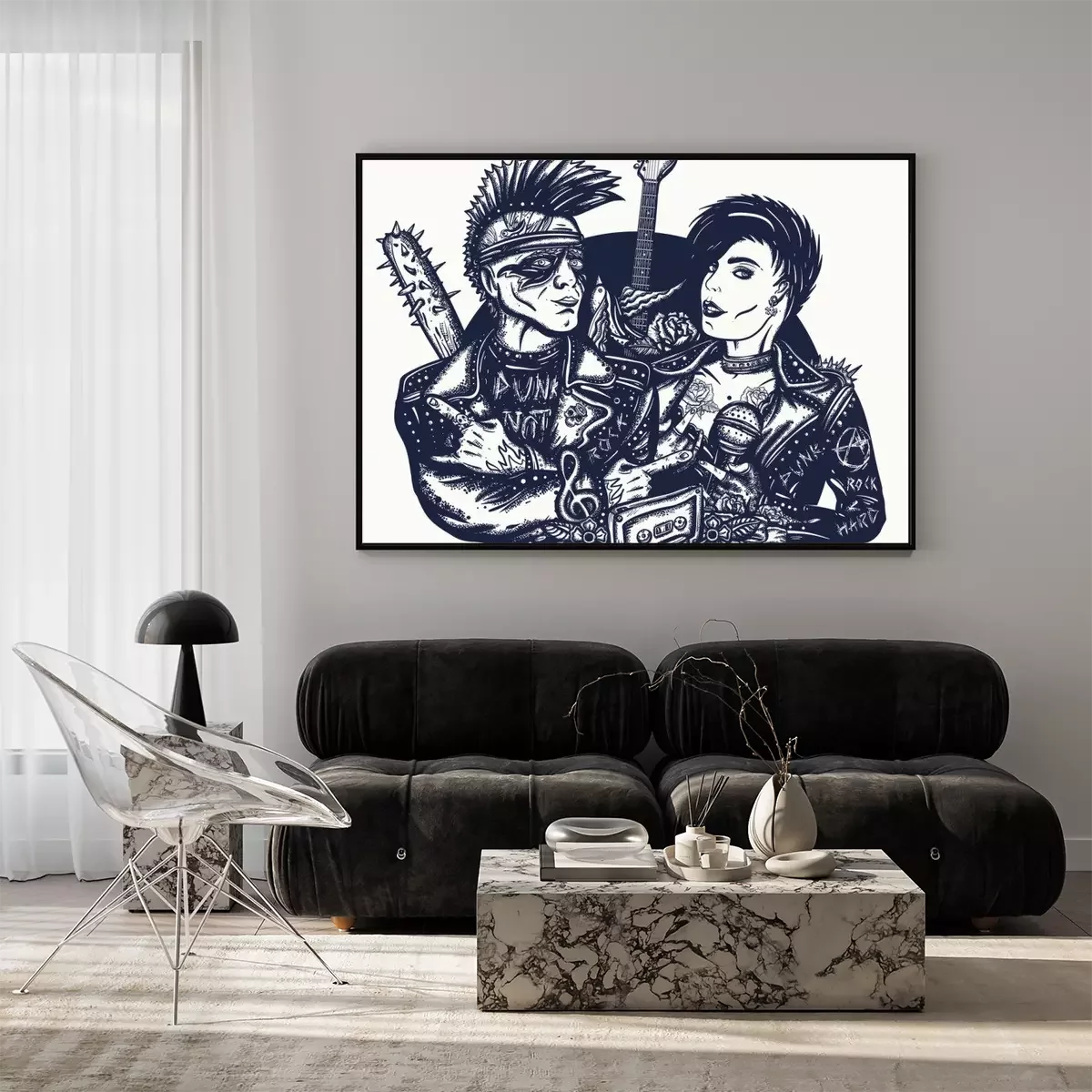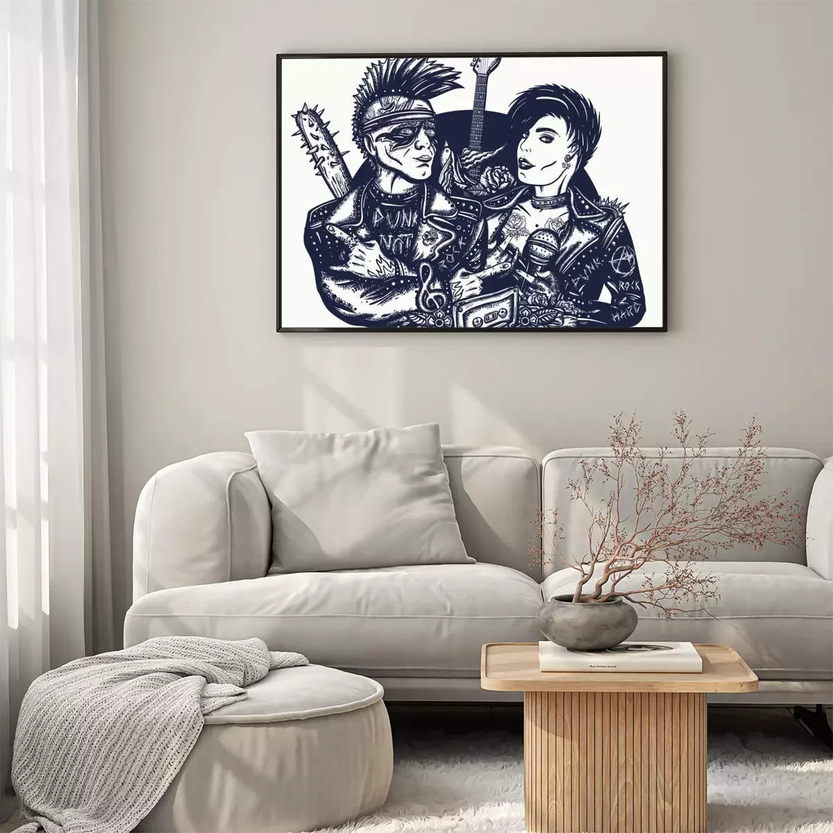 Poster : Punk music. Musicians and electric guitar. Street music culture. Tattoo and t-shirt design. Punker with mohawk hairstyle, guitarist. Anarchy art. Rock and roll couple. Hooligans lifestyle