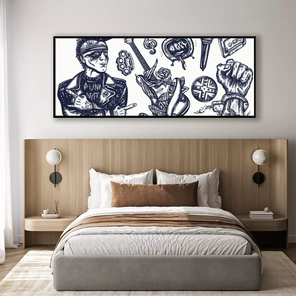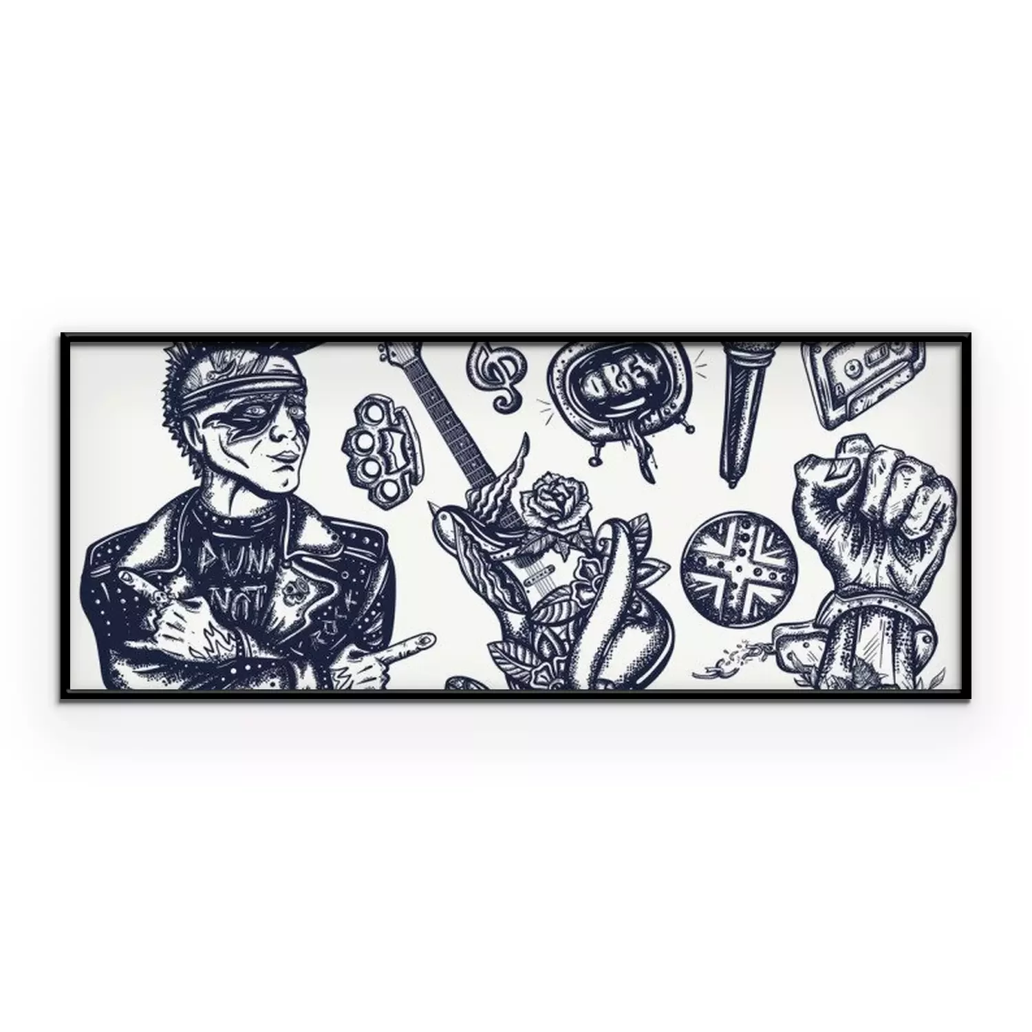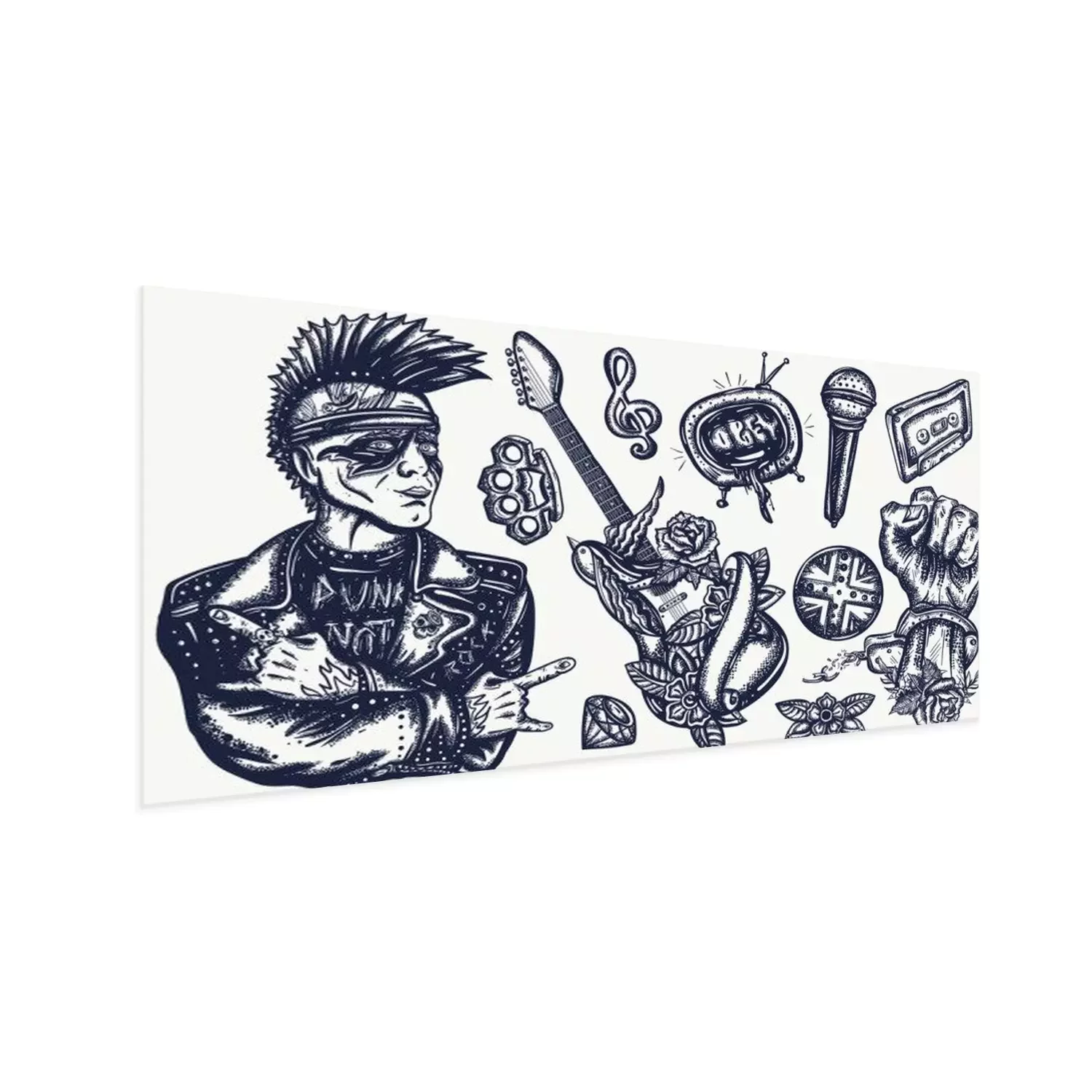Poster : Punk music set. Tattoo vector collection. Punker with mohawk hairstyle, hard rock man. Hooligans lifestyle. Electric guitar. Anarchy art. Traditional tattooing elements