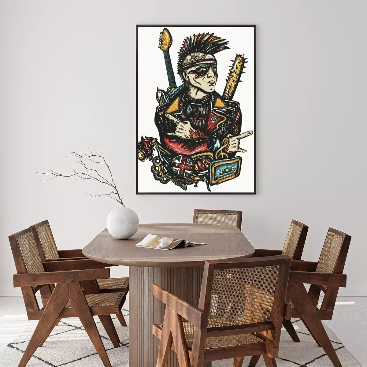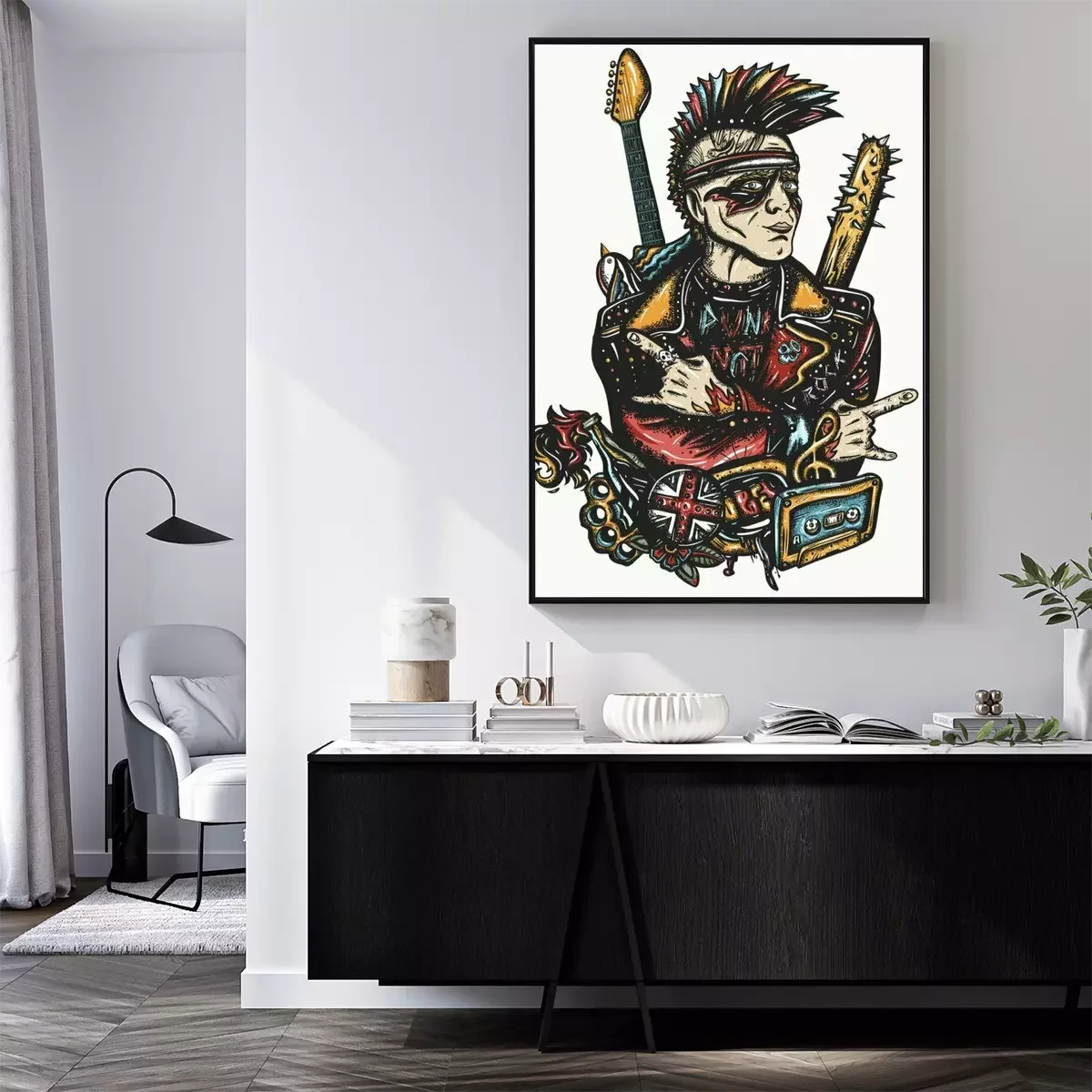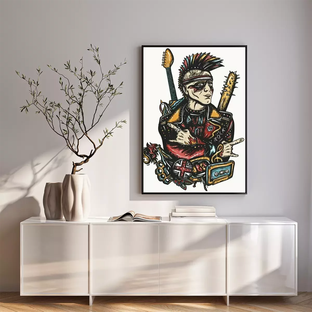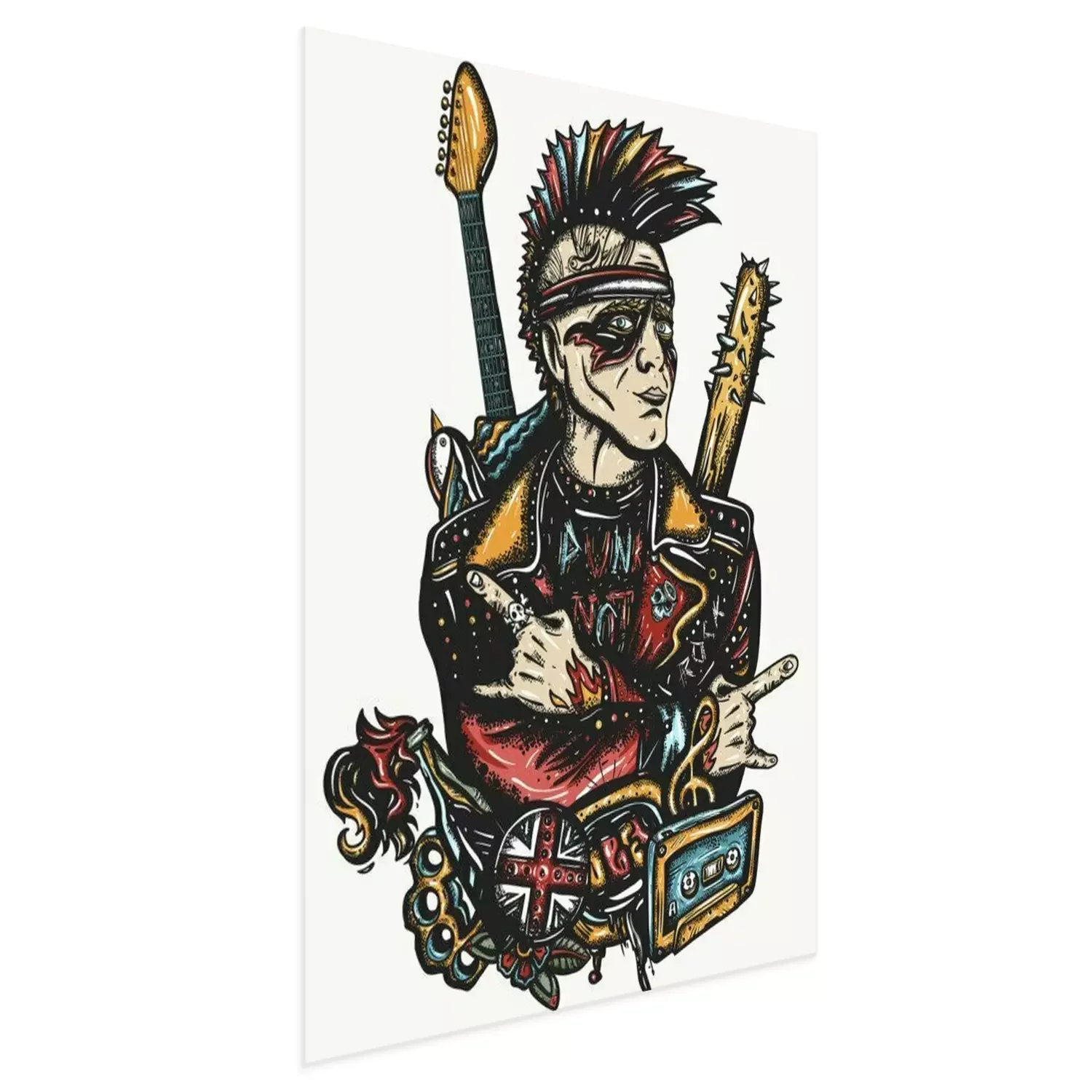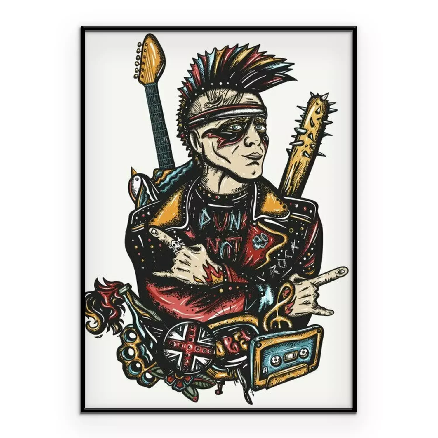 Poster : Punk rock. Street music culture. Tattoo and t-shirt design. Punker with mohawk hairstyle, musician and electric guitar. Guitarist. Hooligans lifestyle. Anarchy art