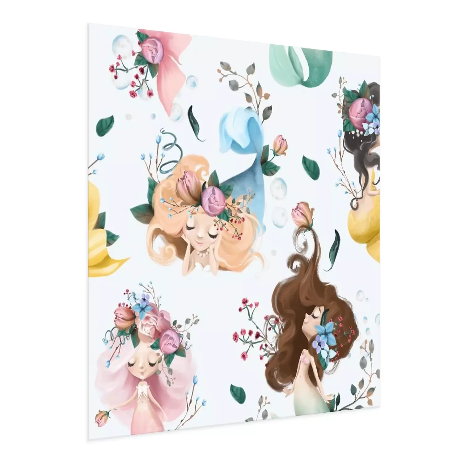 Cute and beautiful seamless pattern - little mermaids, fishes and flowers watercolor illustration