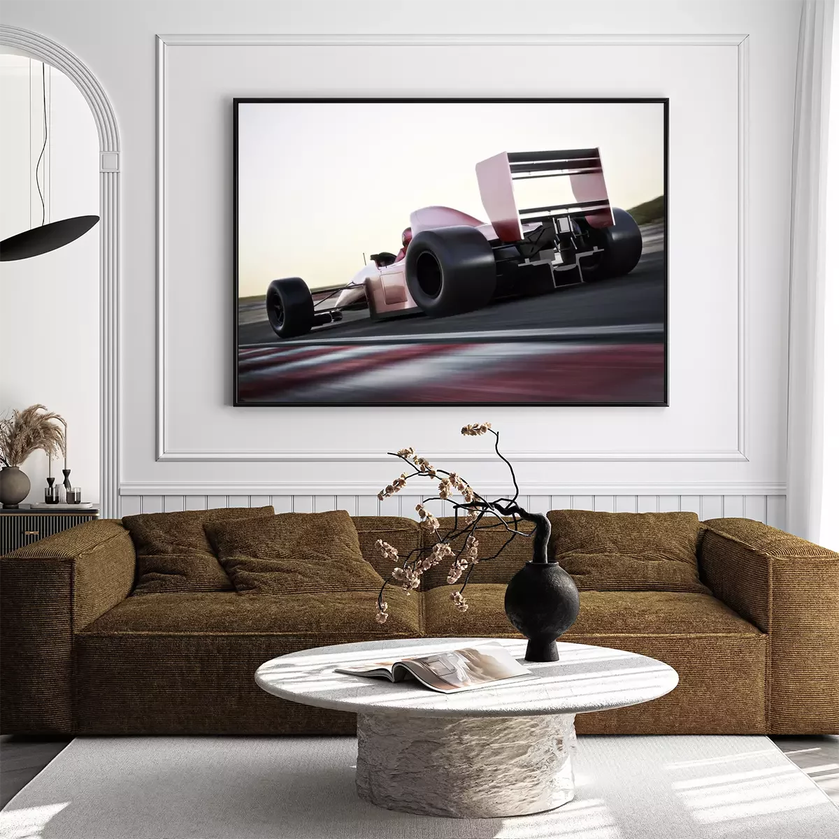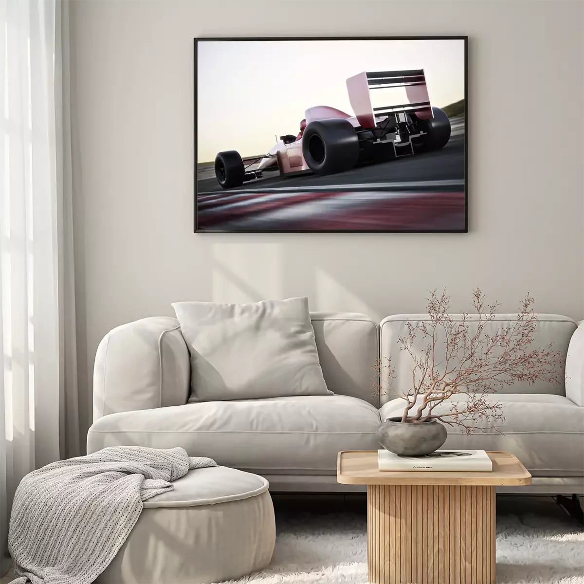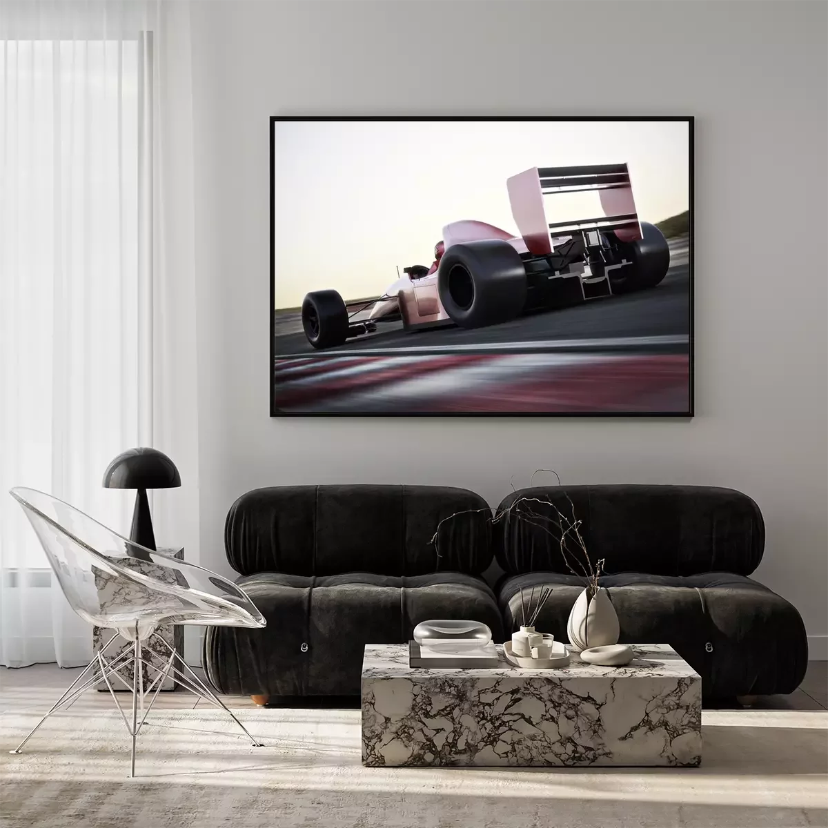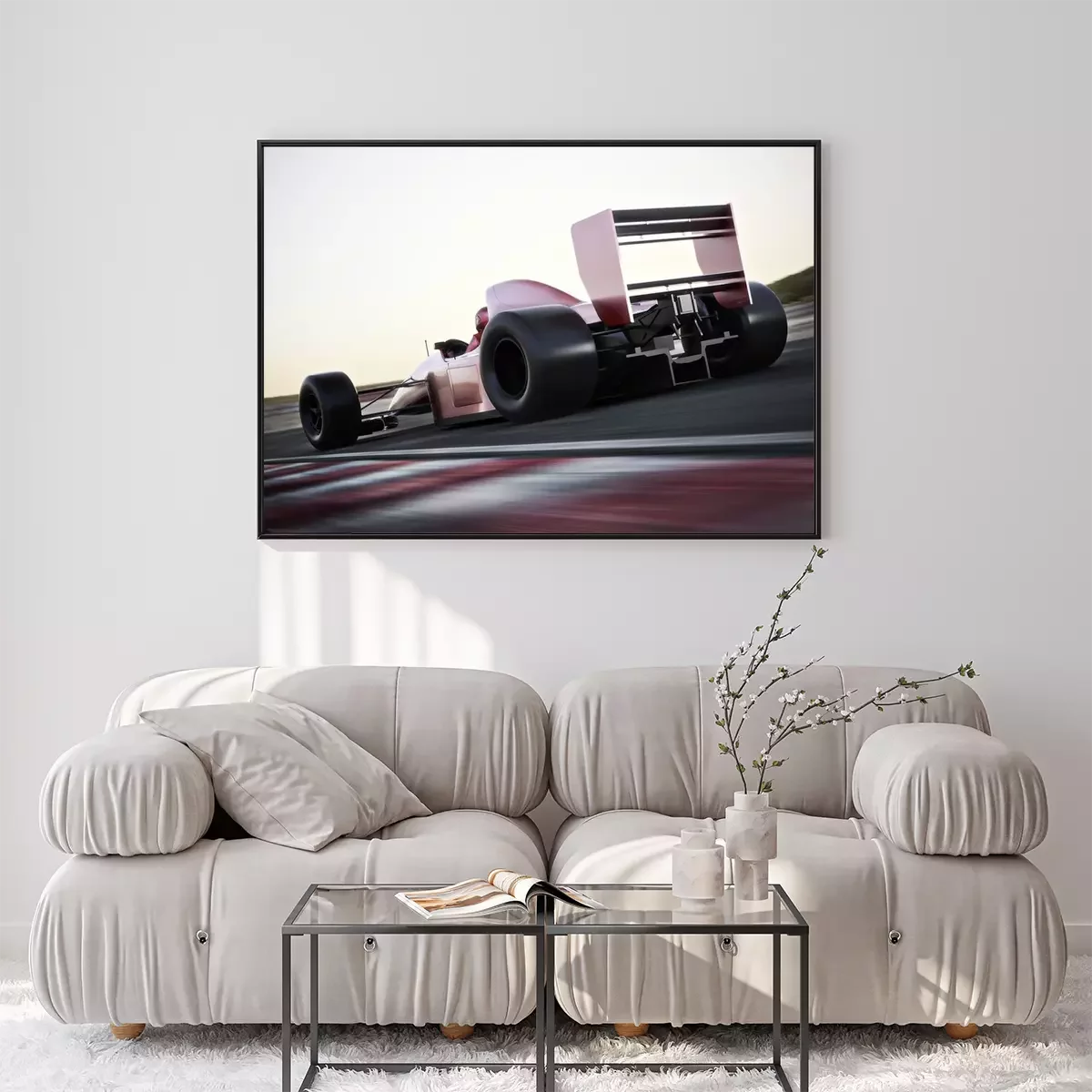 Poster : Race car back view speeding down a track with motion blur. Photo realistic 3d scene with room for text or copy space