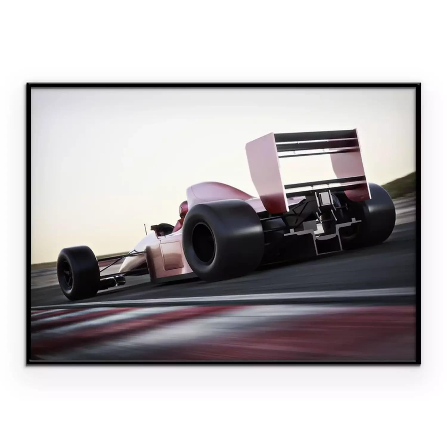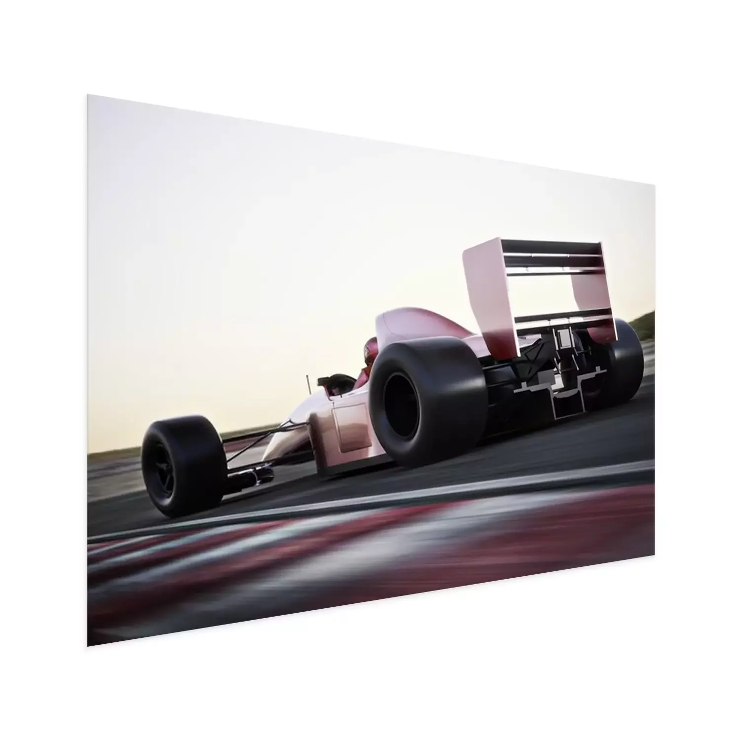 Poster  Race car back view speeding down a track with motion blur. Photo realistic 3d scene with room for text or copy space