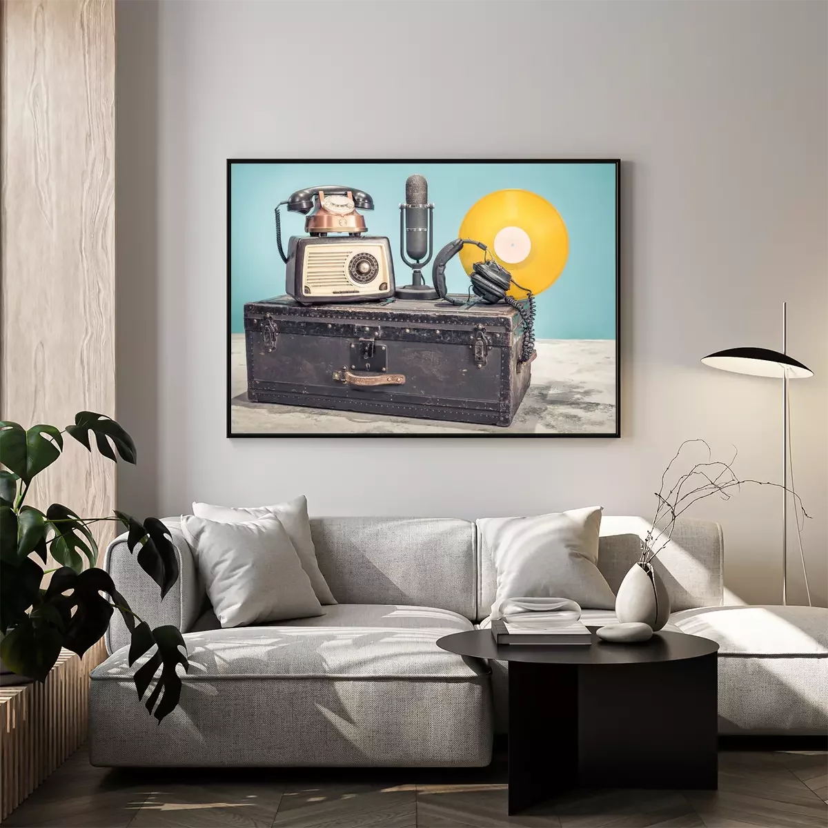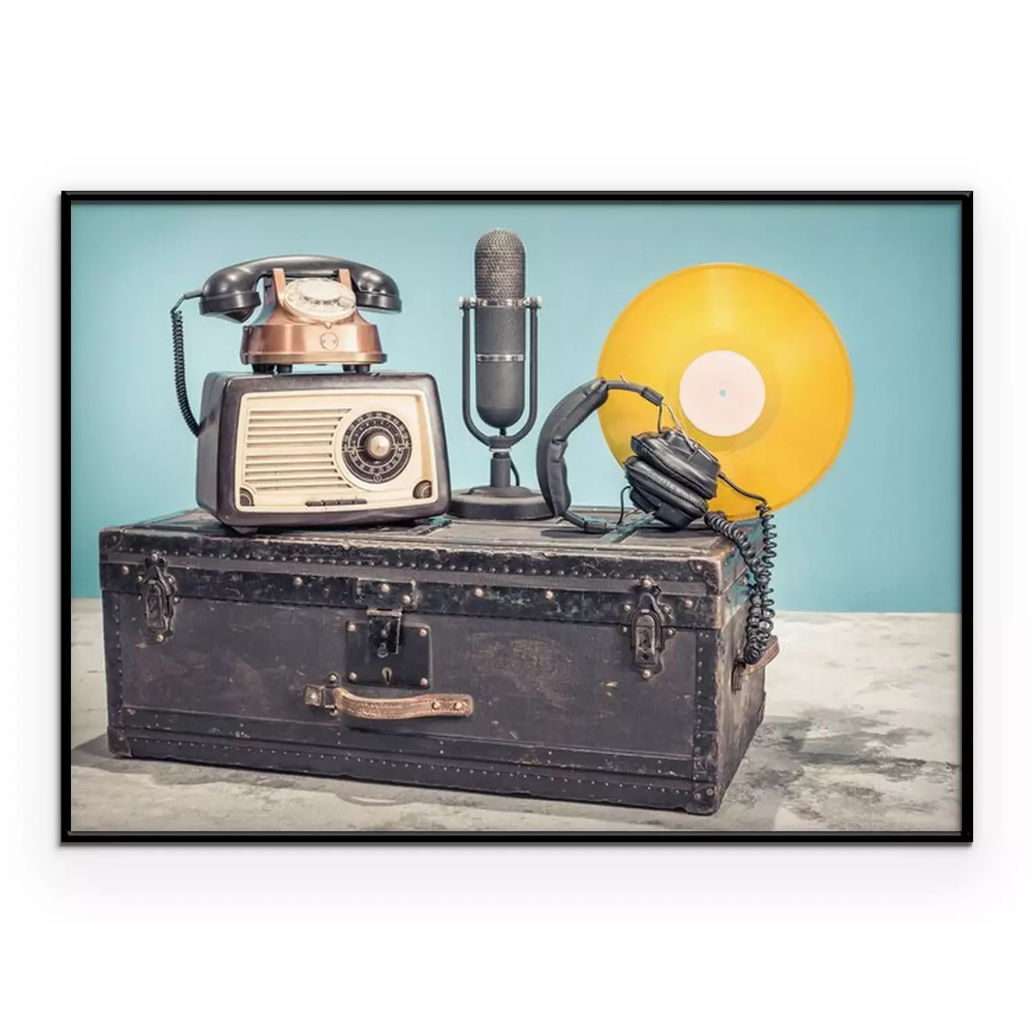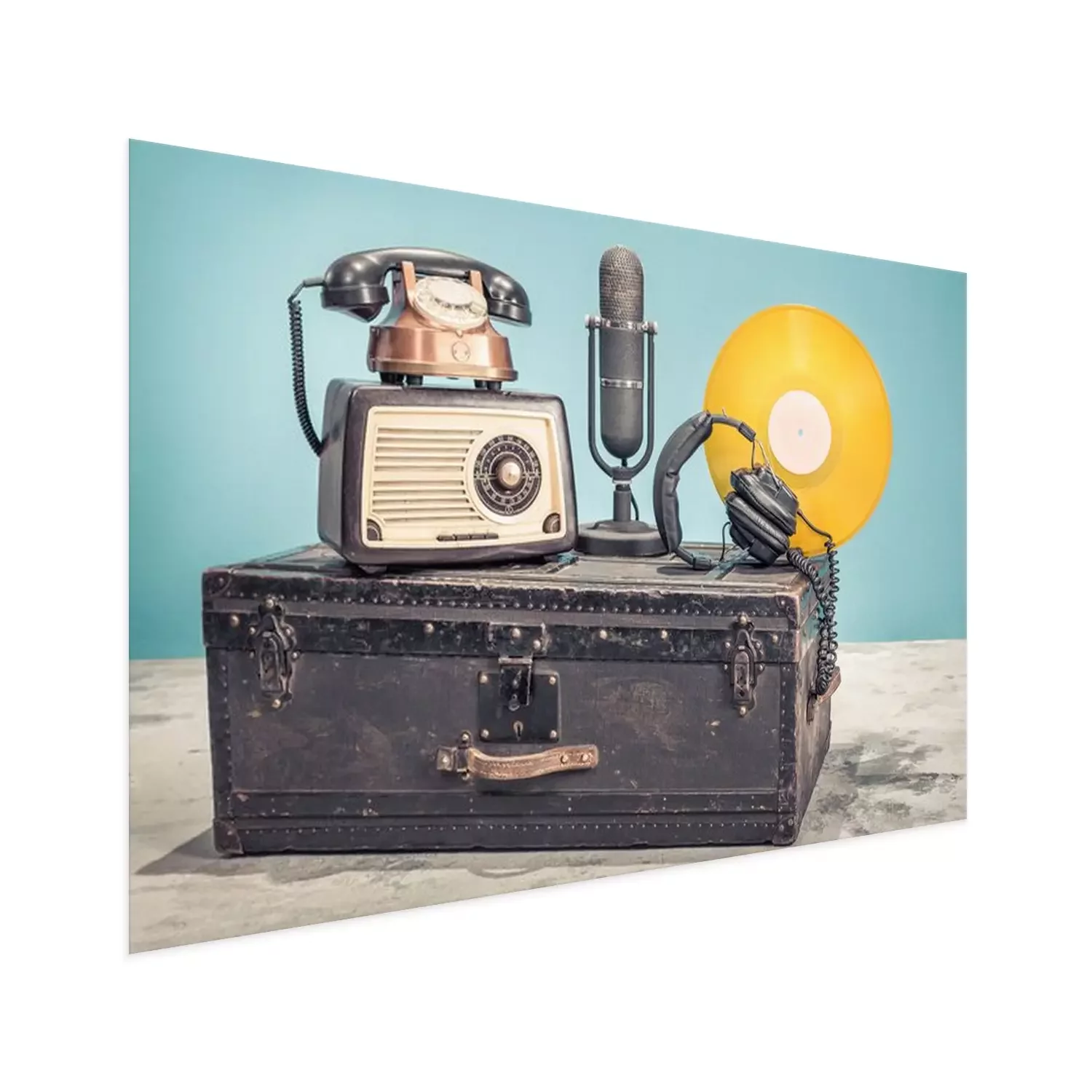 Poster  Radio rétro des années 60, vieux téléphone en cuivre, microphone de studio des années 50 et disque de disques en vinyle couleur or des années 70, écouteurs sur une malle de voyage classique. Photo fil