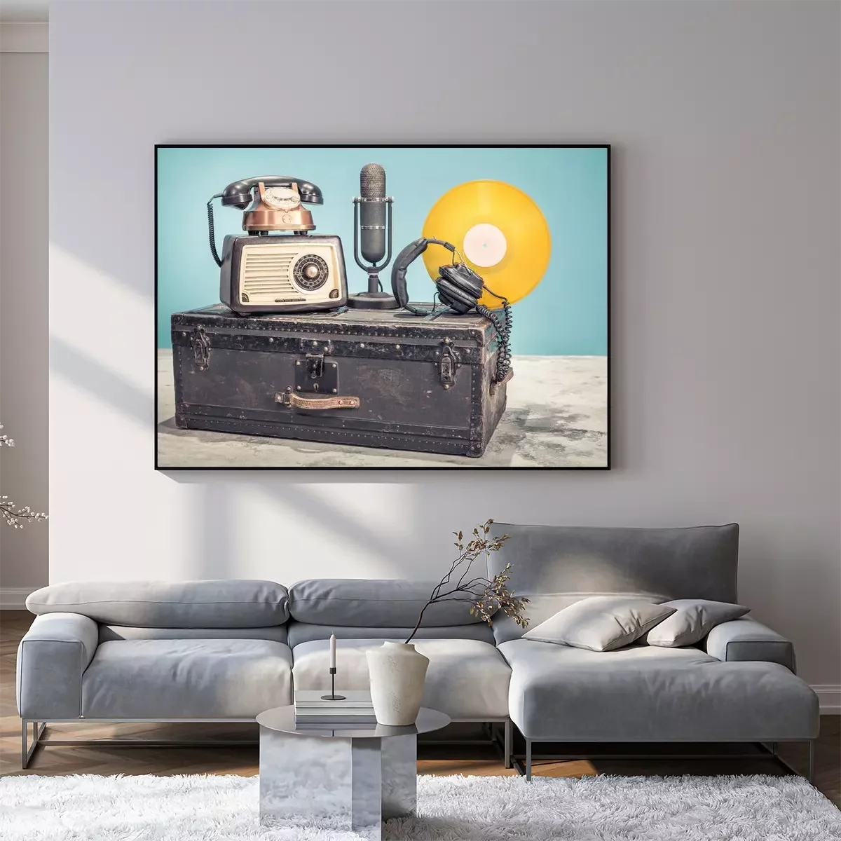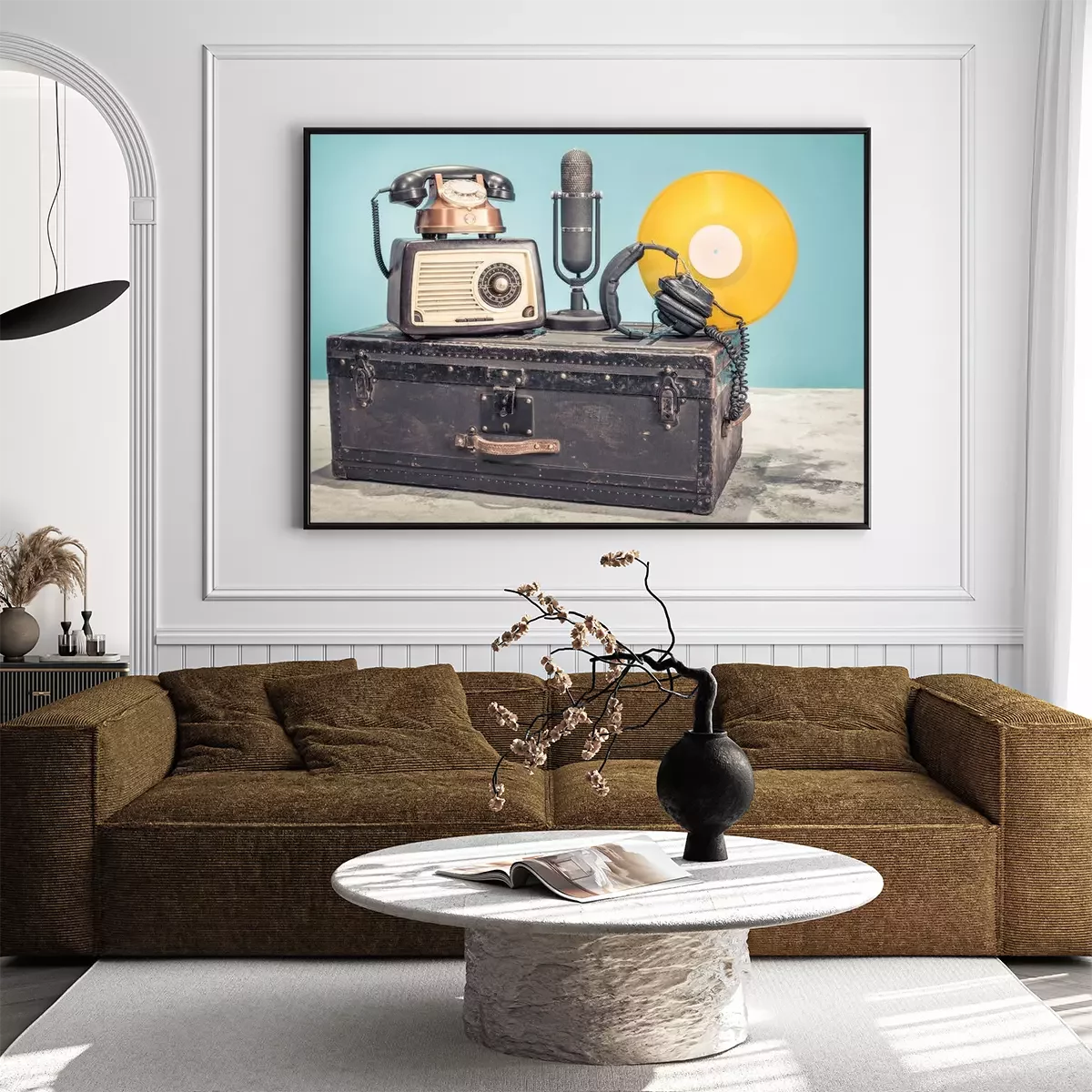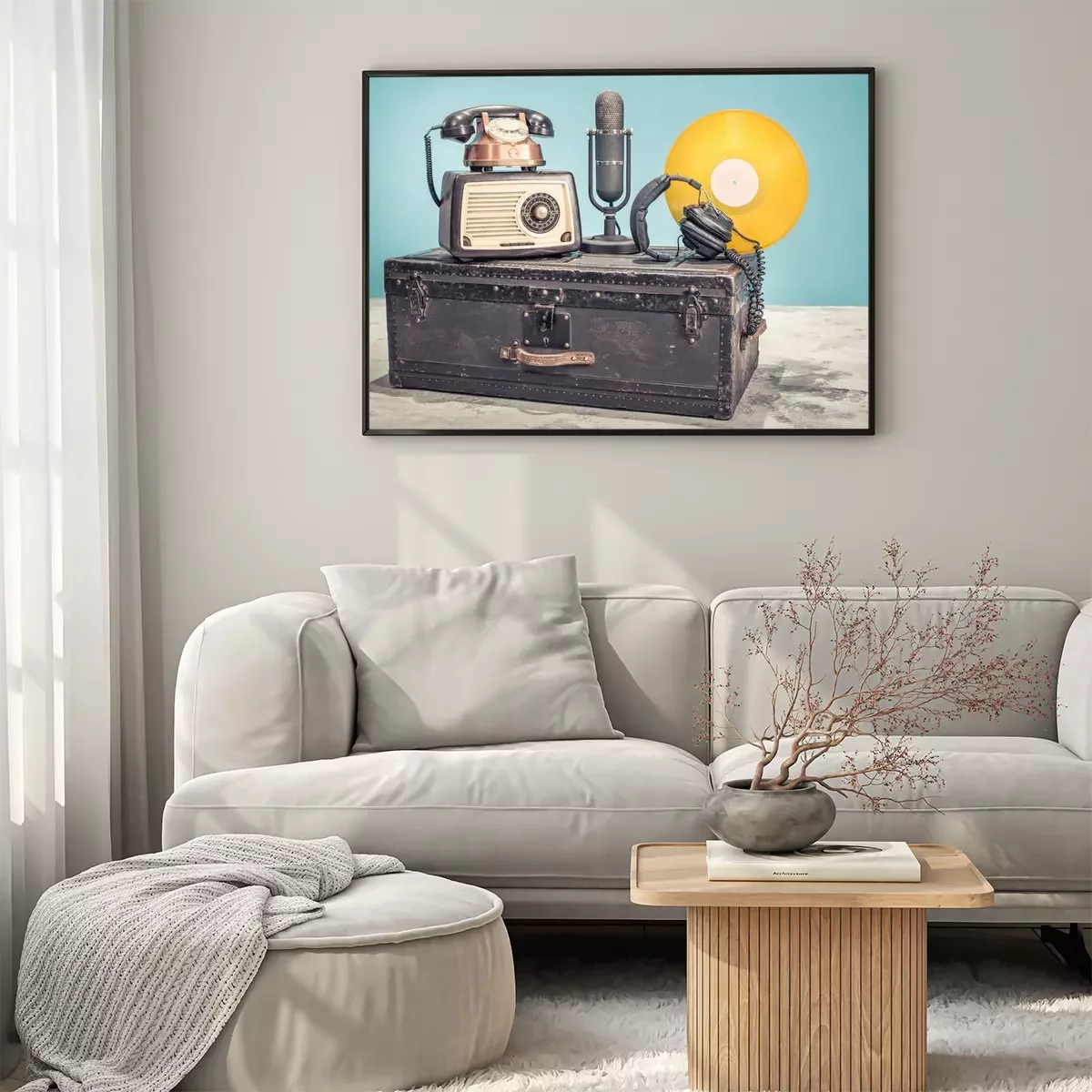 Poster  Radio rétro des années 60, vieux téléphone en cuivre, microphone de studio des années 50 et disque de disques en vinyle couleur or des années 70, écouteurs sur une malle de voyage classique. Photo fil
