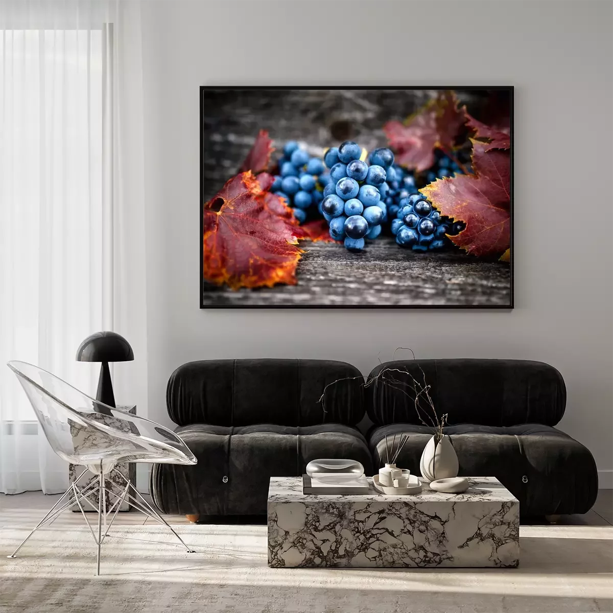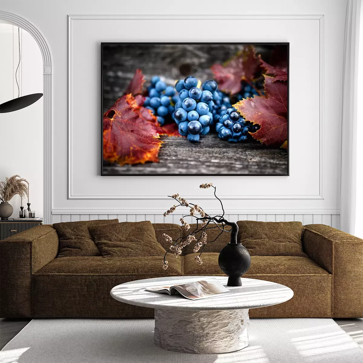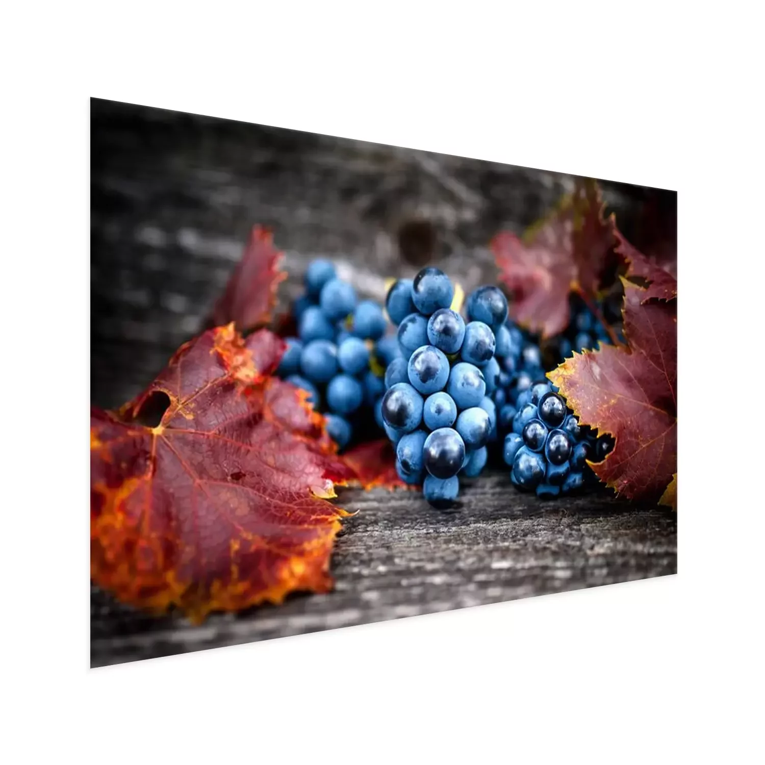 Poster  Raisins mûrs sur la récolte de l'automne au vignoble avec des feuilles