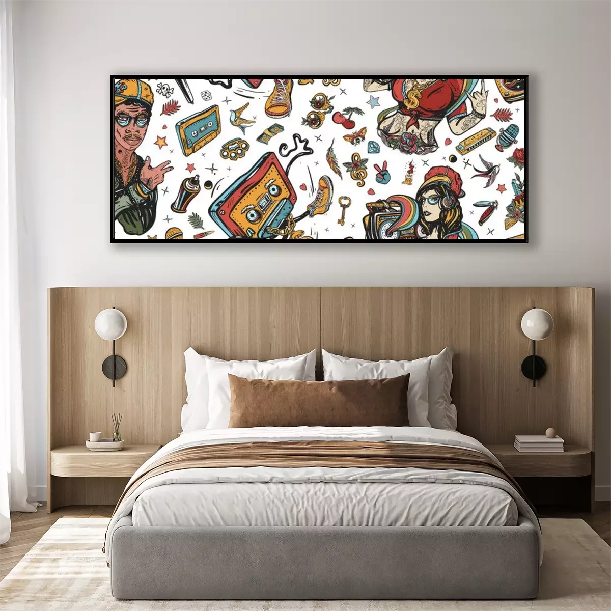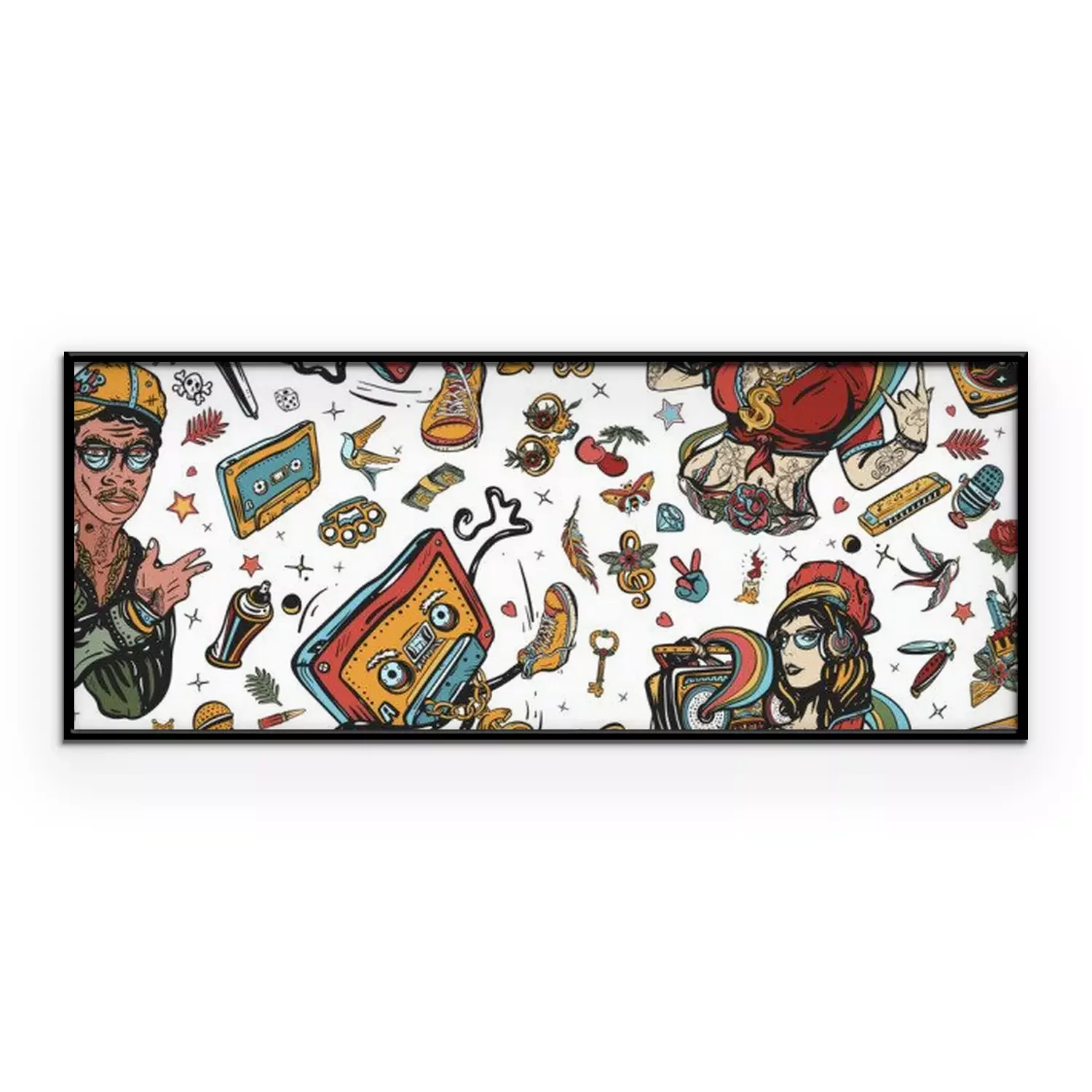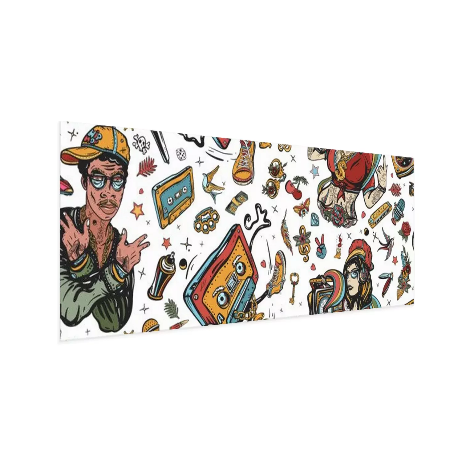 Poster : Rap music seamless pattern. Old school tattoo style. Hip hop girl, swag woman. African American man rapper. Audio cassette, break dance art. Street ghetto lifestyle. Pop culture musical background