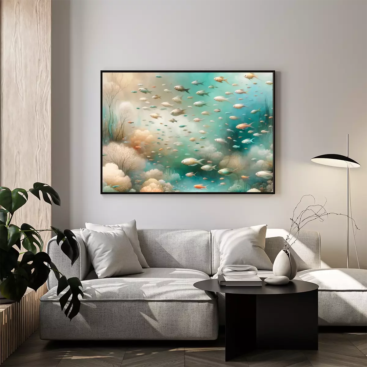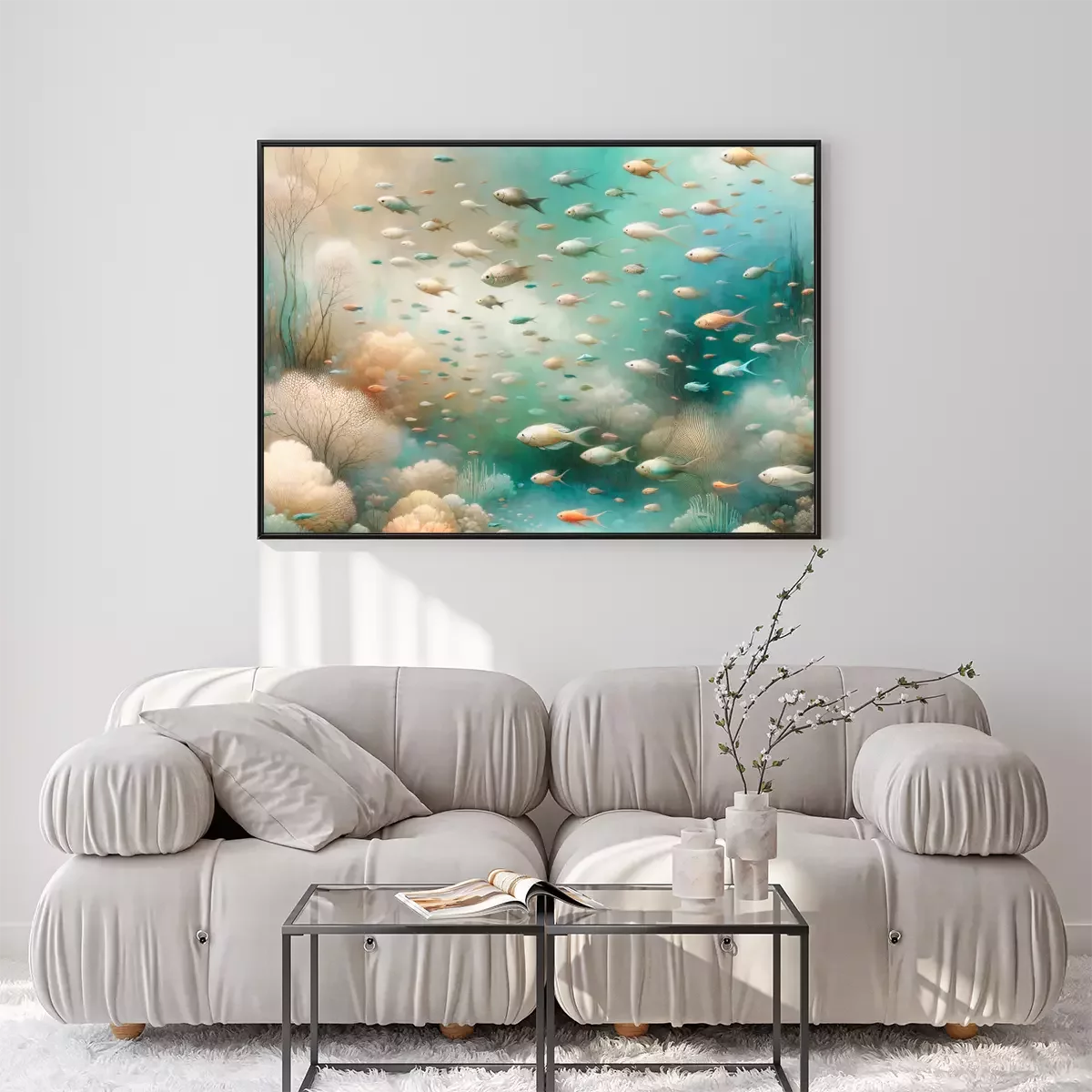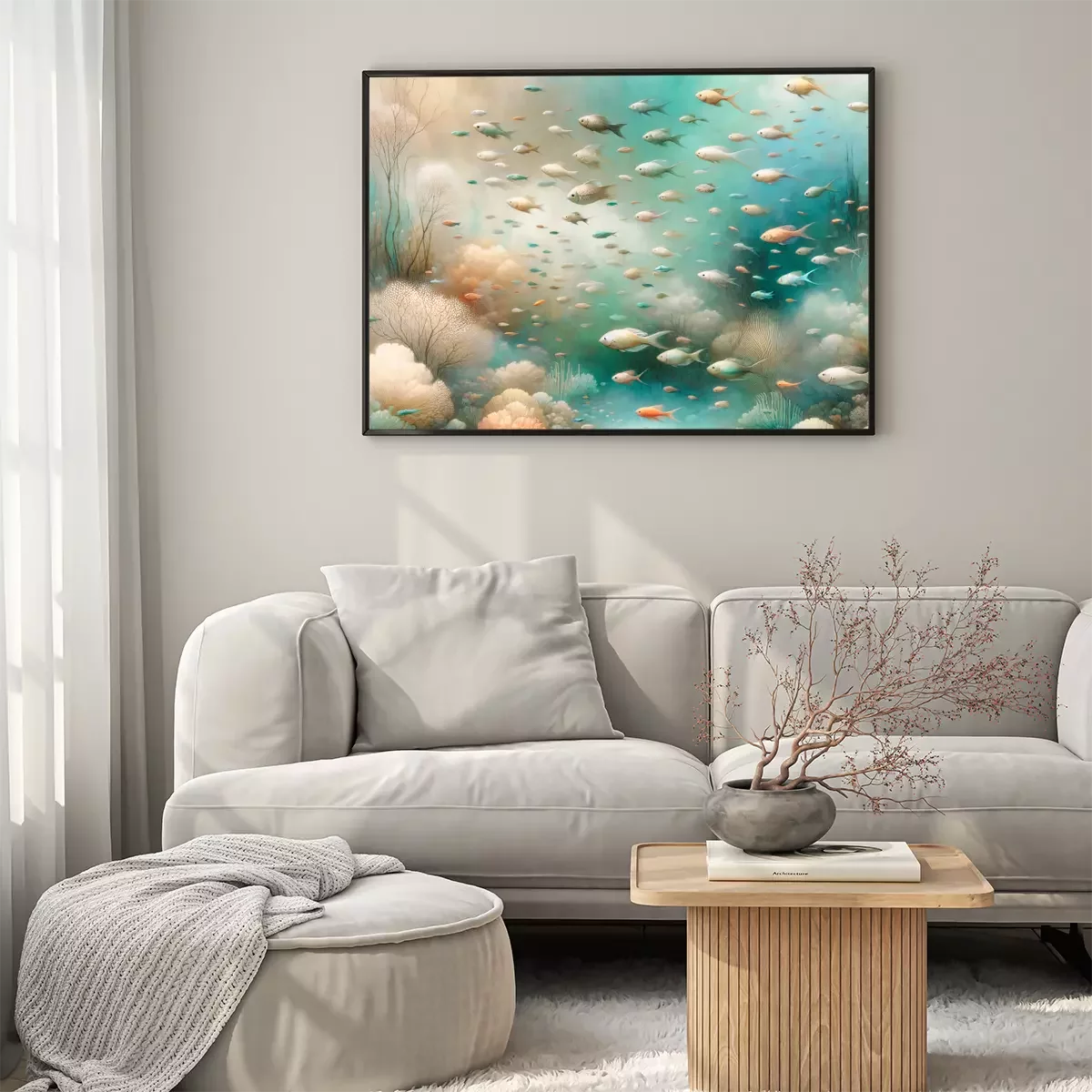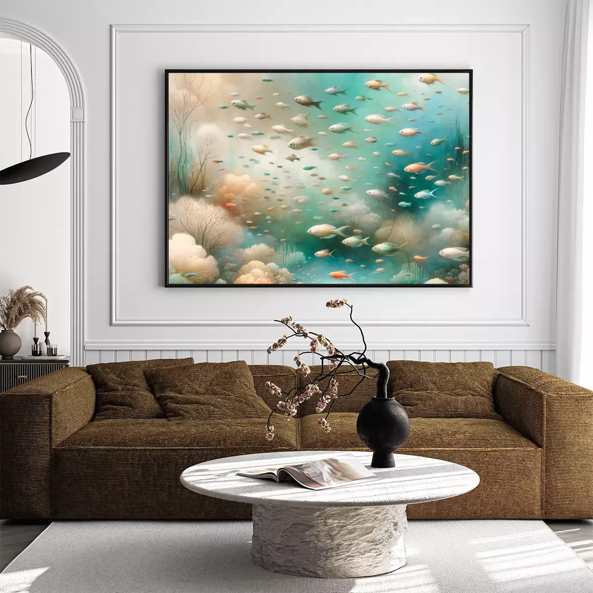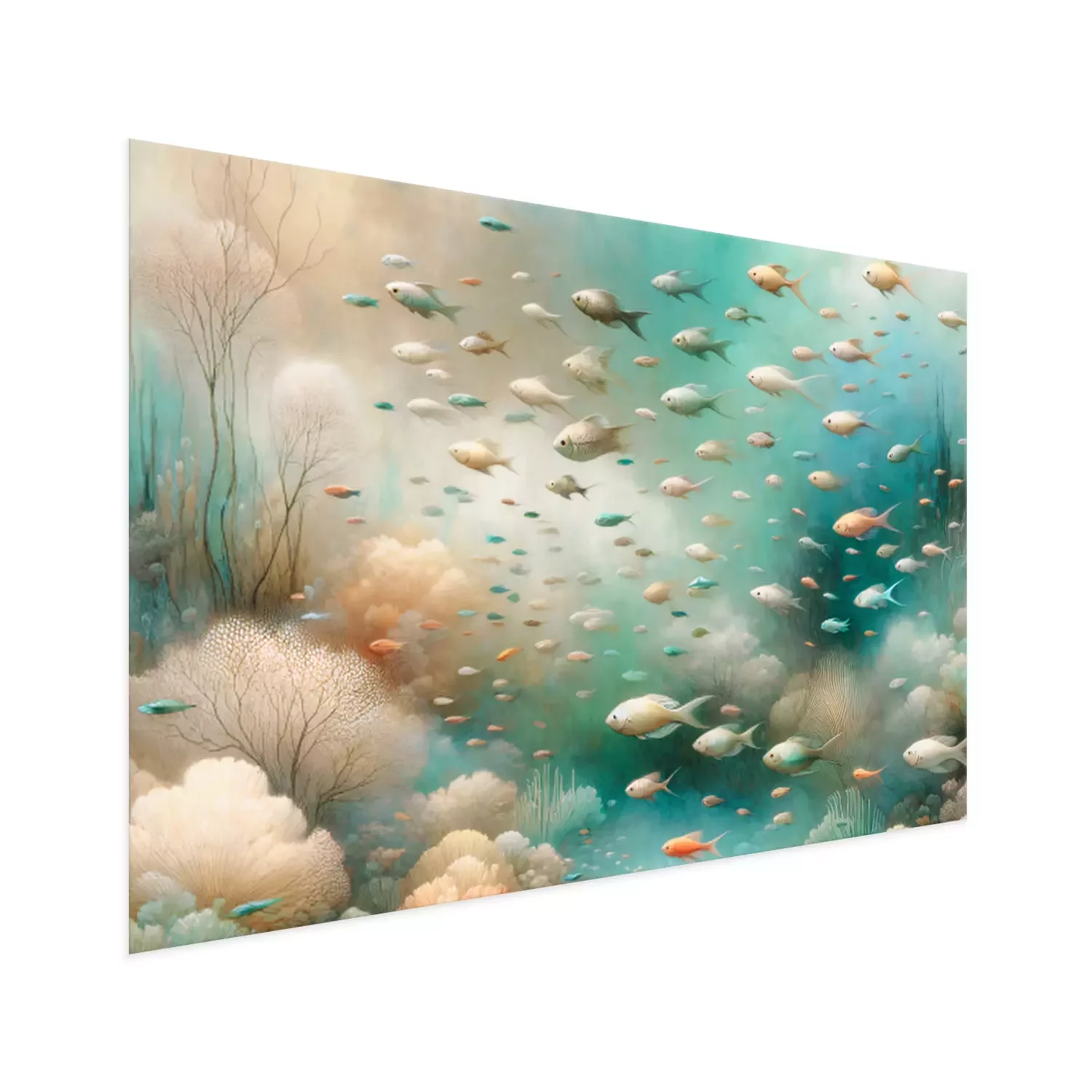 Récif corallien aux teintes pastel et poissons dans l'océan