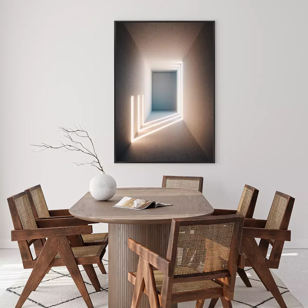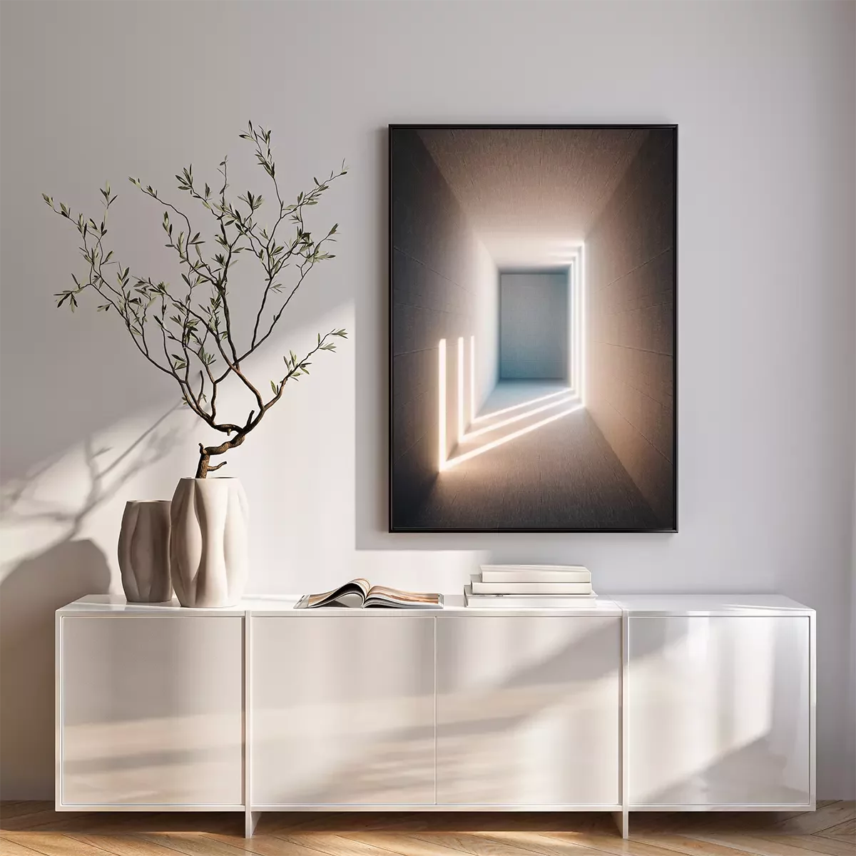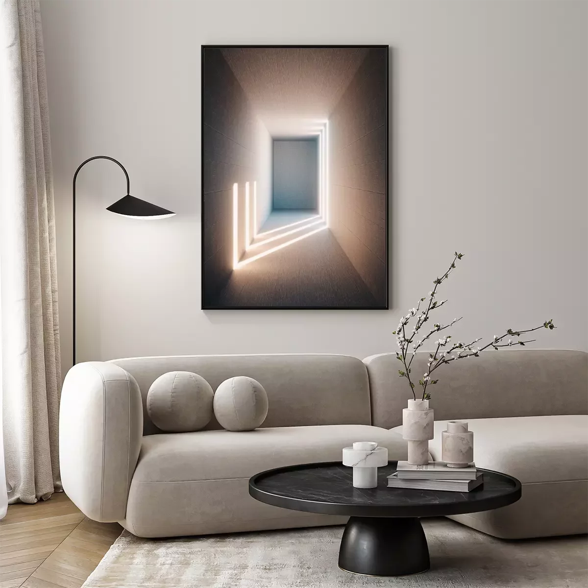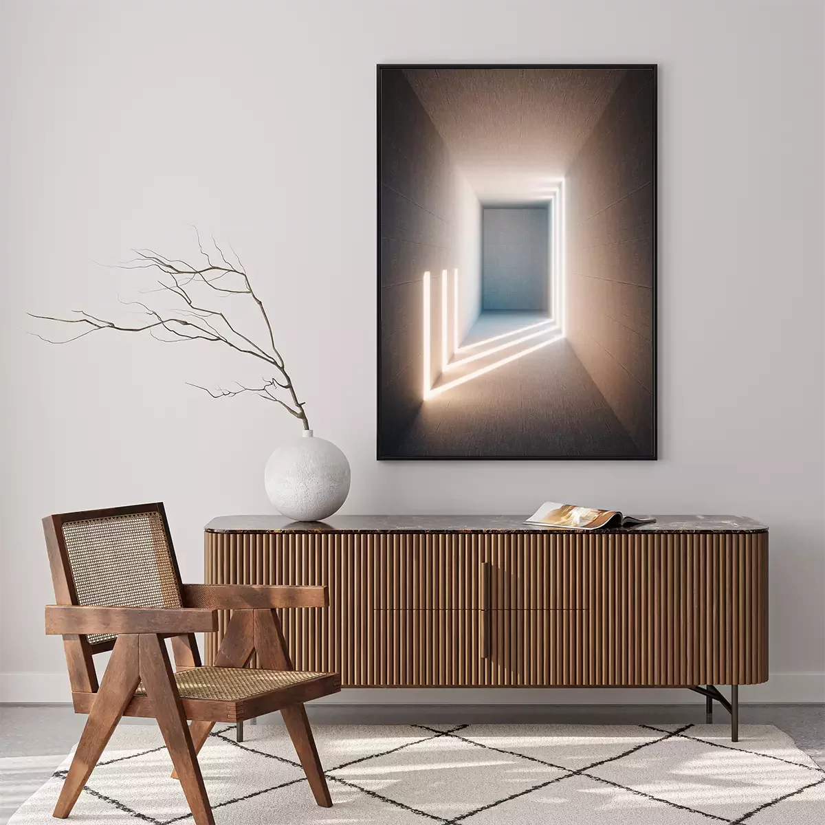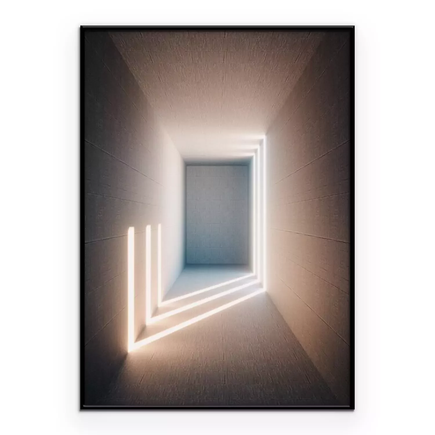 Poster : Rendu 3D, abstrait urbain, couloir vide illuminé, intérieur, murs en béton, lumière rougeoyante, tunnel de lumière du jour, pas de sortie