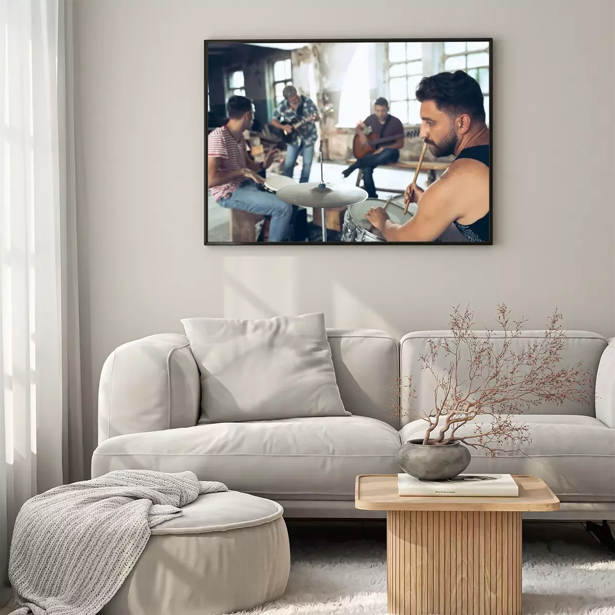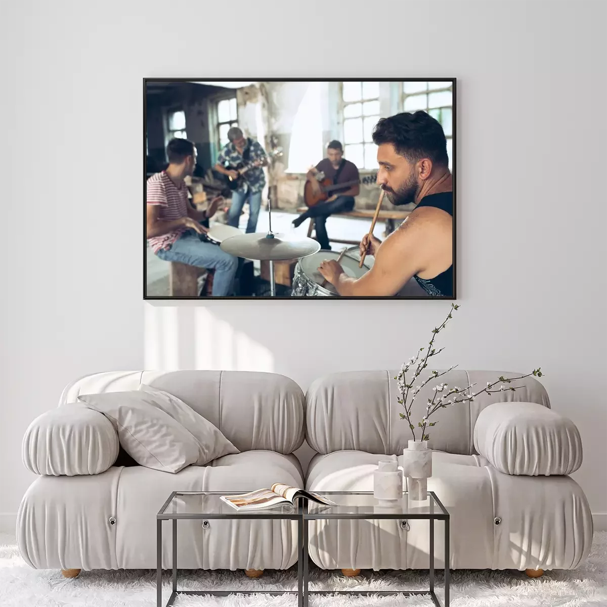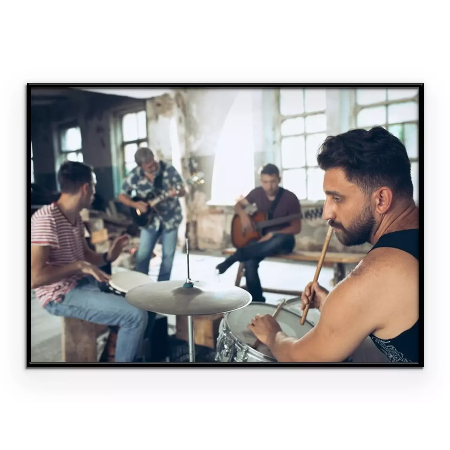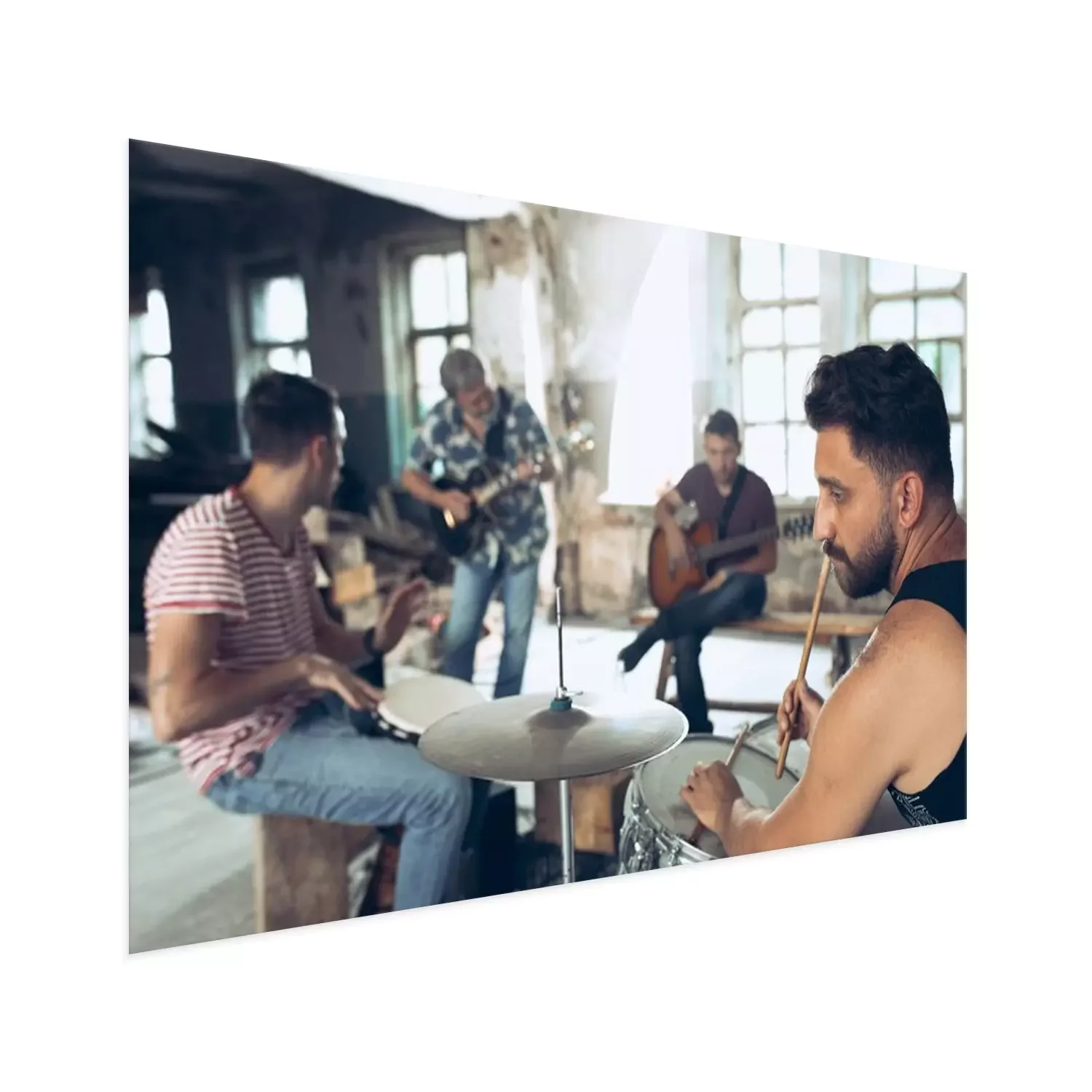 Poster  Repetition of rock music band. Electric guitar player and drummer behind the drum set.