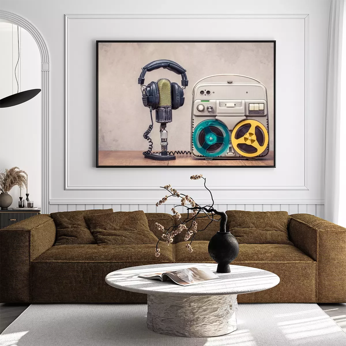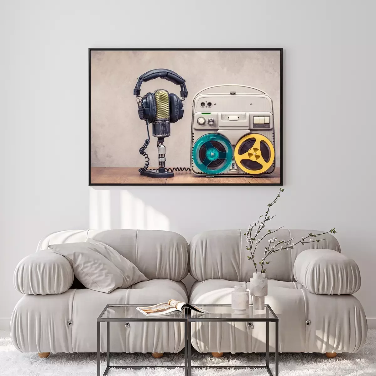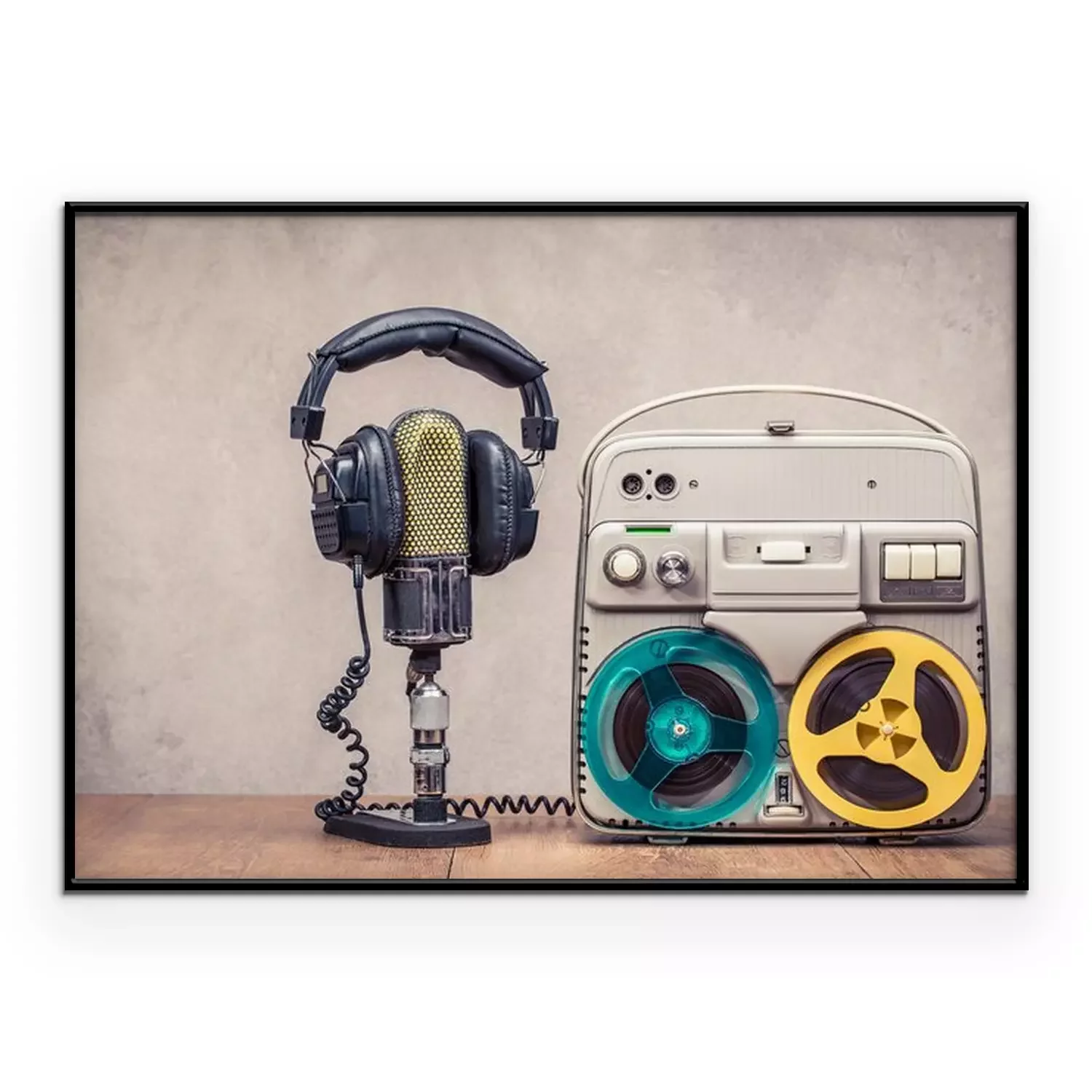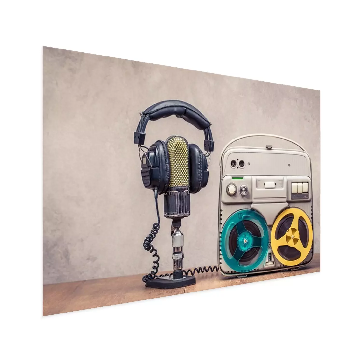 Poster  Rétro bobine à bobine magnétophone vers les années 60, microphone et casque sur fond de mur en béton avant de table en bois. Photo filtrée de style vintage