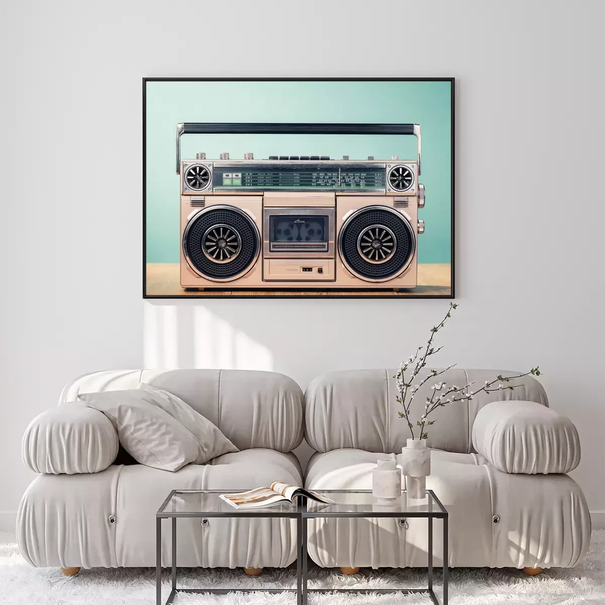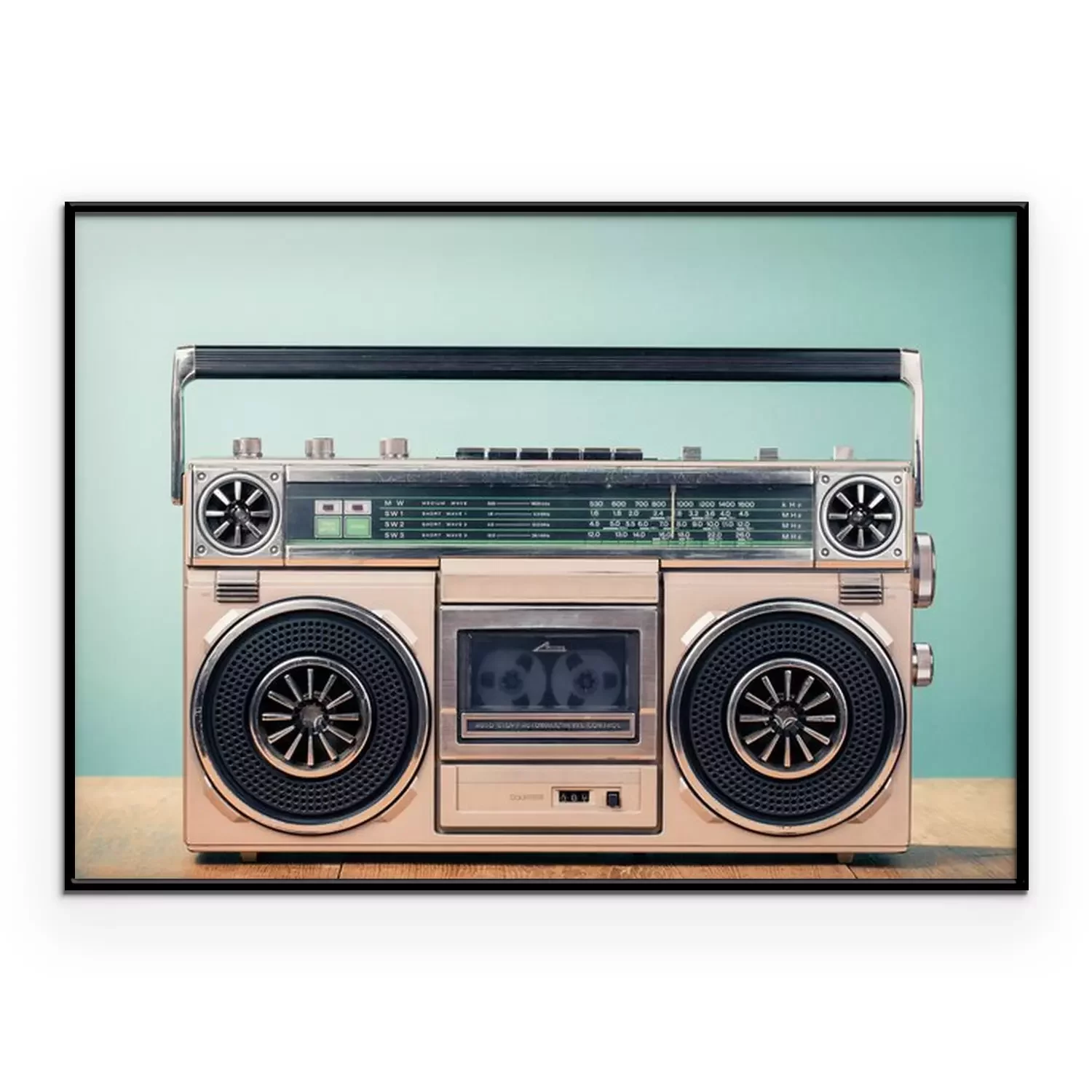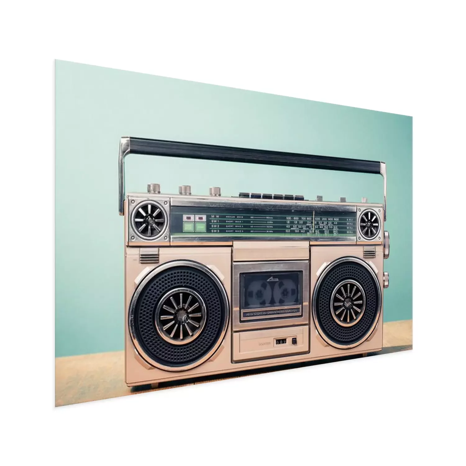 Poster  Rétro enregistreur à cassette désactivé de 80s sur le fond vert de la menthe avant de la table. Photo filtrée ancienne style ancien