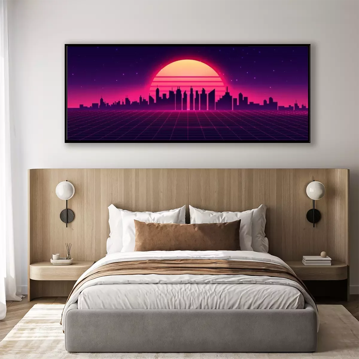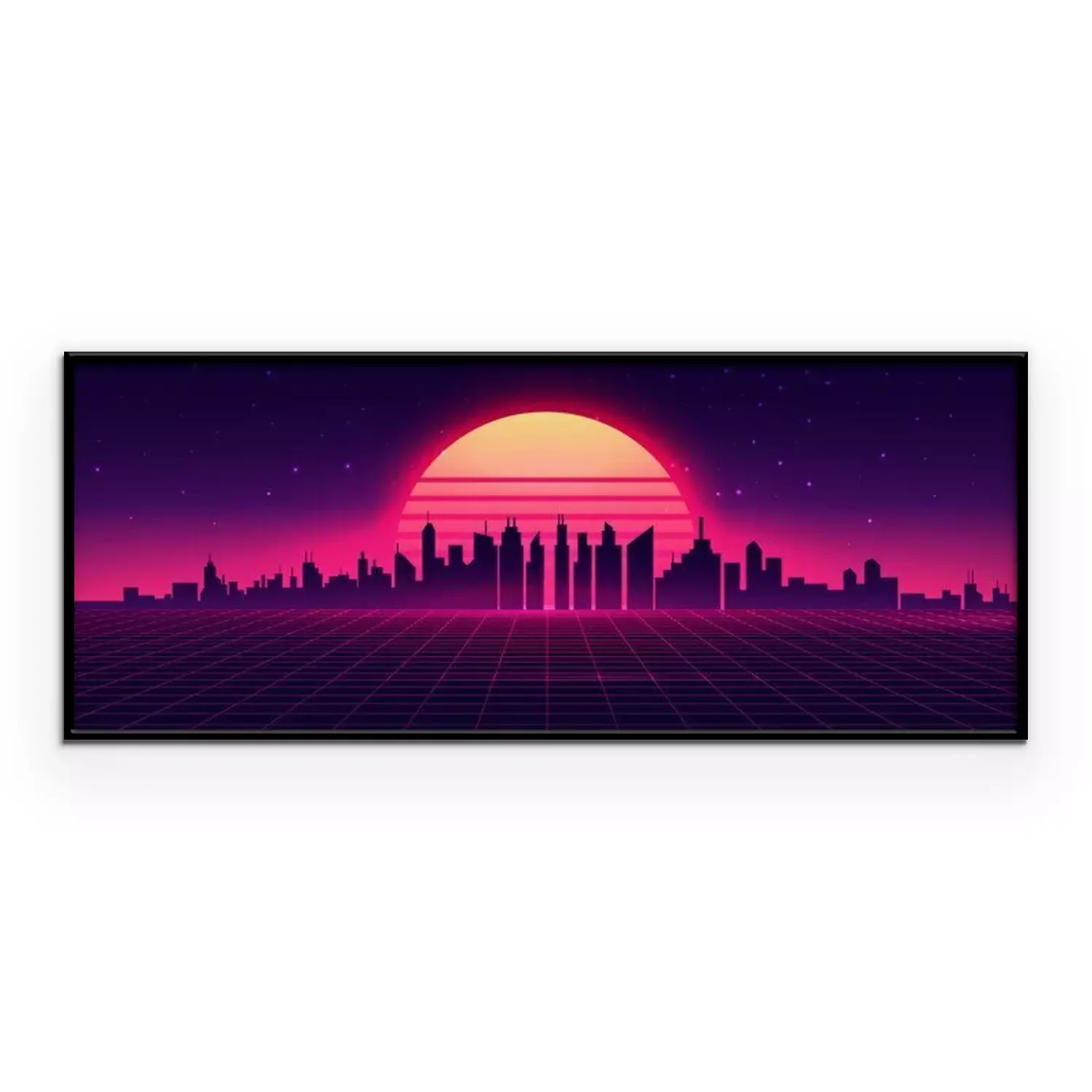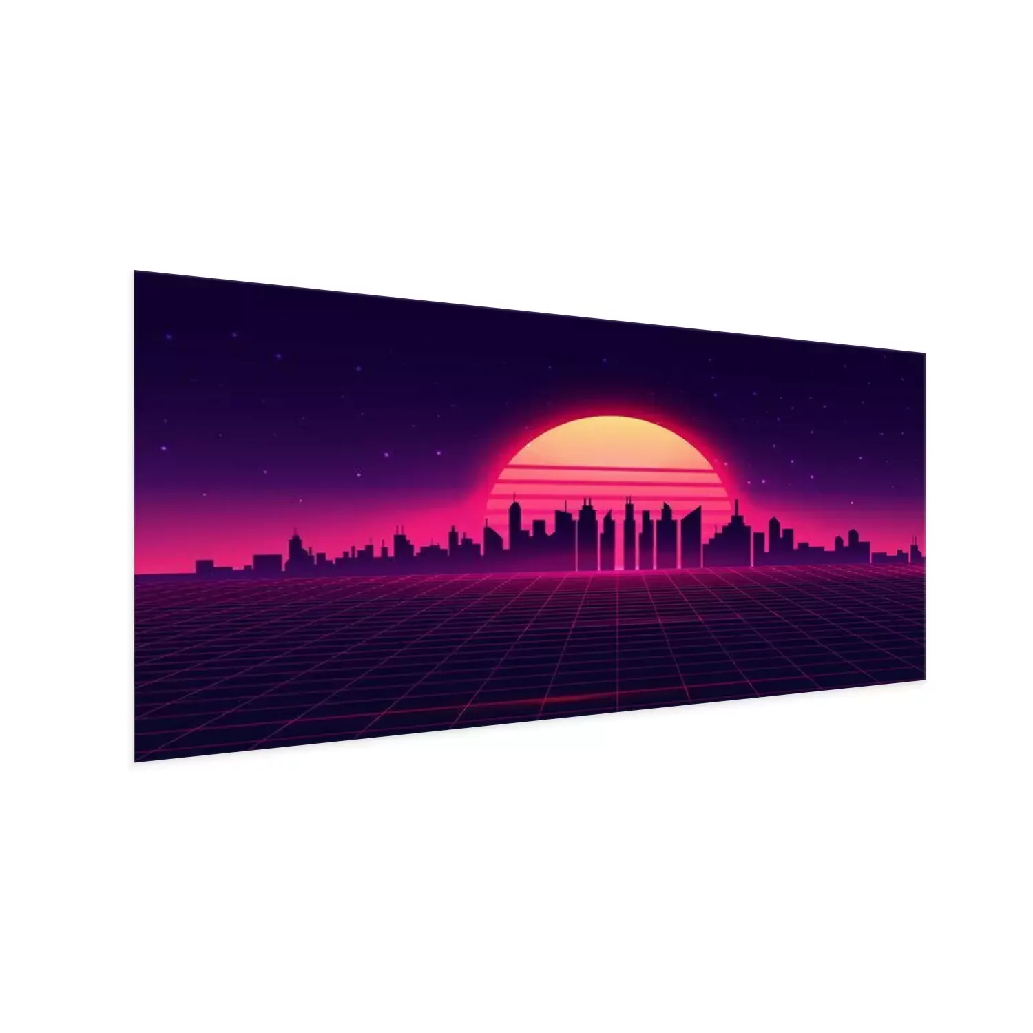 Poster : Retro futuristic synthwave retrowave styled night cityscape with sunset on background. Cover or banner template for retro wave music. Vector illustration.