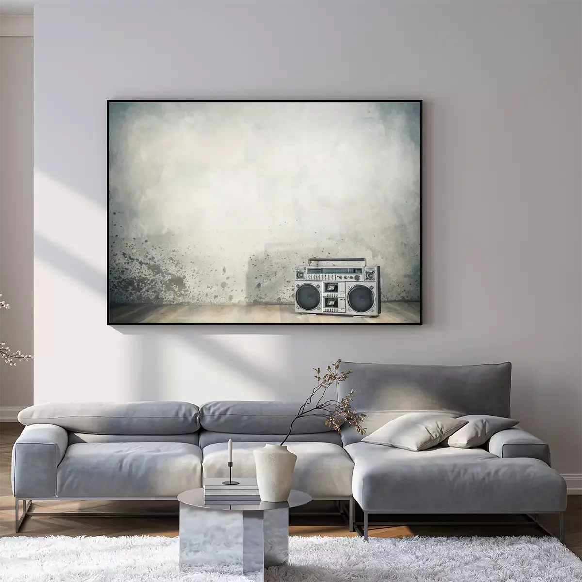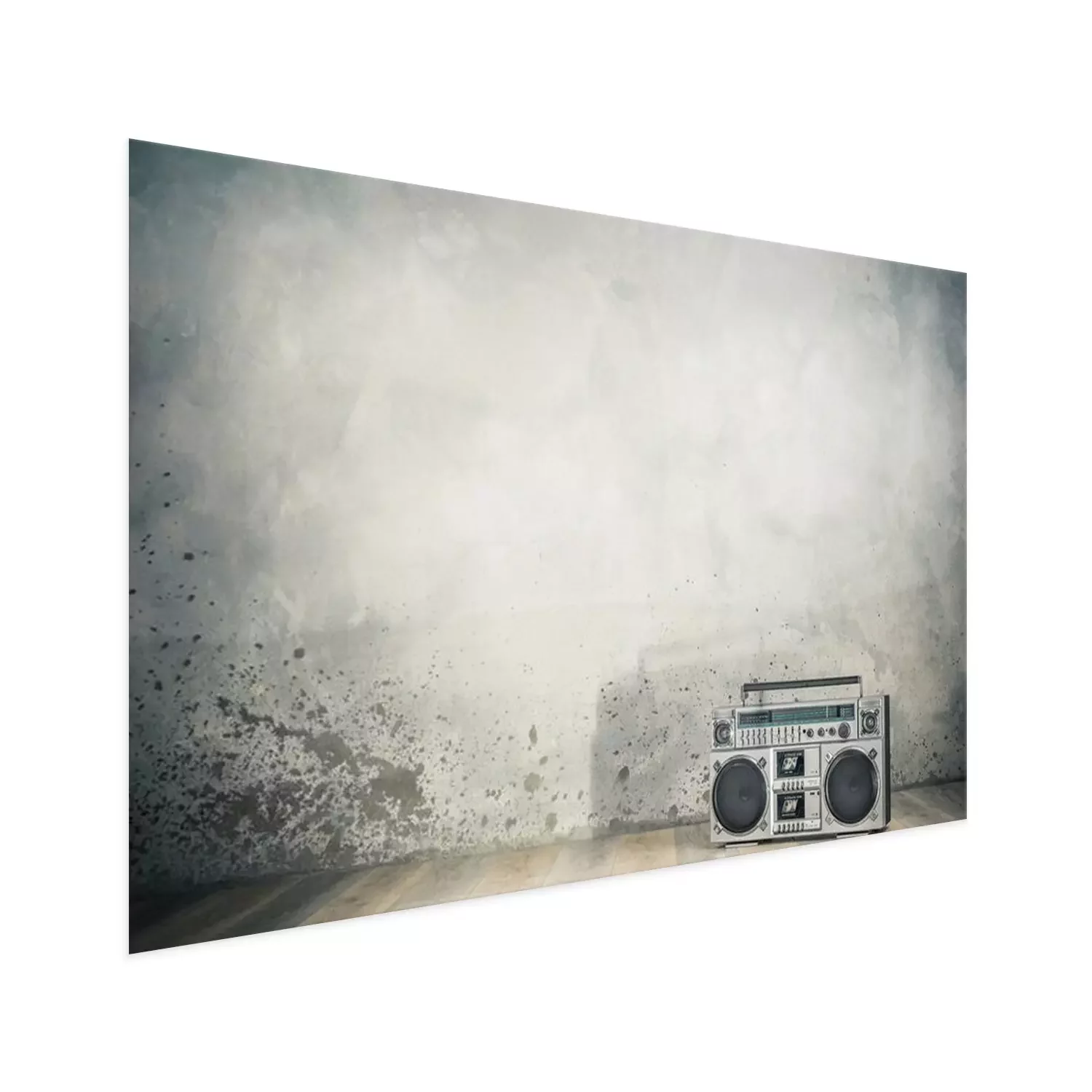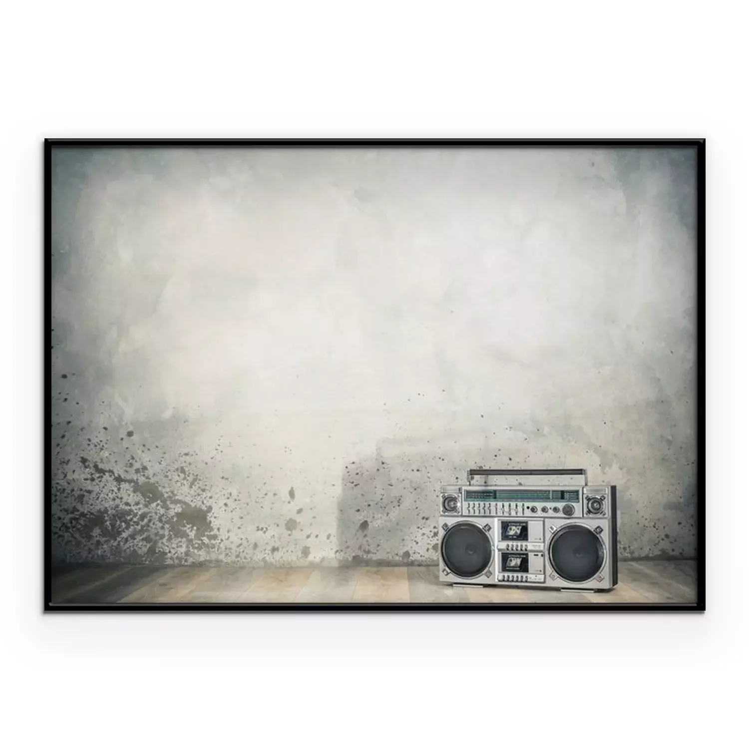 Poster  Retro outdated portable stereo boombox radio cassette recorder from 80s front concrete wall background with shadow. Vintage old style filtered photo
