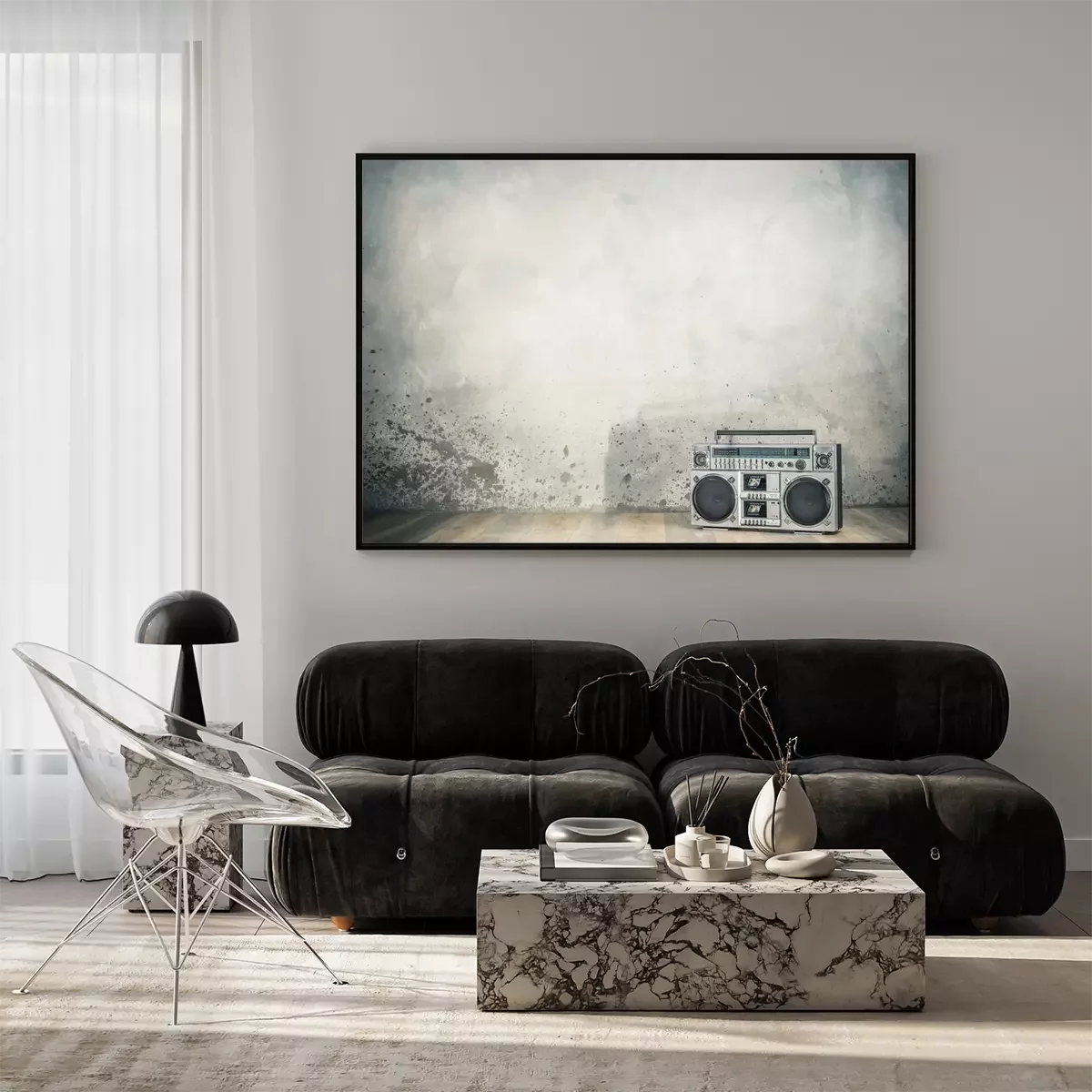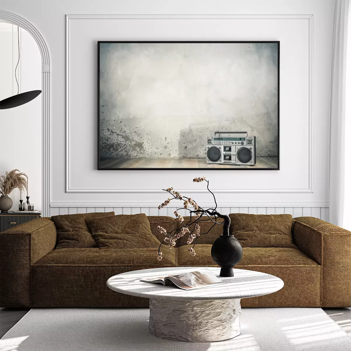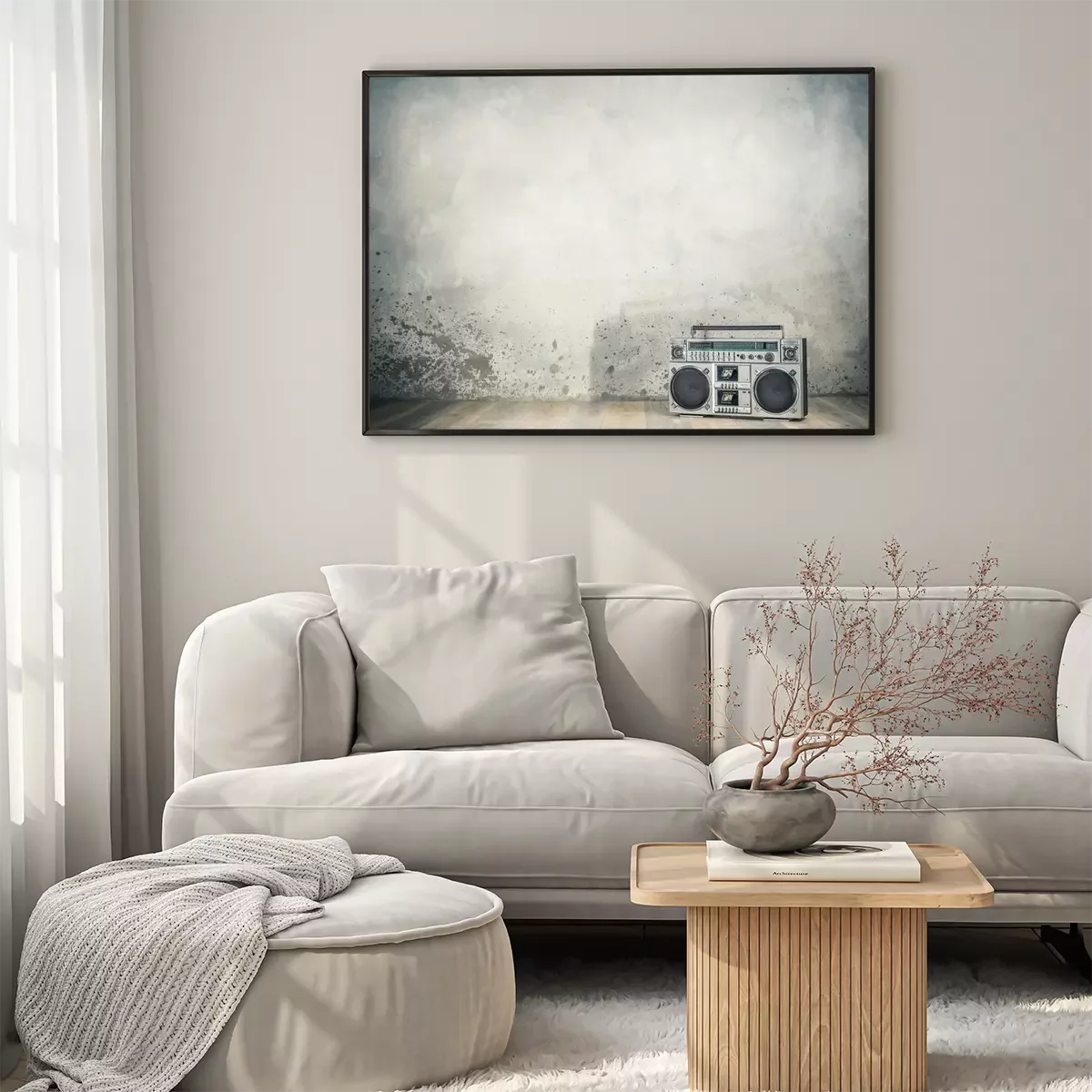 Poster  Retro outdated portable stereo boombox radio cassette recorder from 80s front concrete wall background with shadow. Vintage old style filtered photo