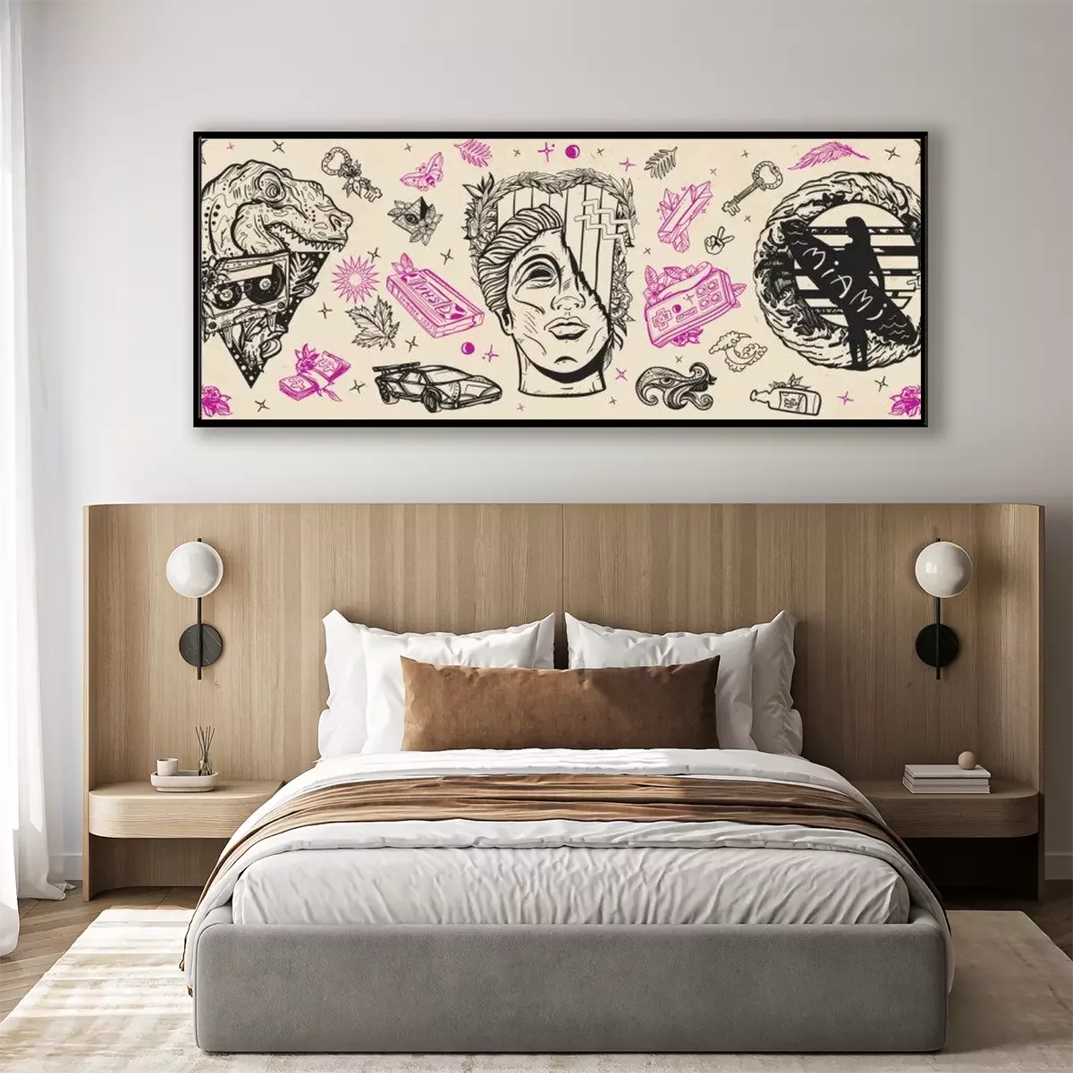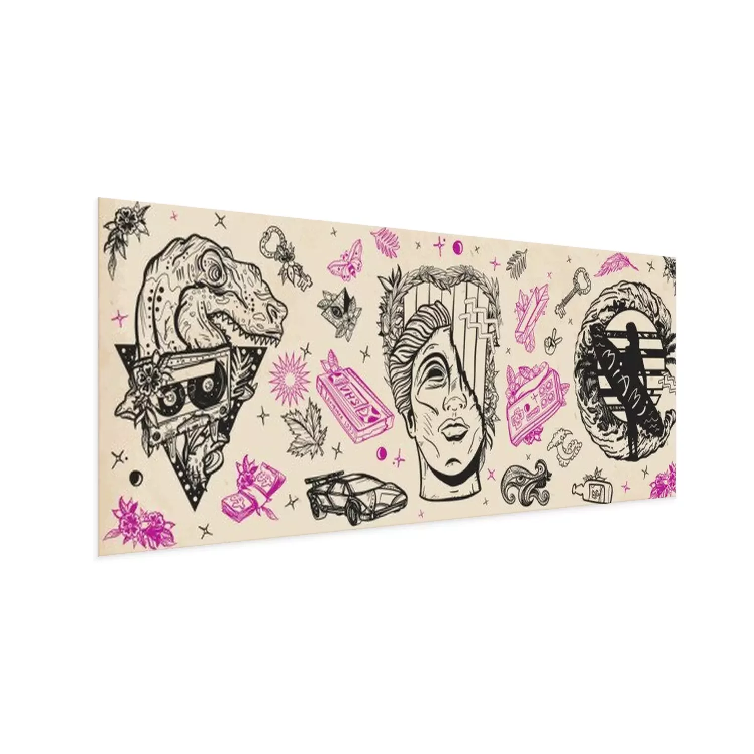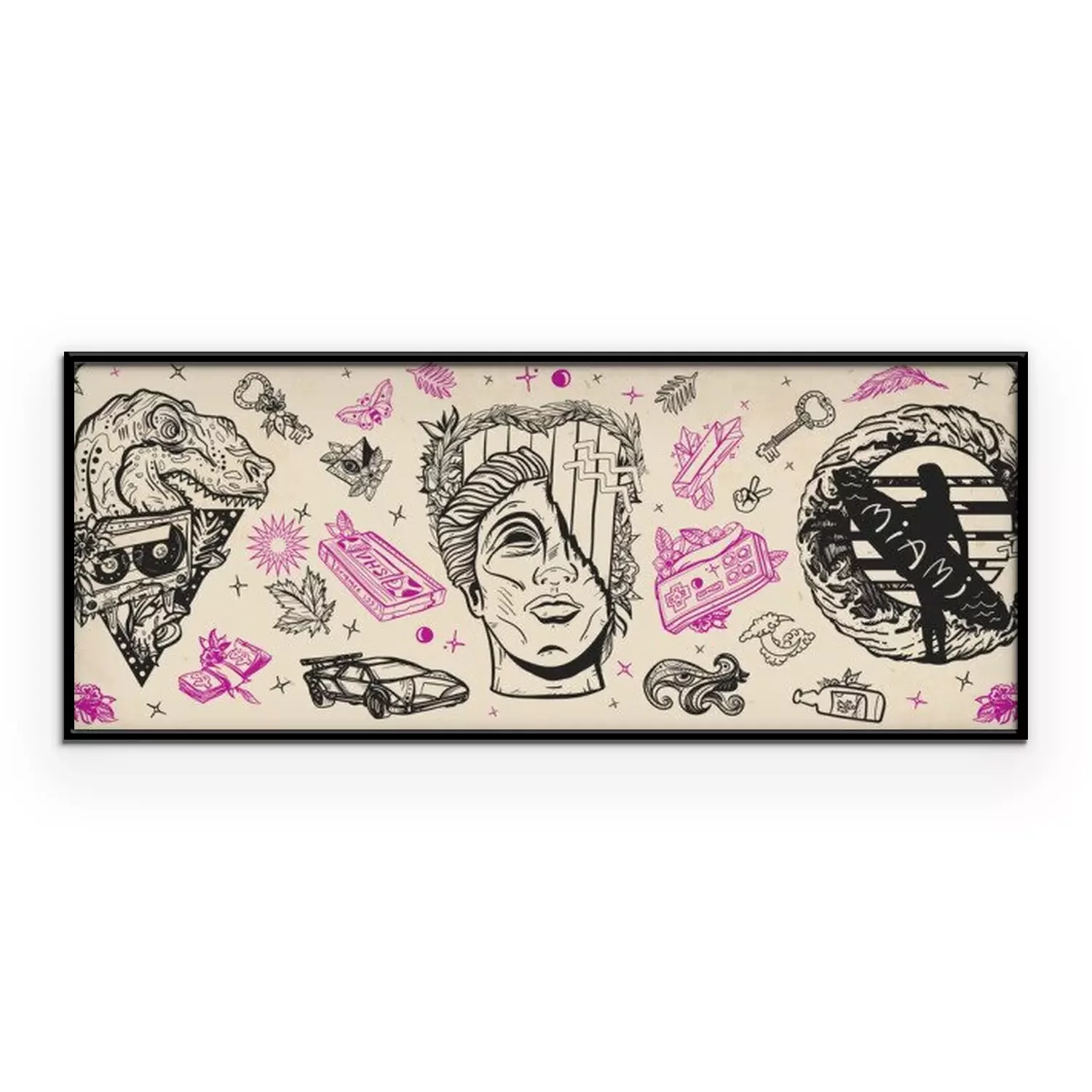 Poster : Retro wave music concept. Statue head, laser tyrannosaur, surfing woman, future car. Audio cassette, VHS type. Nostalgic cyberpunk style, 80s and 90s pop culture. Old school tattoo vector collection