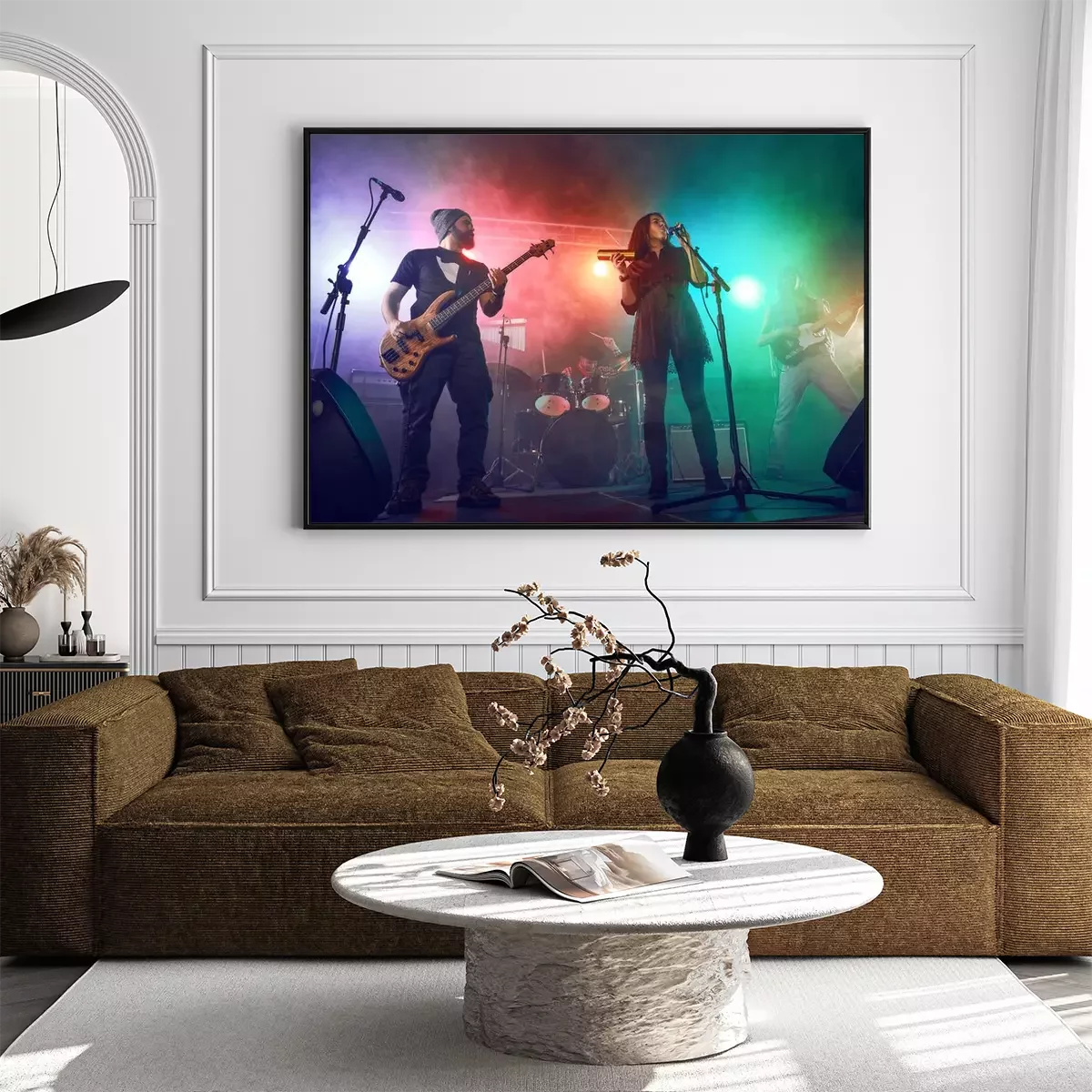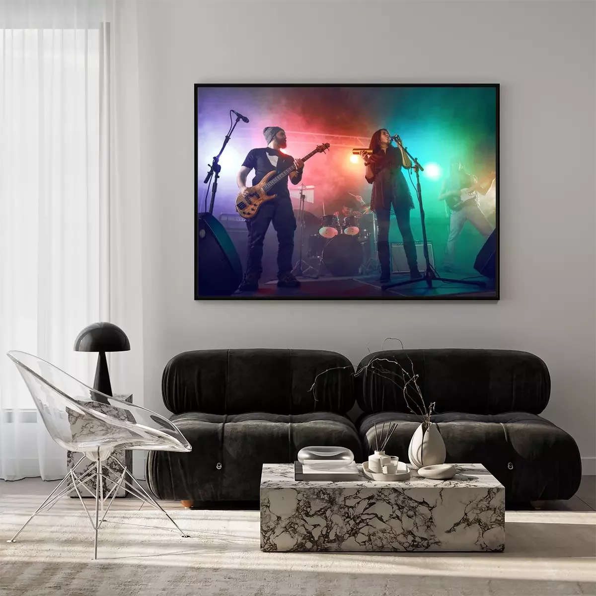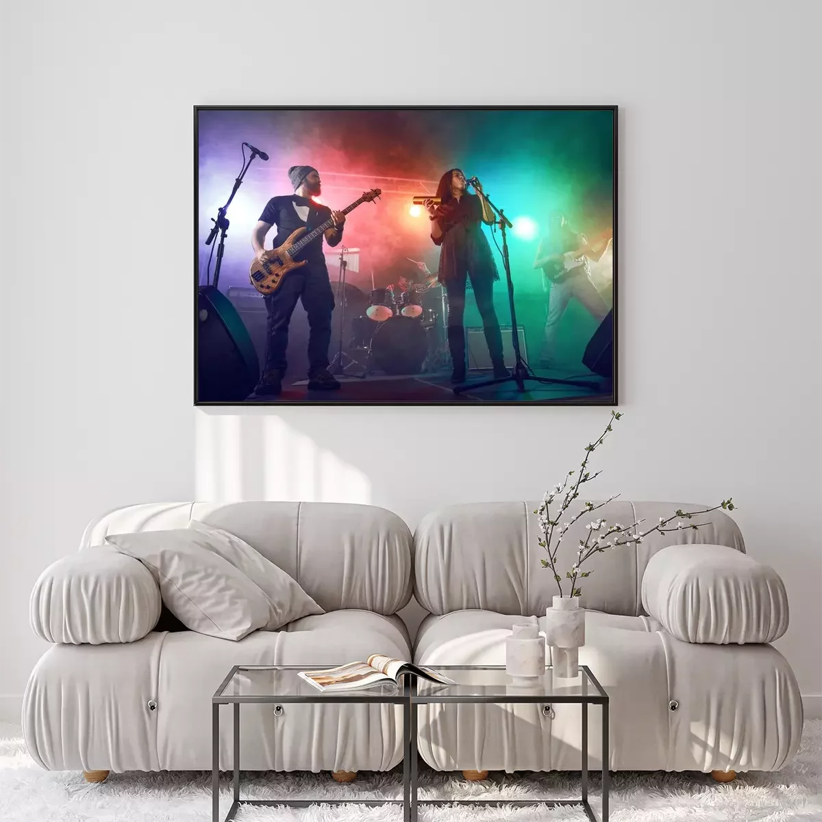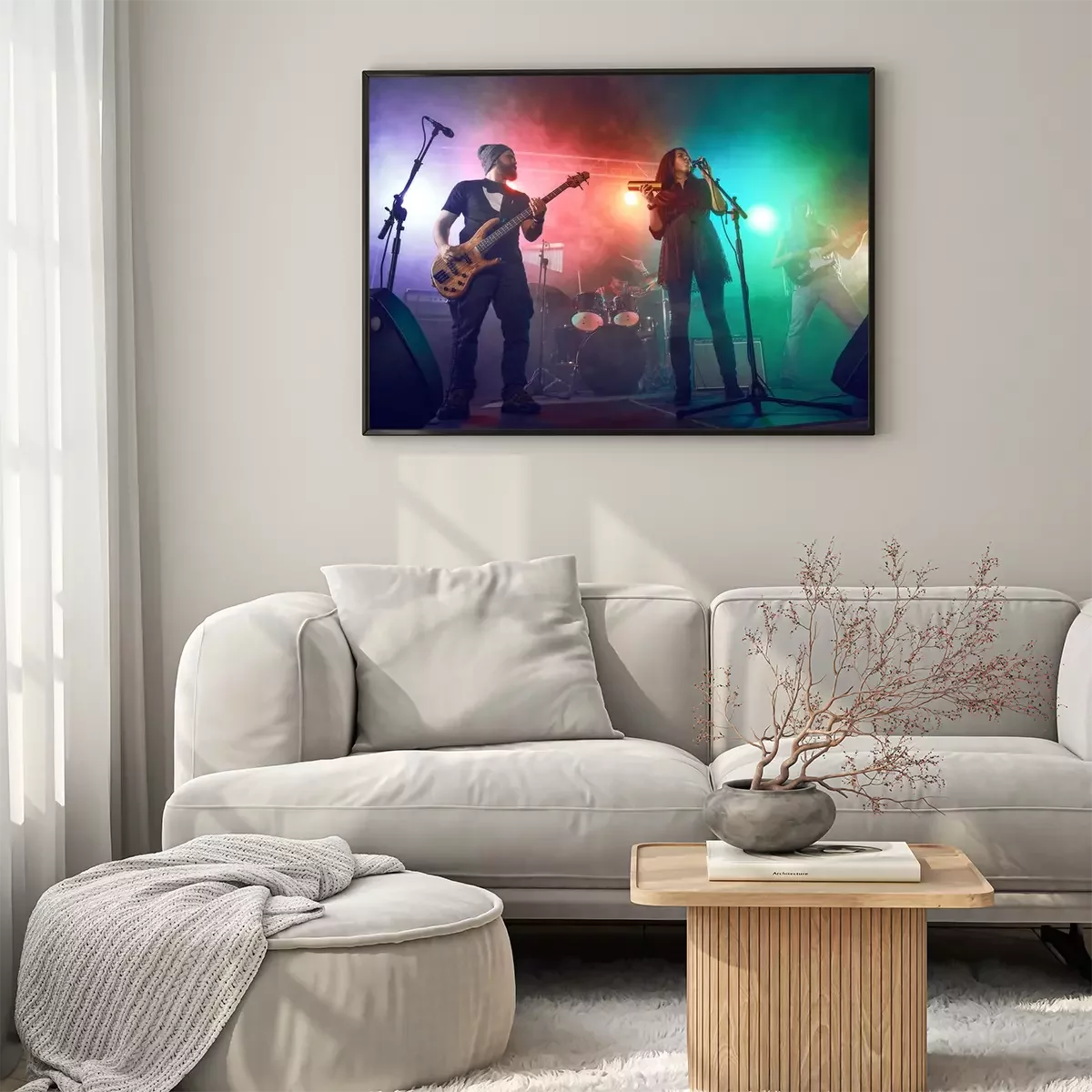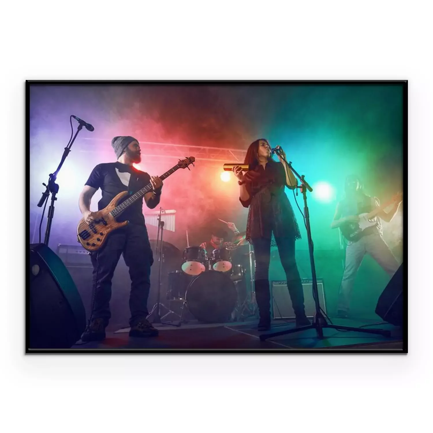 Poster : Rock band performs on stage. Guitarist, bass guitar and drums.