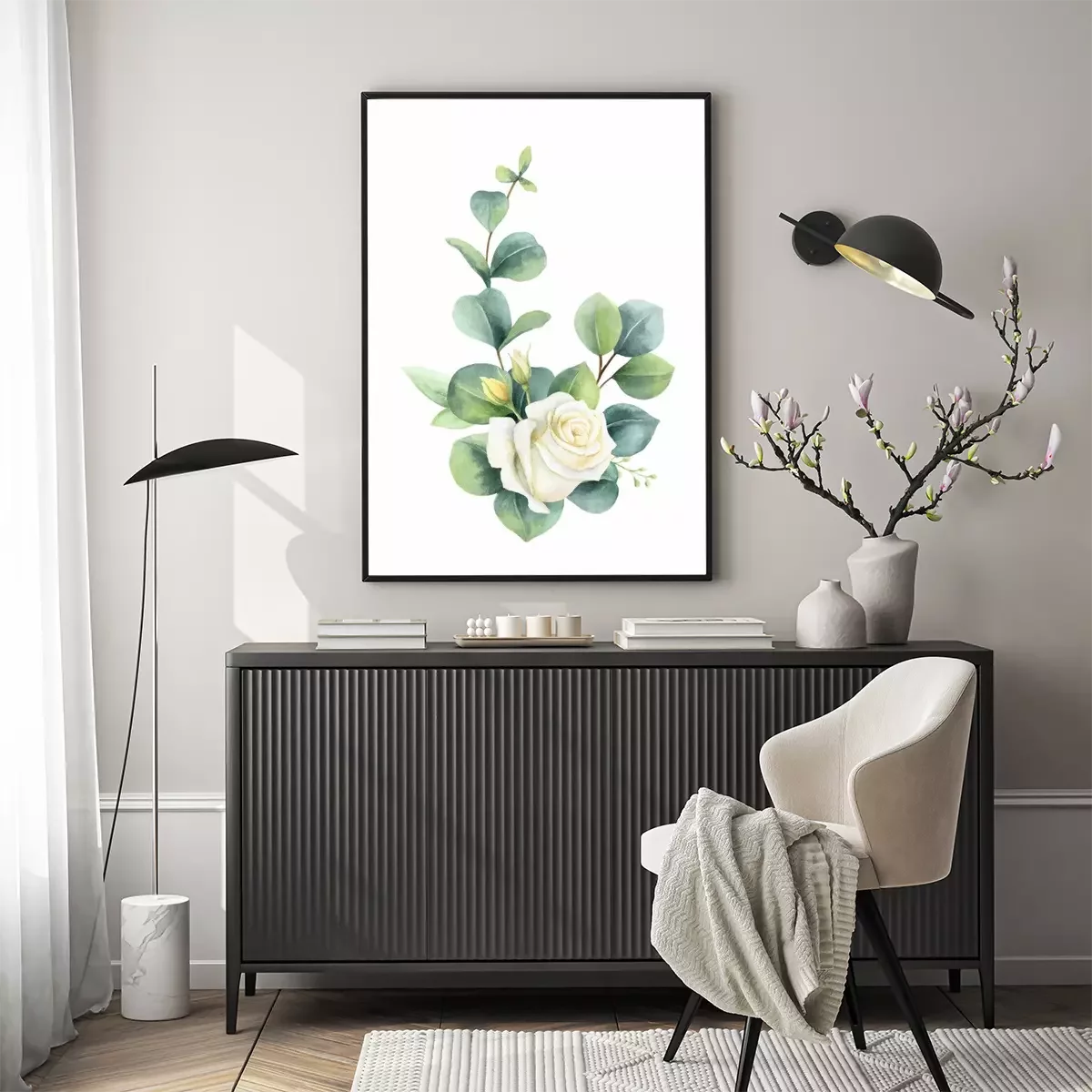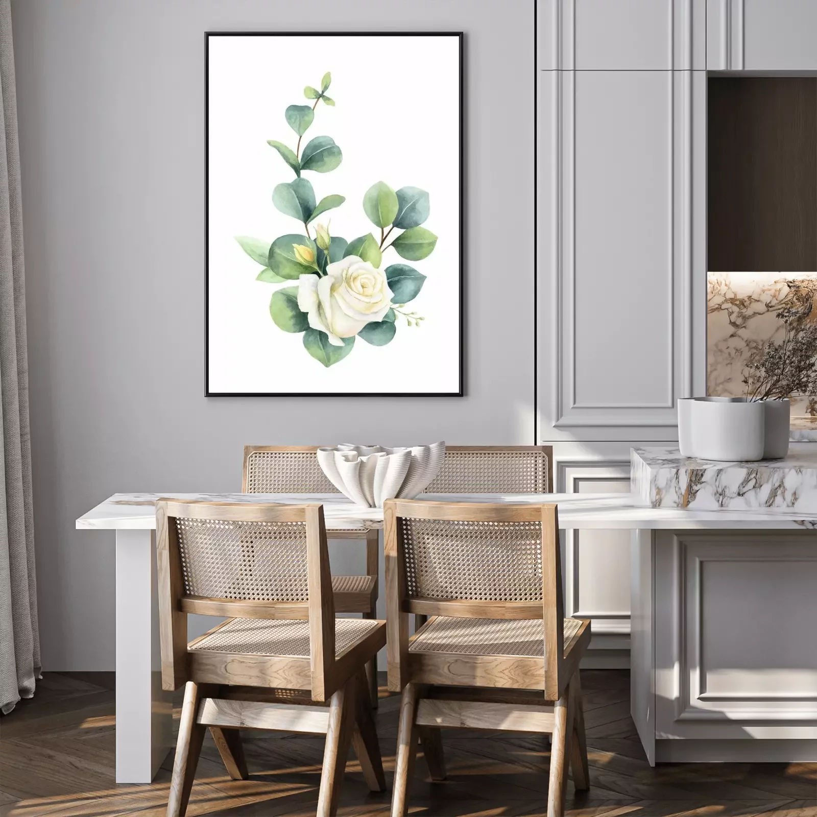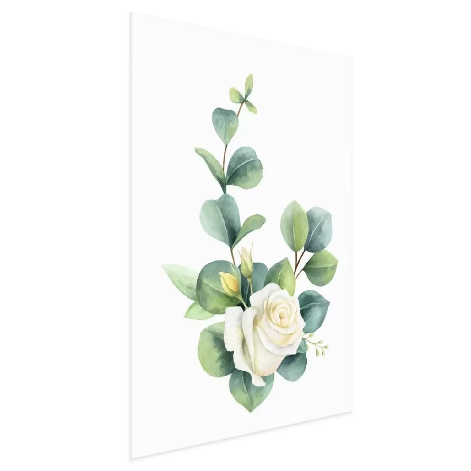 Poster  Roses blanches avec des feuilles d'eucalyptus ombragées