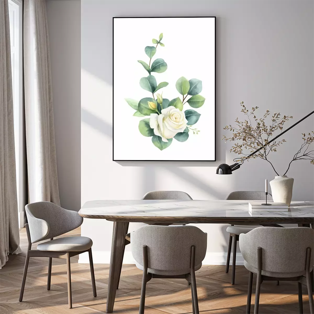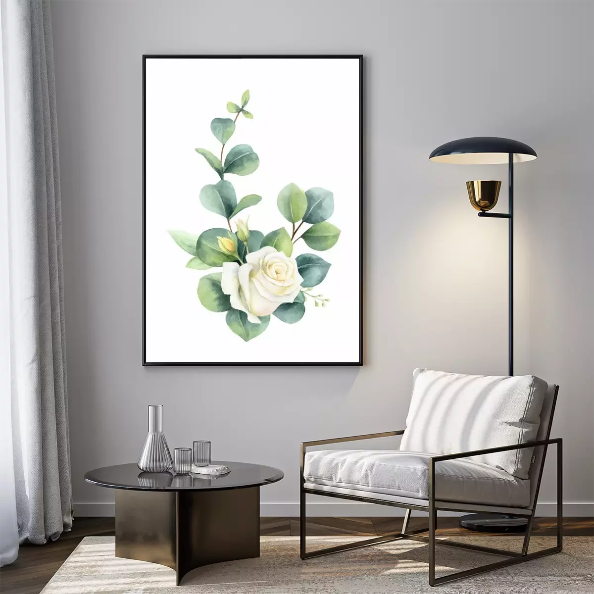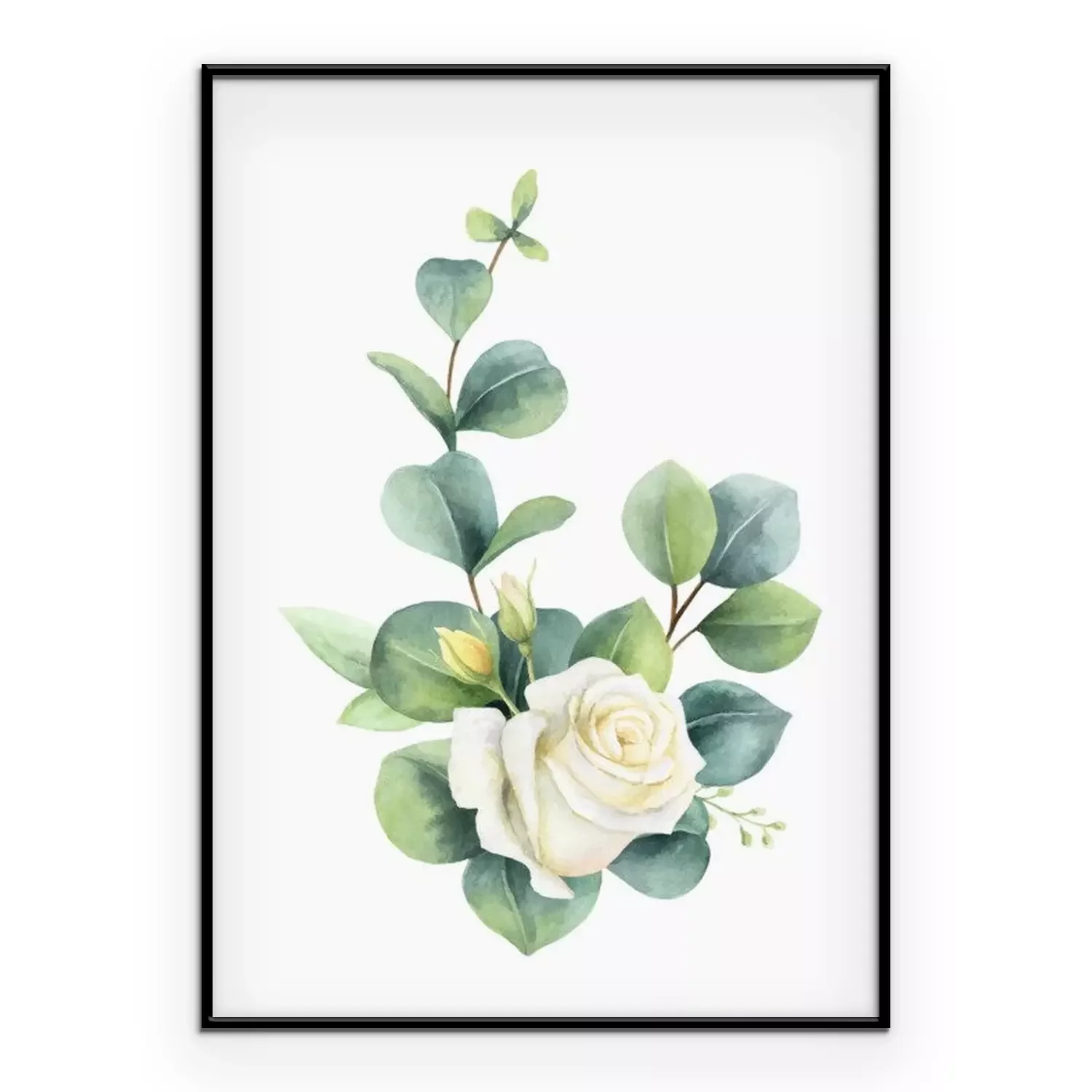 Poster  Roses blanches avec des feuilles d'eucalyptus ombragées