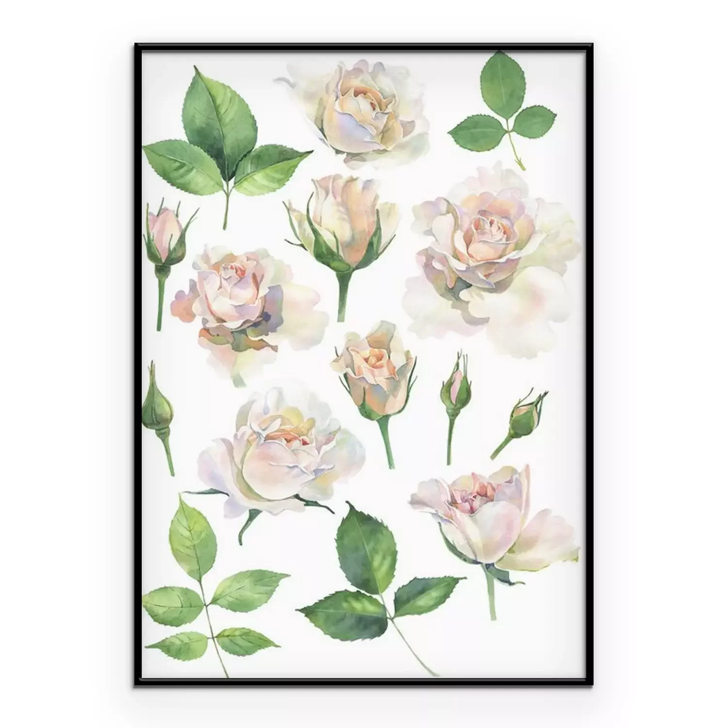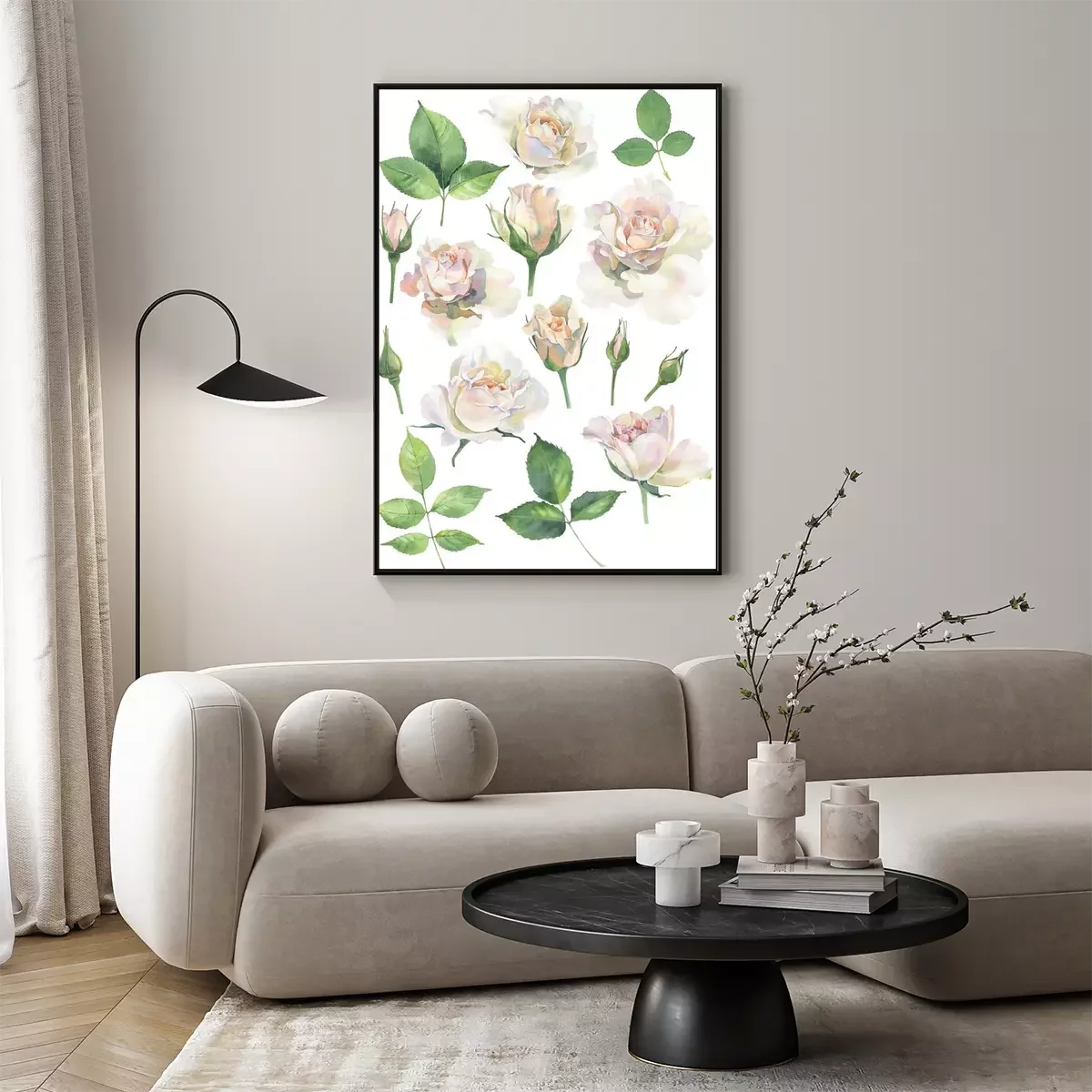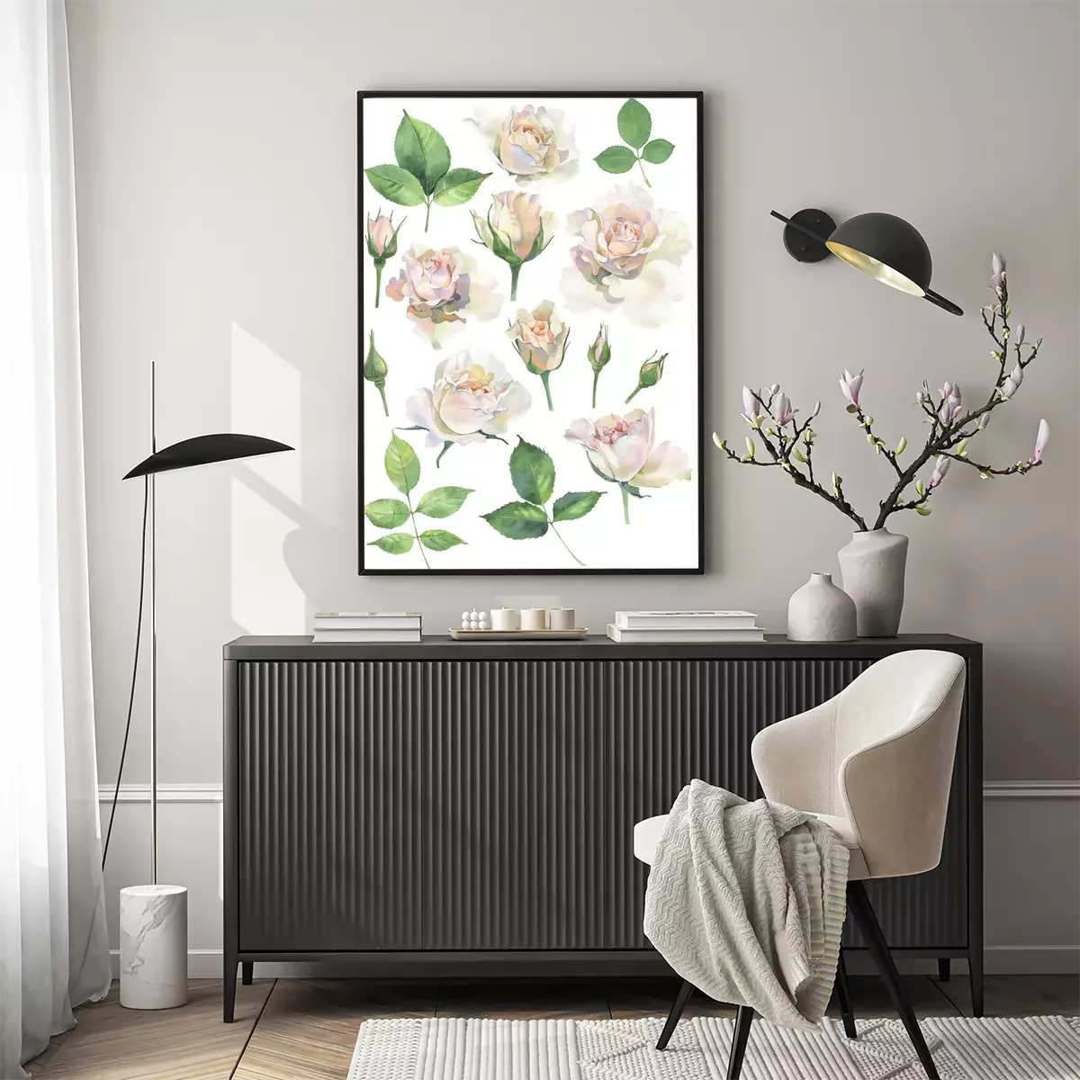 Poster  Roses blanches et feuilles d'aquarelle vertes