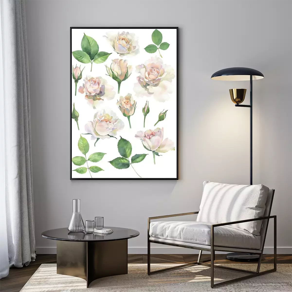 Poster : Roses blanches et feuilles d'aquarelle vertes