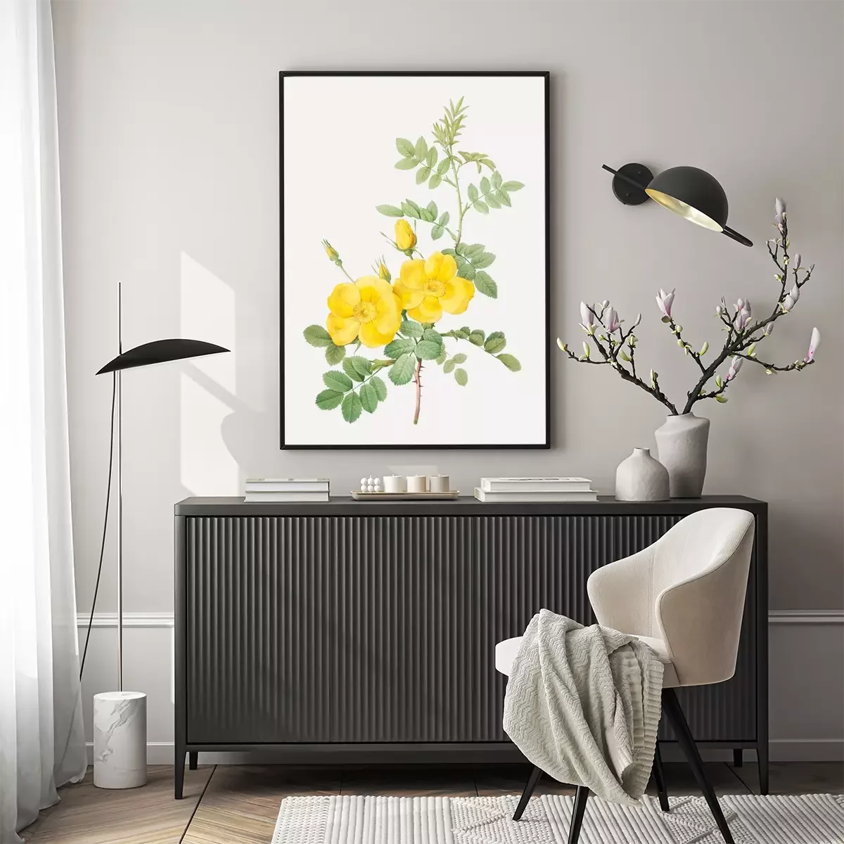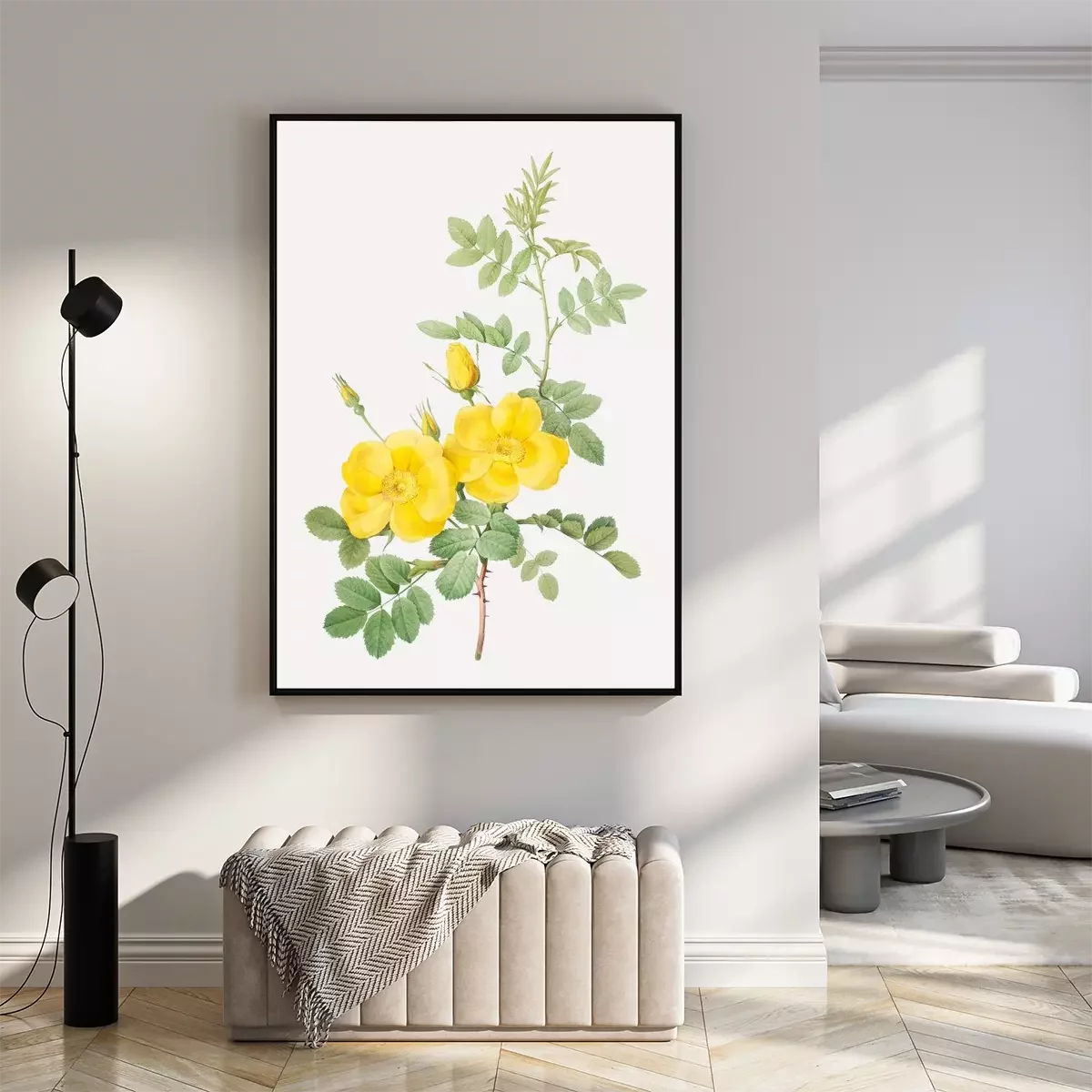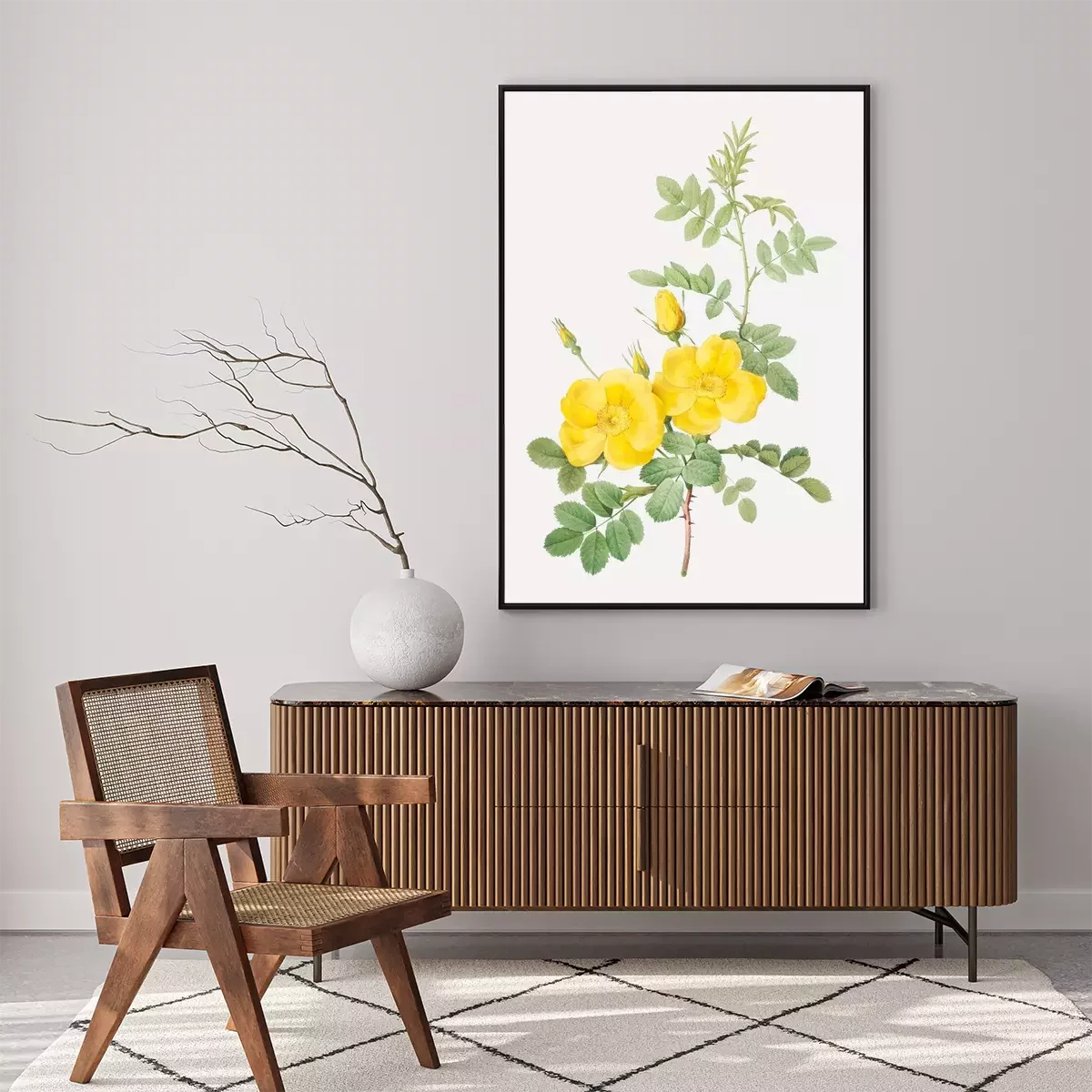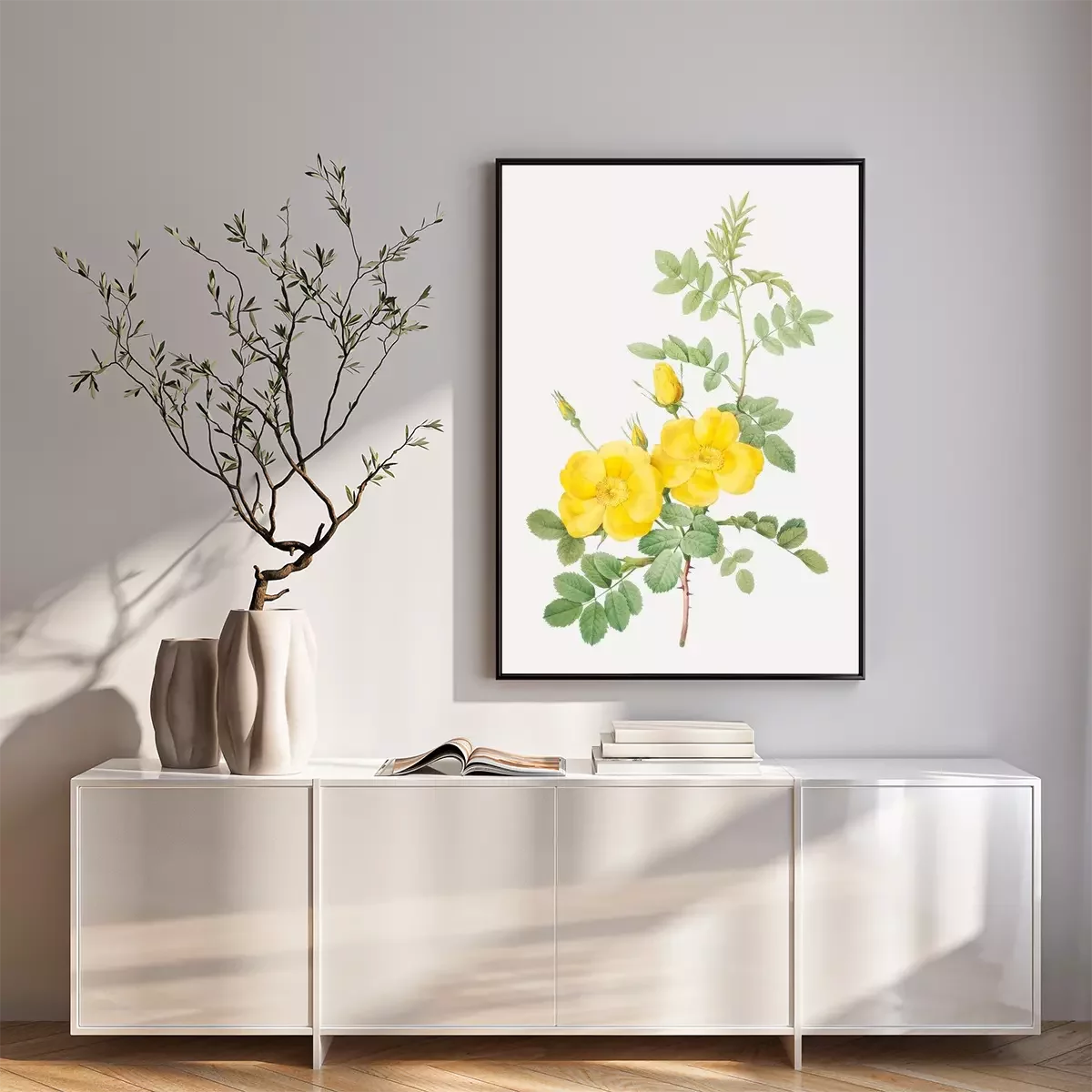 Poster : Roses jaunes sur une branche épineuse