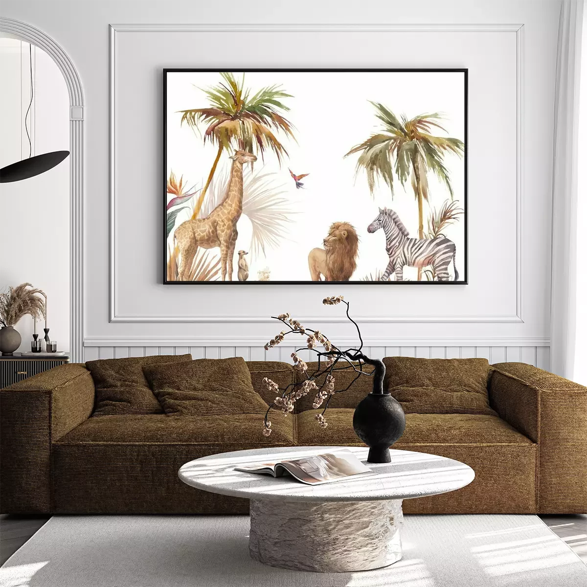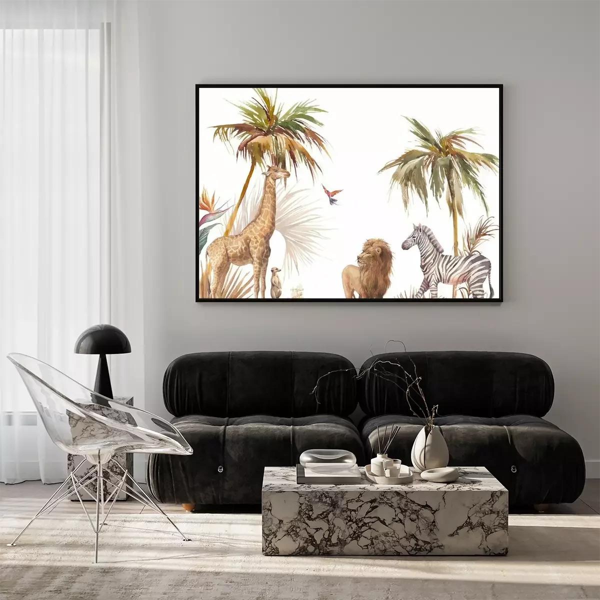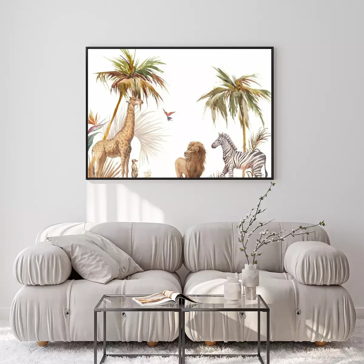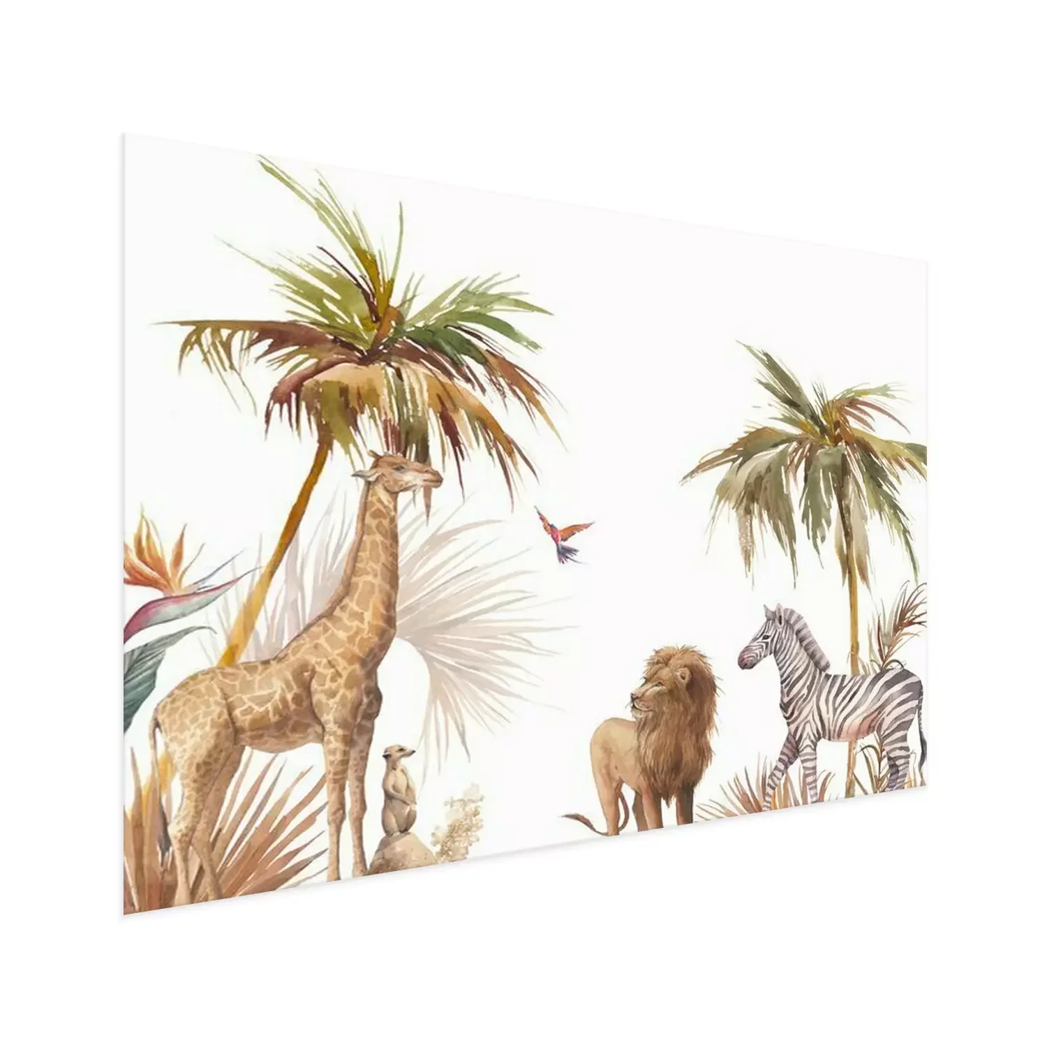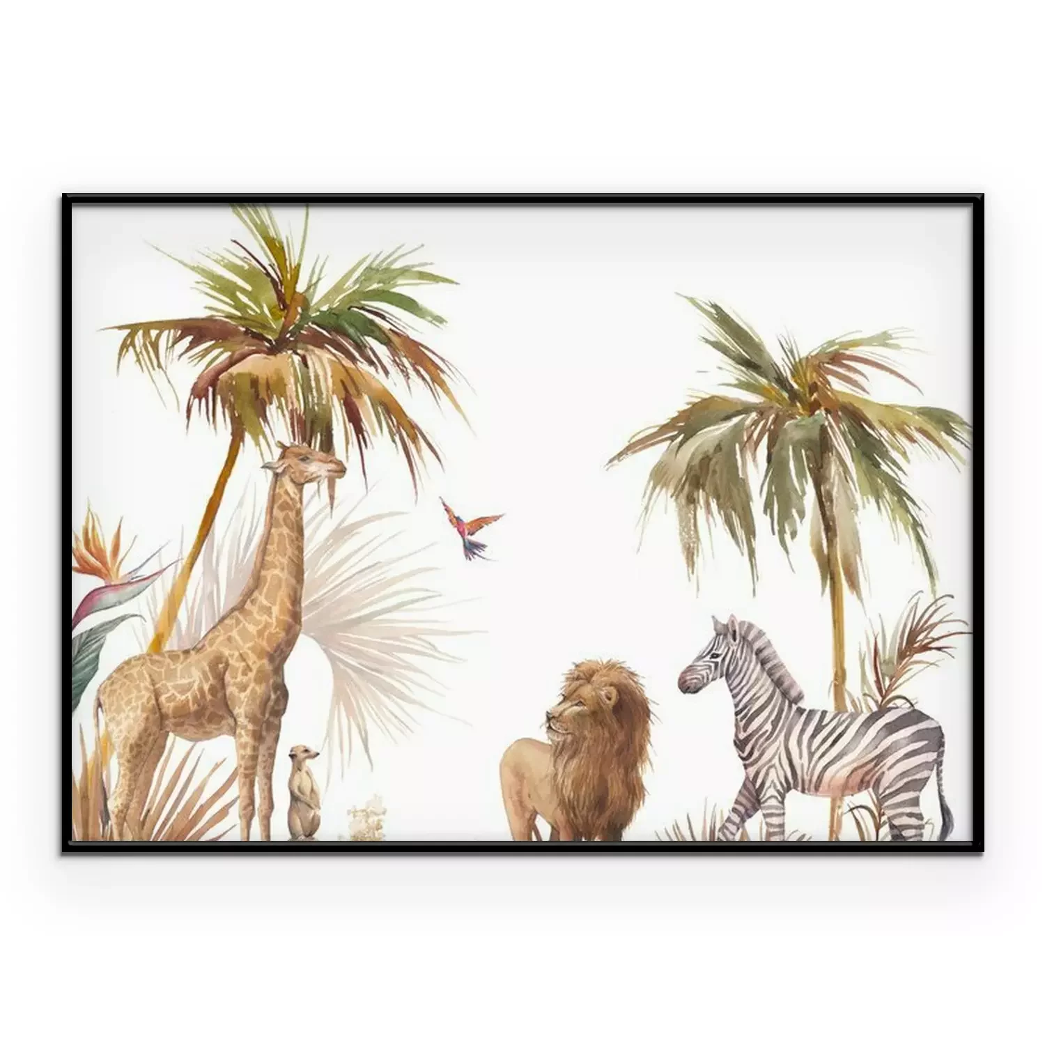 Poster  Safari wildlife wallpaper. Illustration with zebra, lion and giraffe. Watercolor animal and jungle flora on white background.