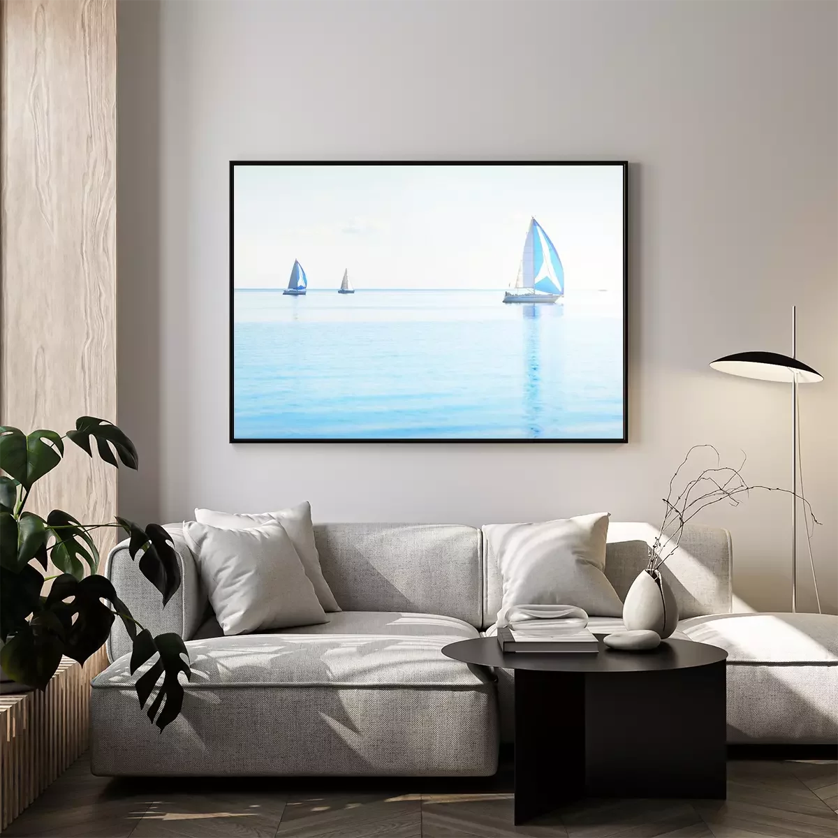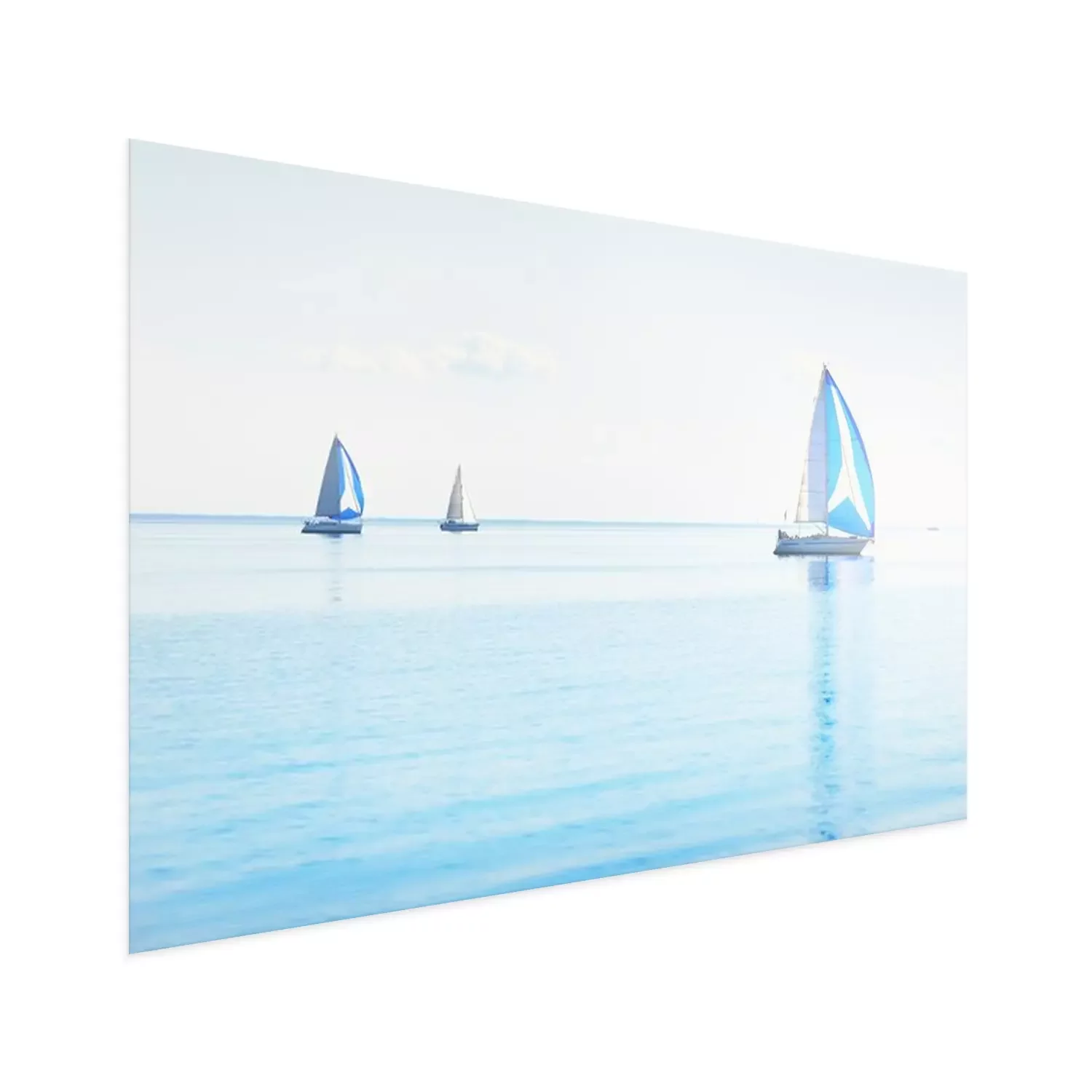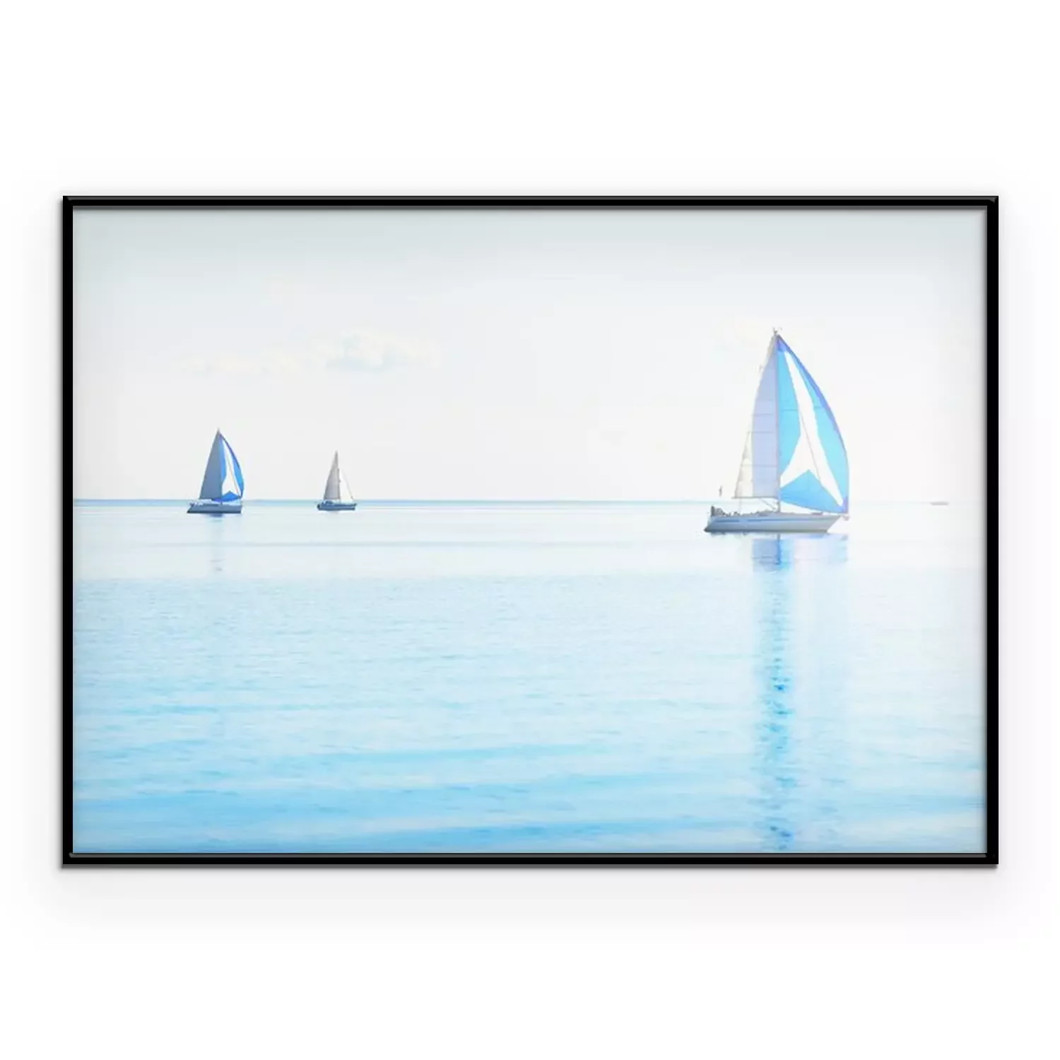 Poster  Sailing yacht regatta. Modern sailboats racing with blue spinnaker sails. Clear summer day. Kiel, Germany. Sport and recreation, transportation, private wessel, vacations