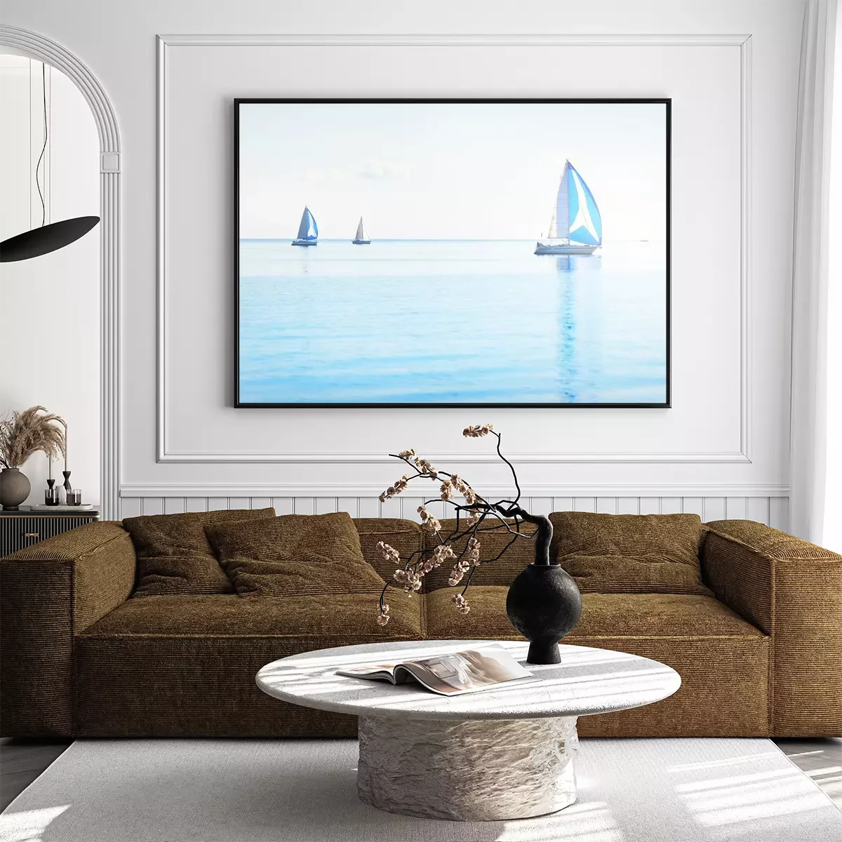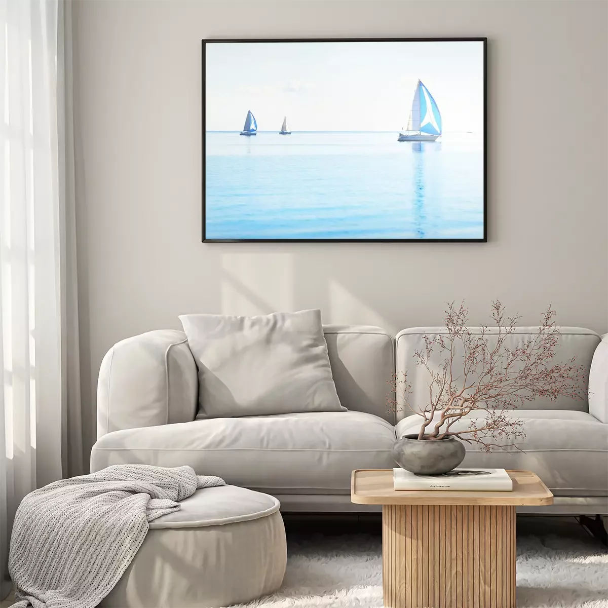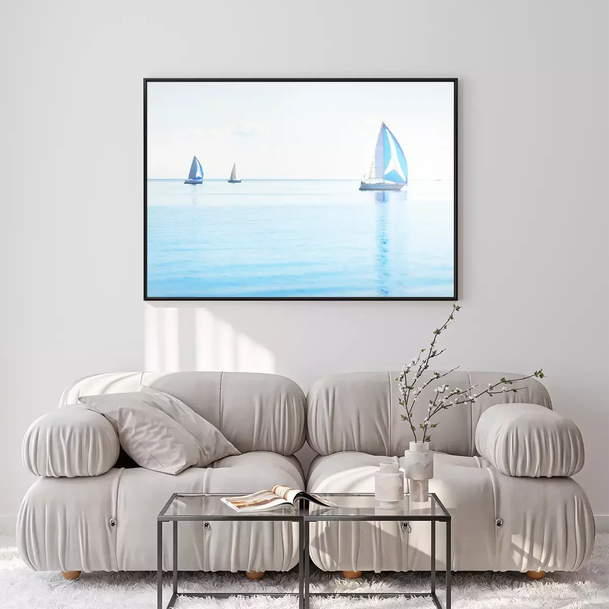 Poster  Sailing yacht regatta. Modern sailboats racing with blue spinnaker sails. Clear summer day. Kiel, Germany. Sport and recreation, transportation, private wessel, vacations