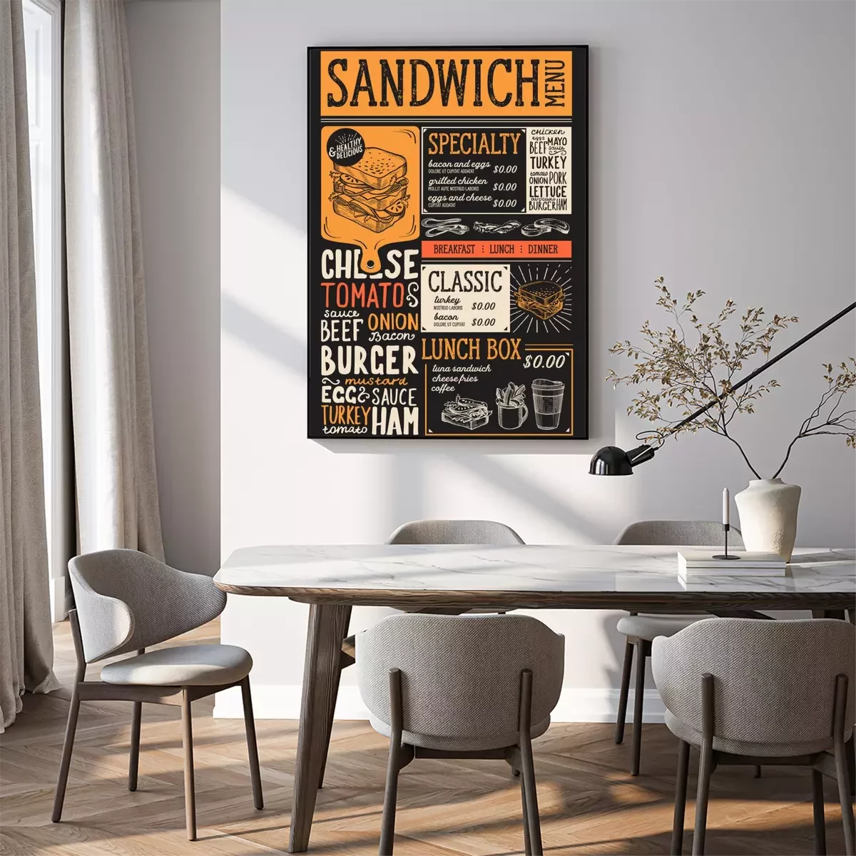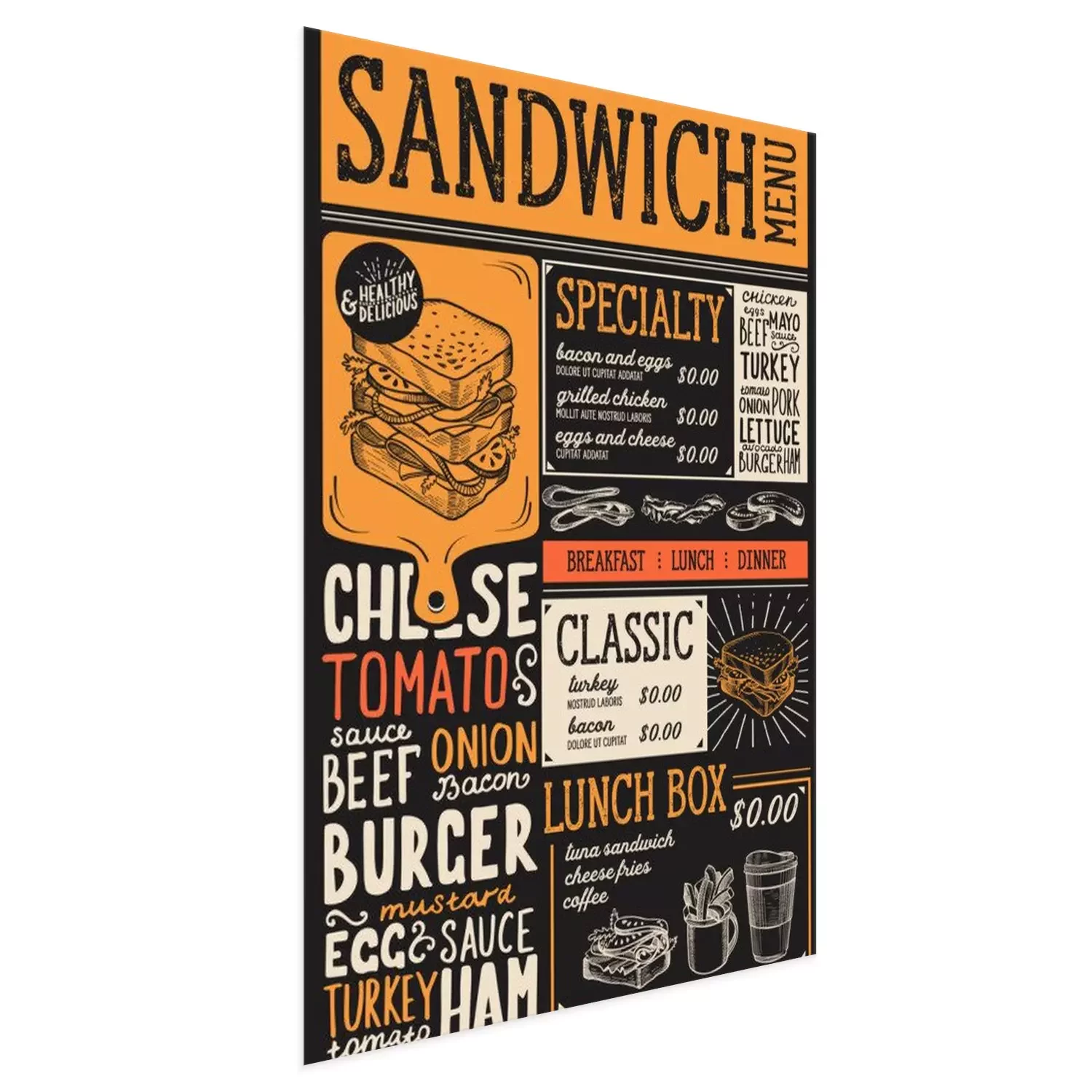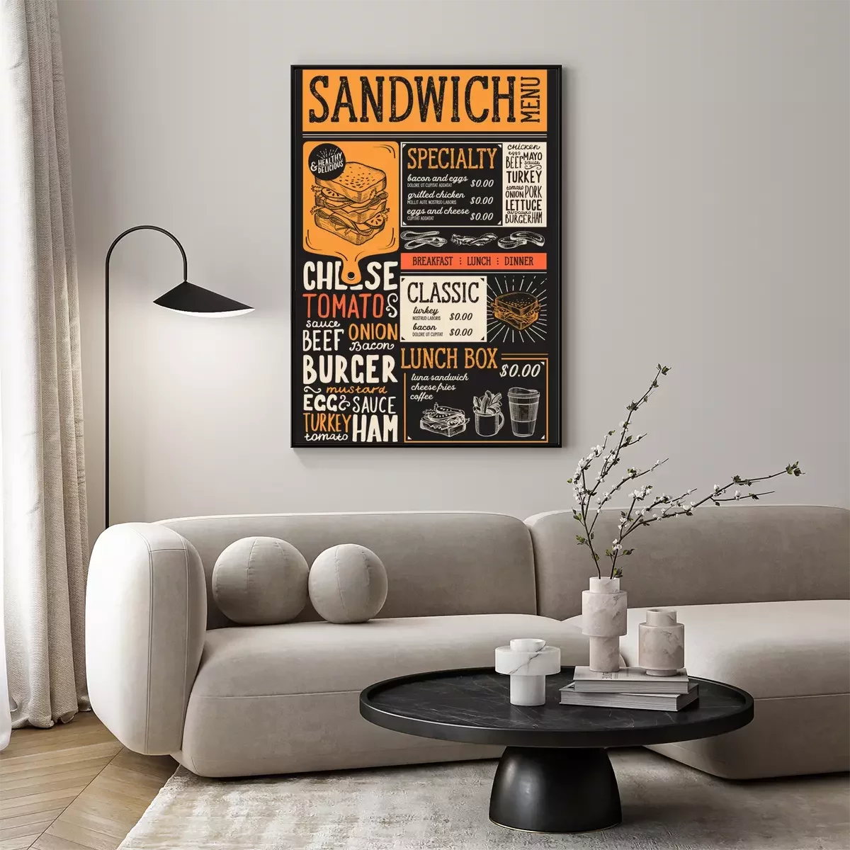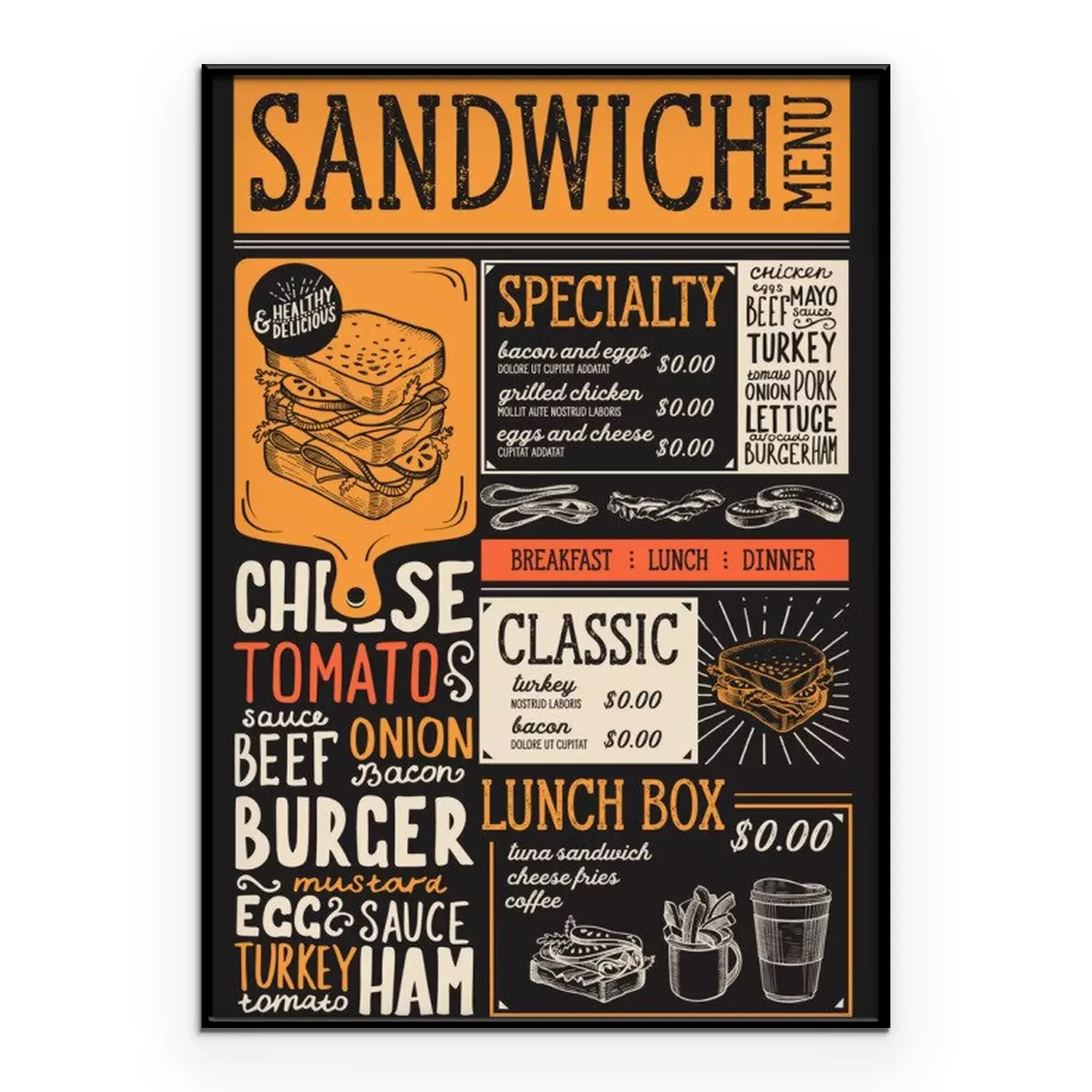Poster : Sandwich restaurant menu. Vector food flyer for bar and cafe. Design template with vintage hand-drawn illustrations.