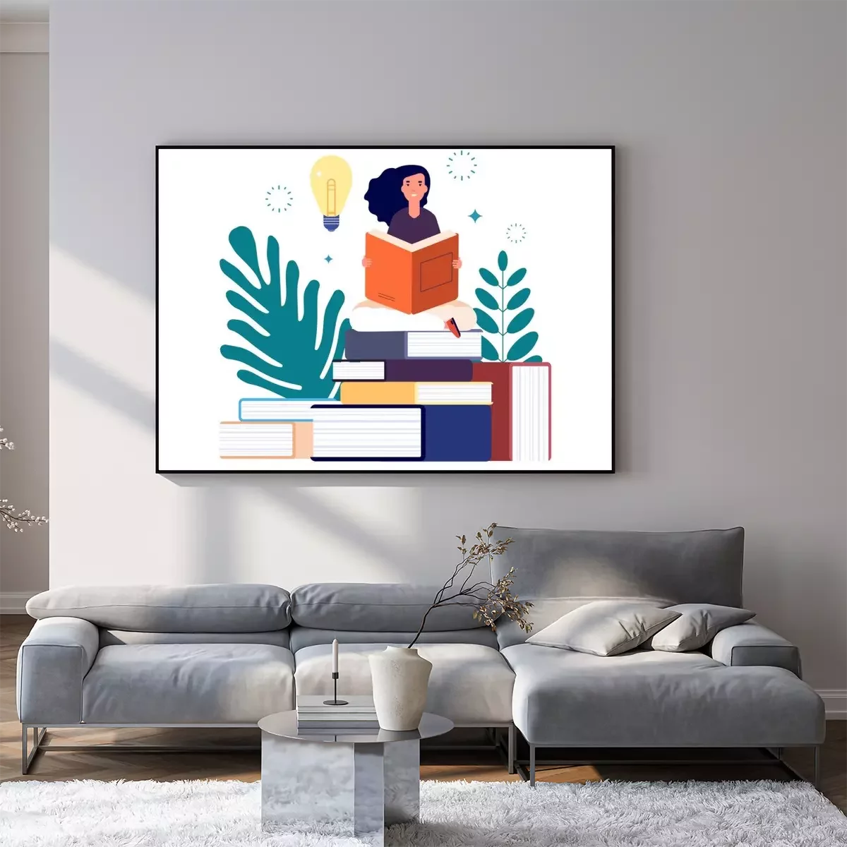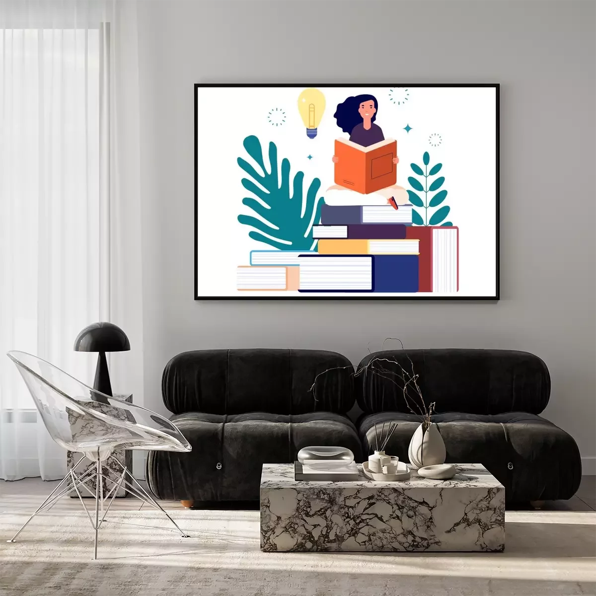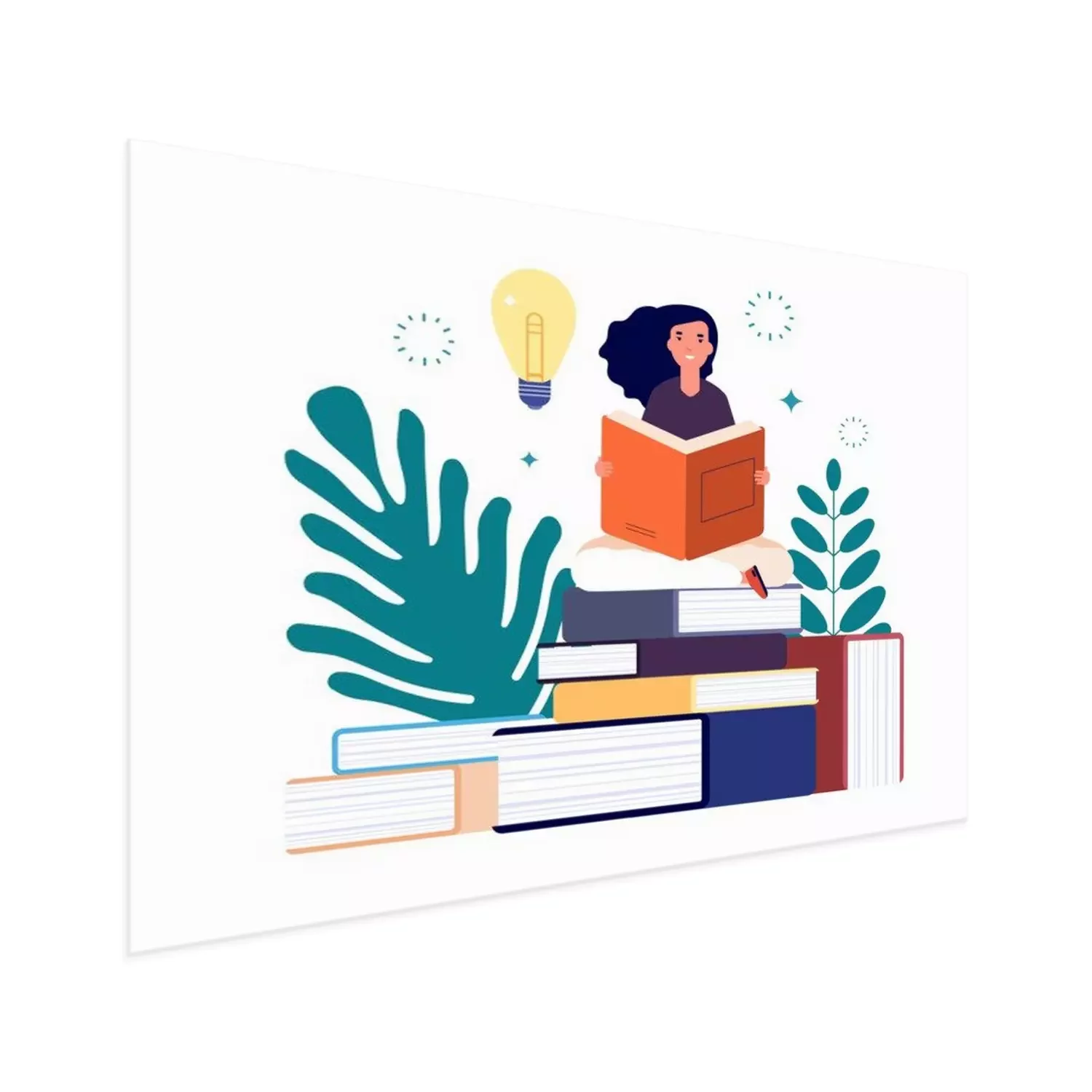 Poster  Self education. Girl reading book, study and gain new knowledge. Woman learns from textbooks. Business studying, have new idea vector concept. Education student read book new knowledge illustration