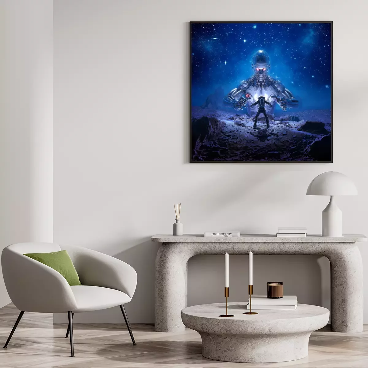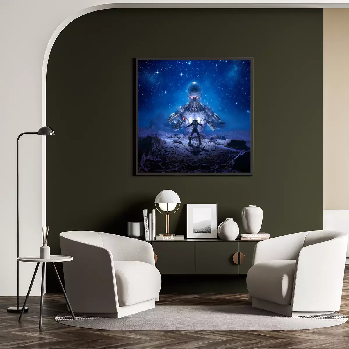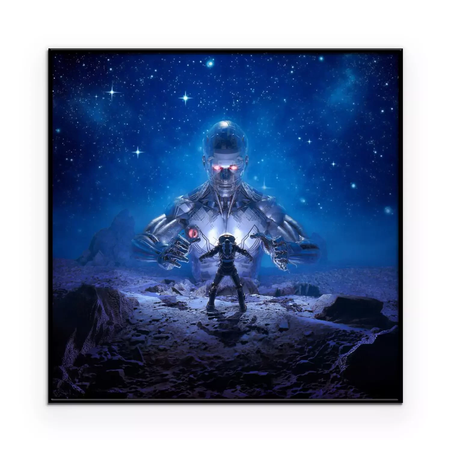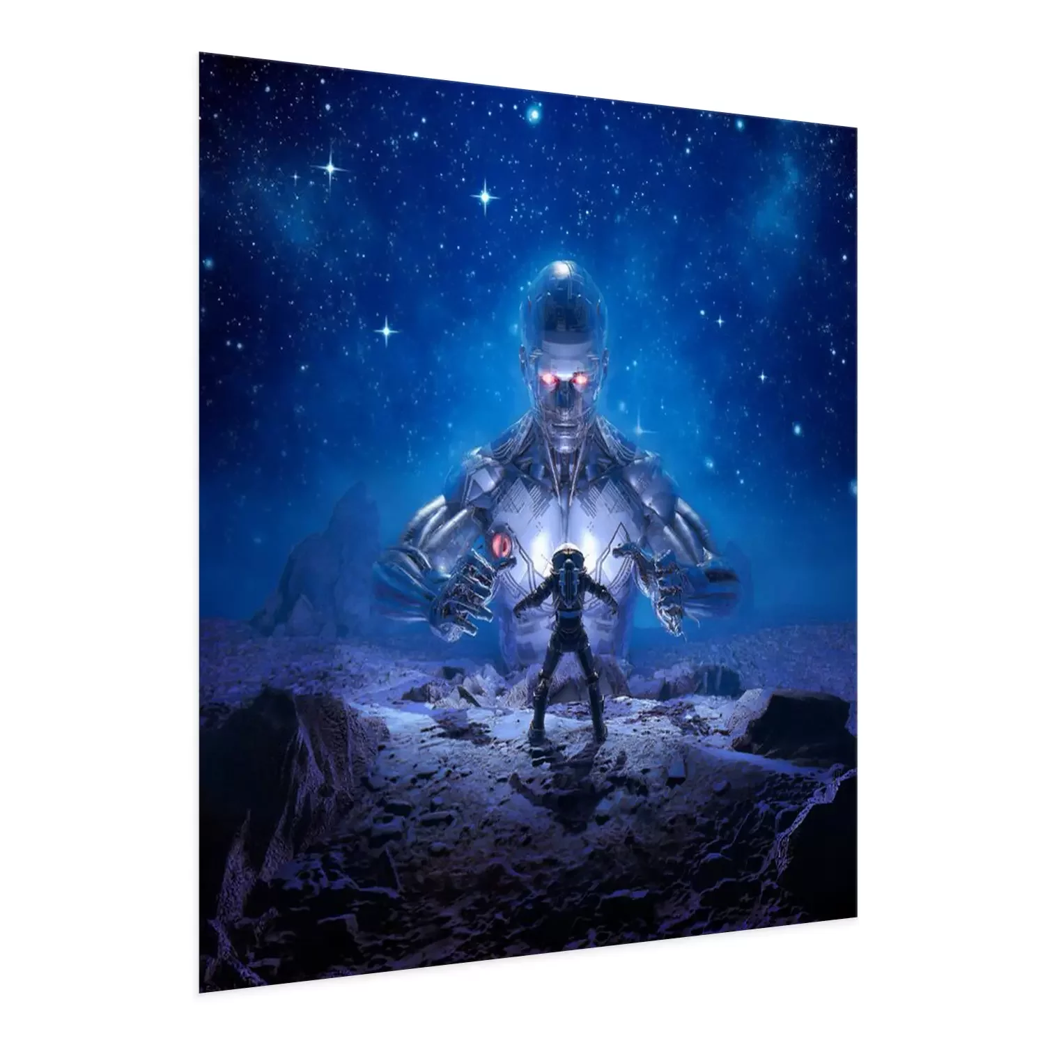 Poster  Sentinel of Titan / 3D illustration of retro science fiction scene showing astronaut encountering giant alien robot on desert planet