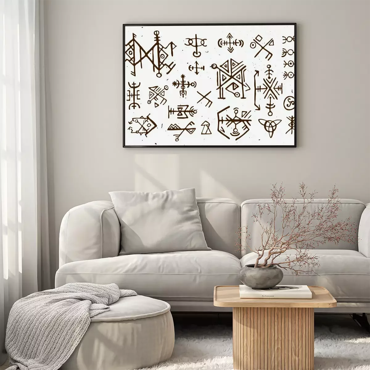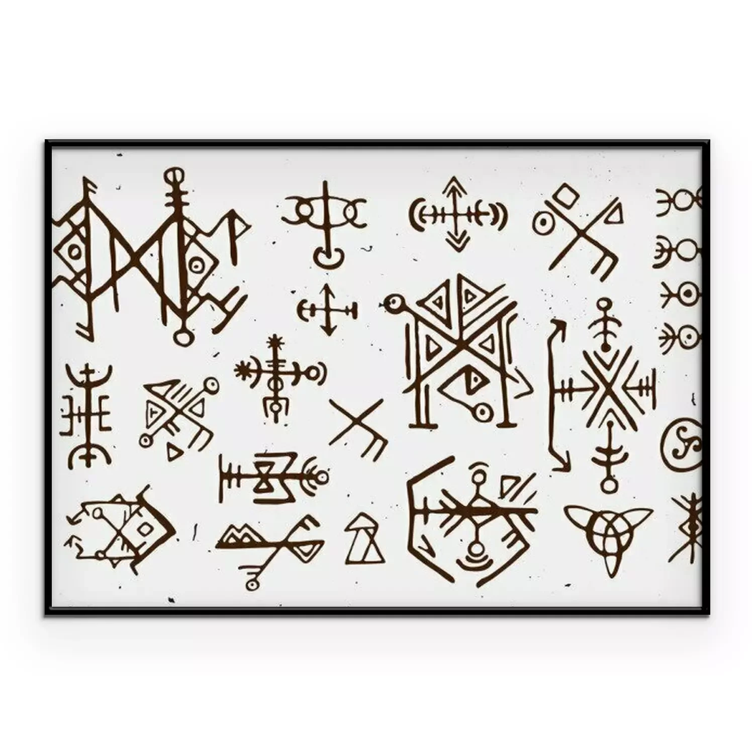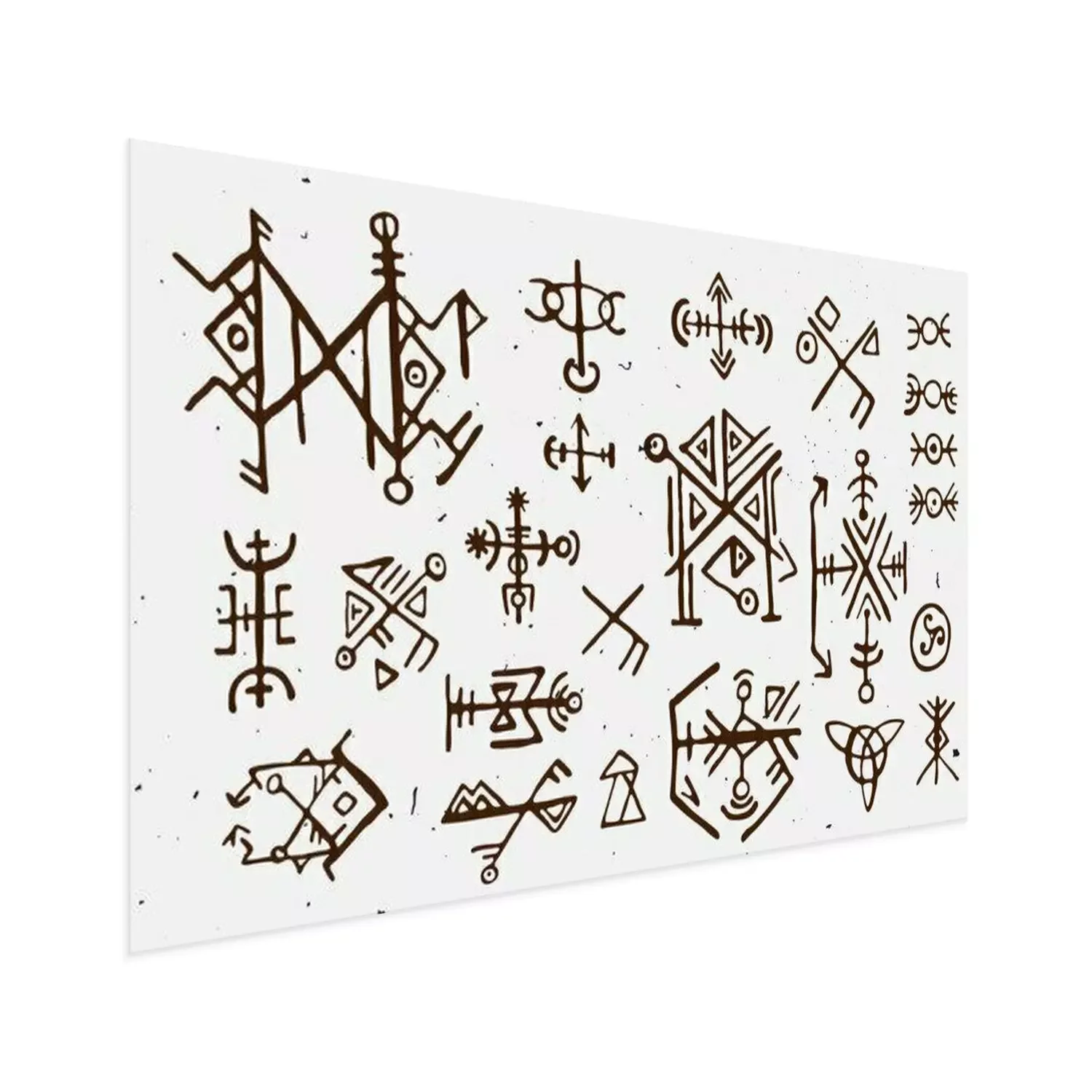 Poster  Set de runes islandaises et viking du Futhark. Main magique dessiner des symboles comme des talismans scriptés. Jeu de runes anciennes d'Islande vectorielles. Galdrastafir, signes mystiques de la magi