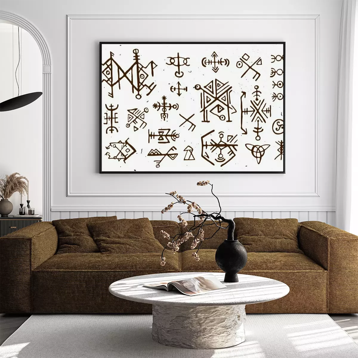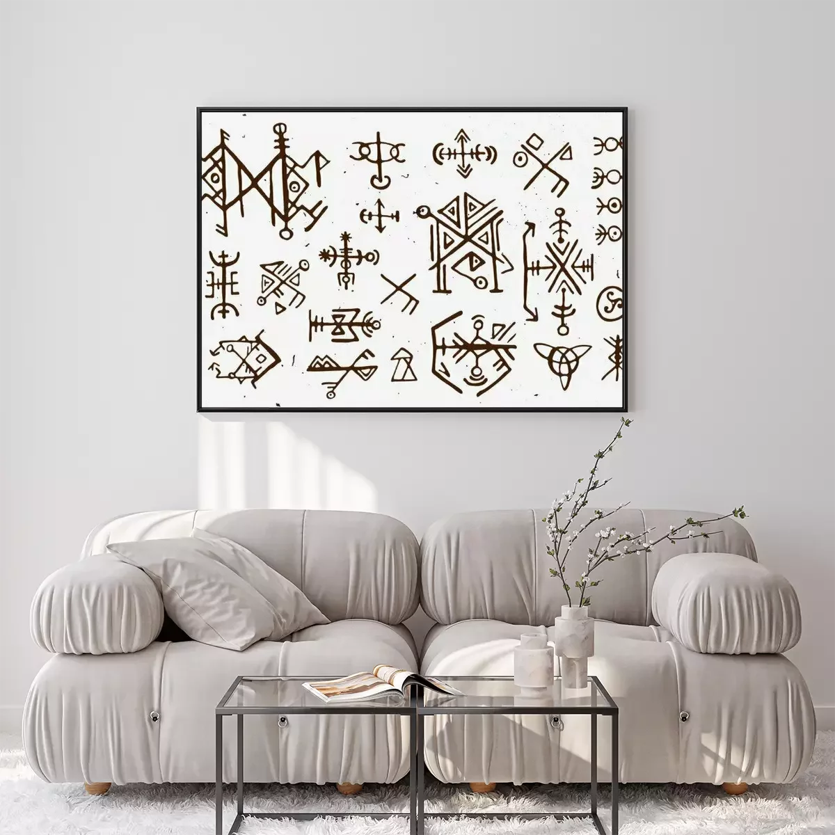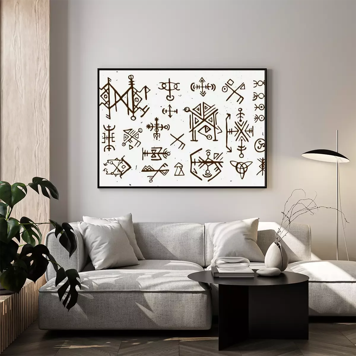 Poster  Set de runes islandaises et viking du Futhark. Main magique dessiner des symboles comme des talismans scriptés. Jeu de runes anciennes d'Islande vectorielles. Galdrastafir, signes mystiques de la magi