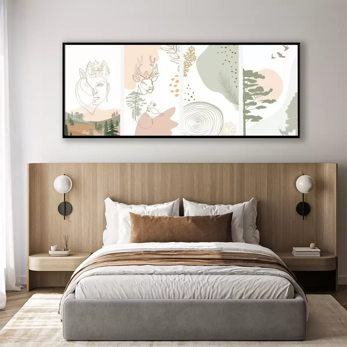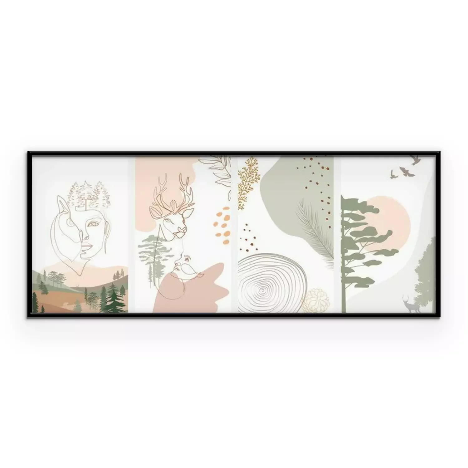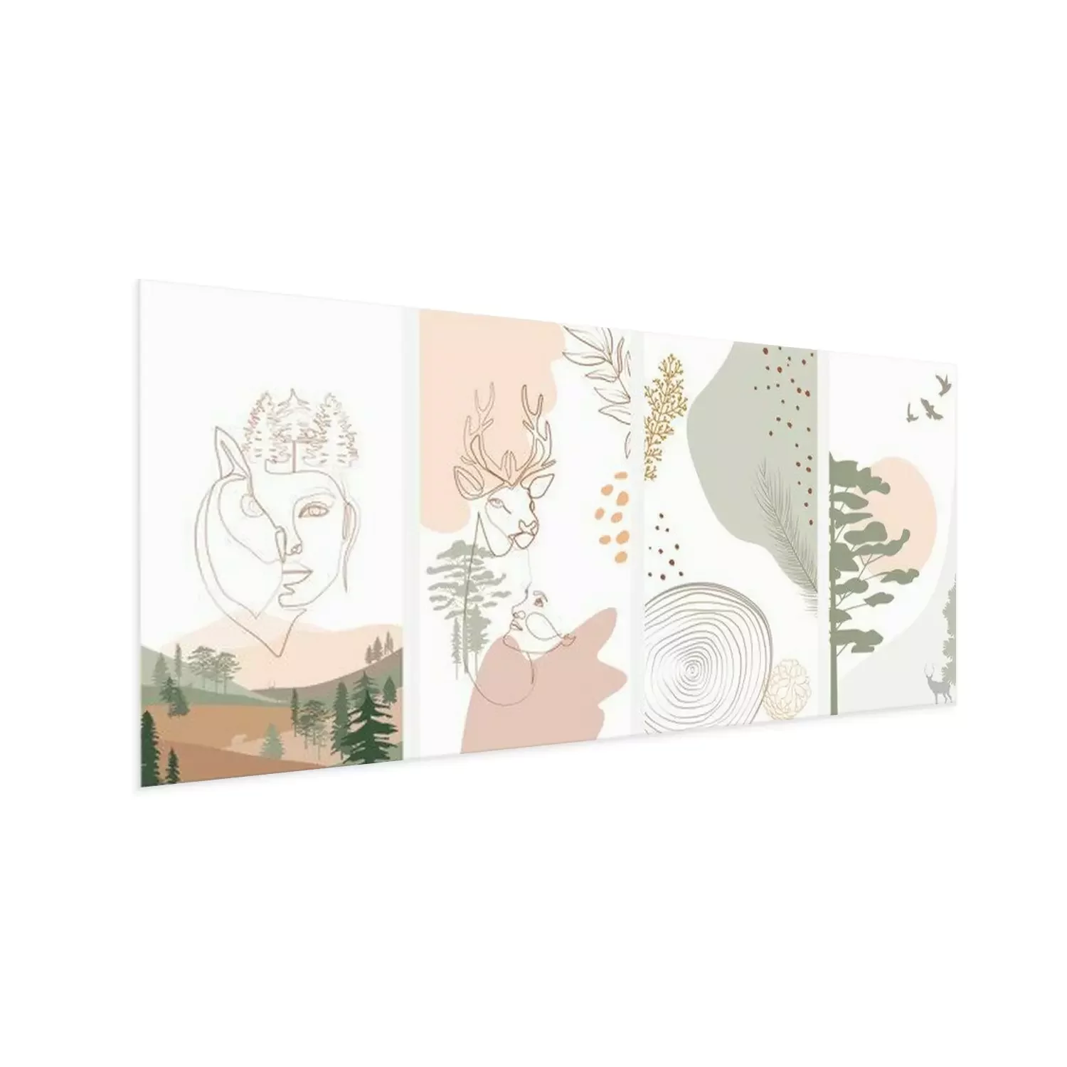 Poster : Set of abstract vertical background with forest animals, woman face, plants in one line style and abstract shapes and landscape. Background for social media minimalistic style. Vector illustration
