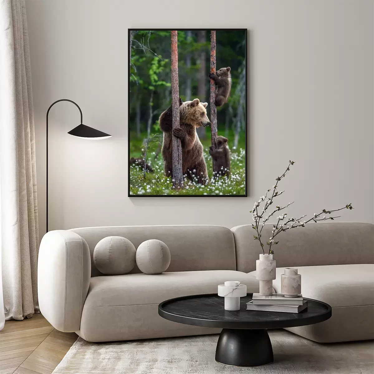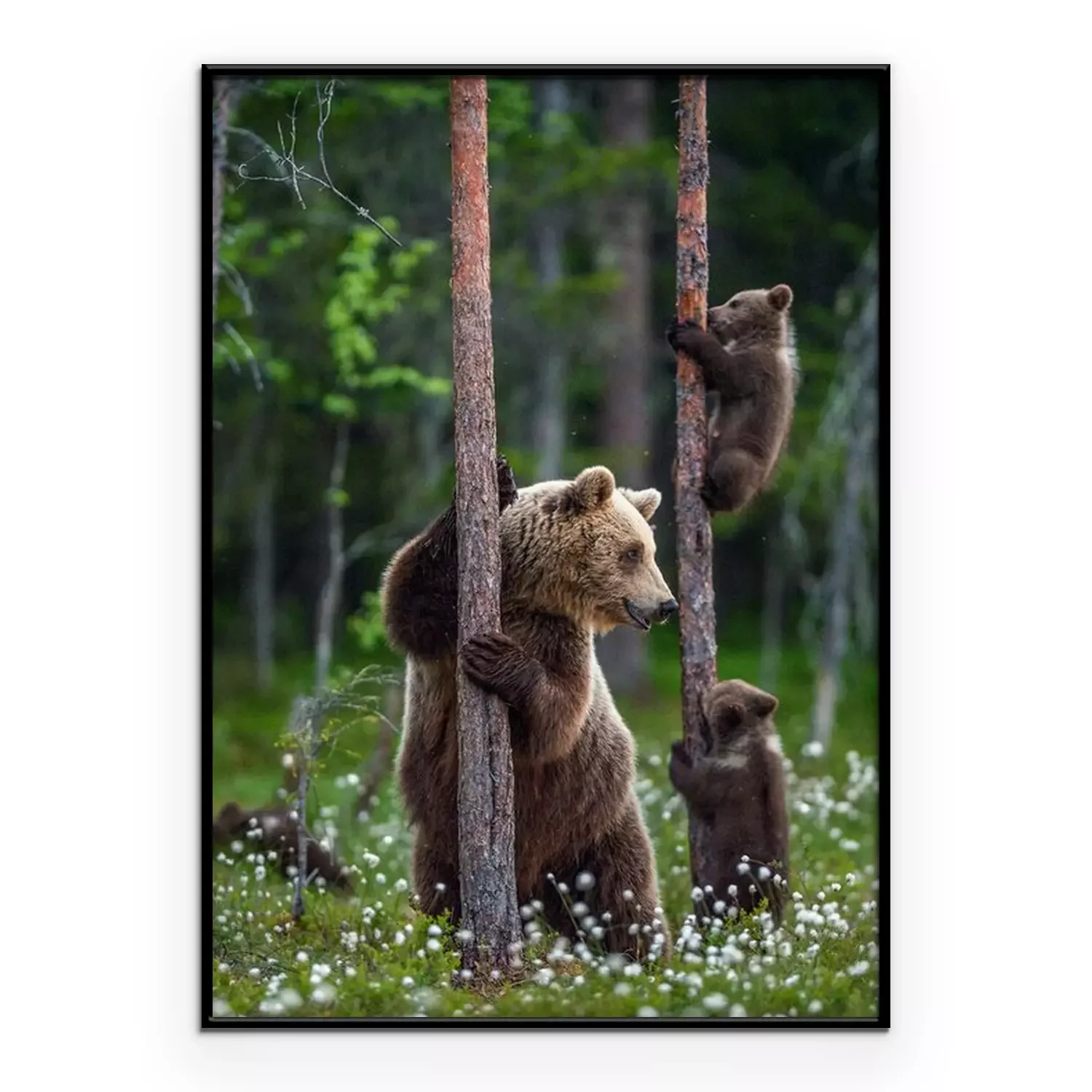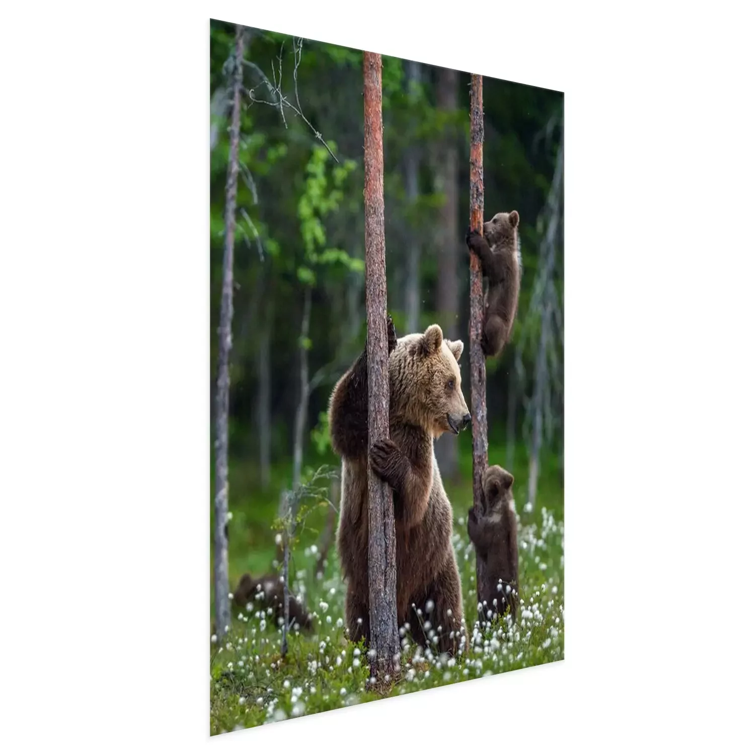 Poster  She-bear and cubs. Brown bear cubs climbs a tree. Natural habitat. In Summer forest. Sceintific name: Ursus arctos.