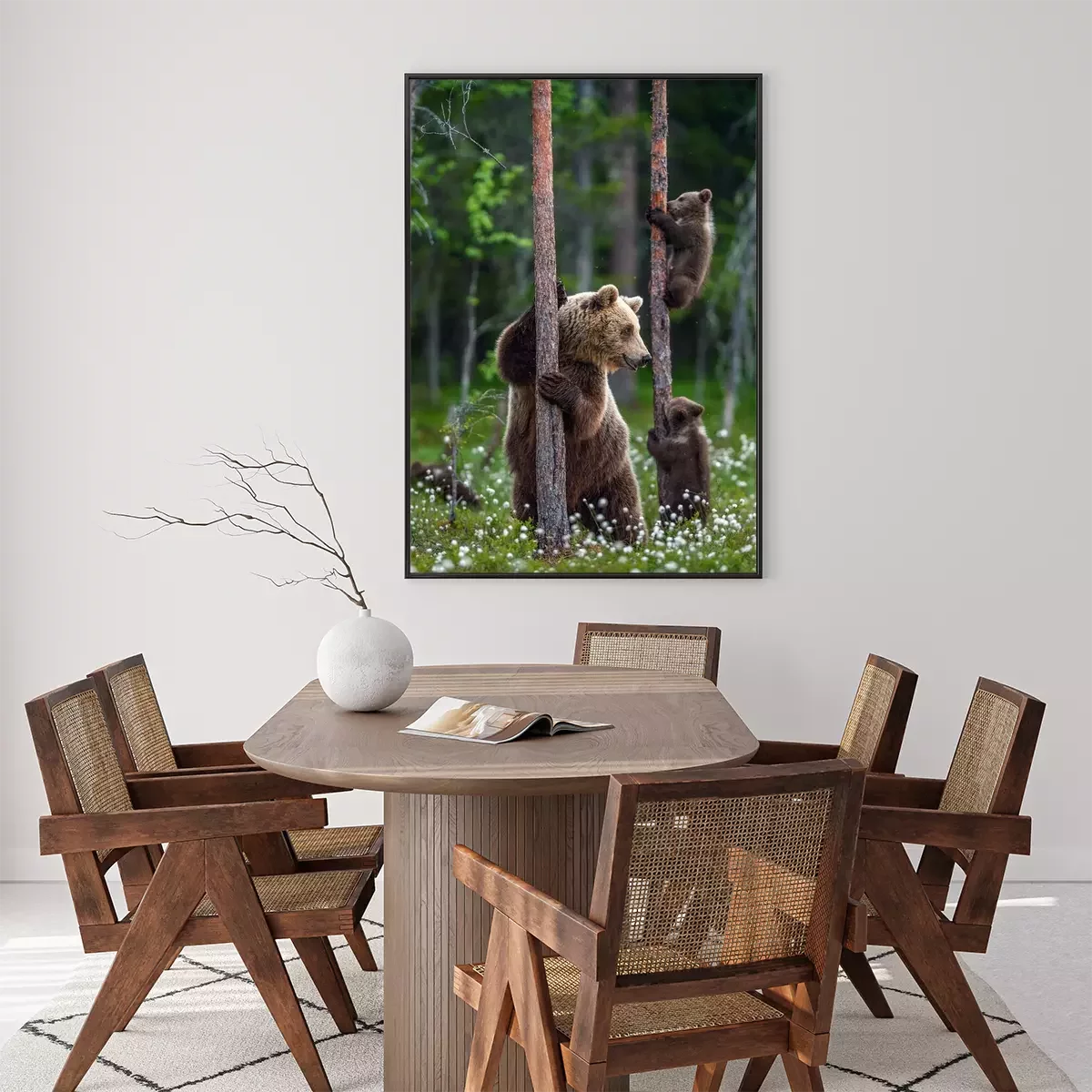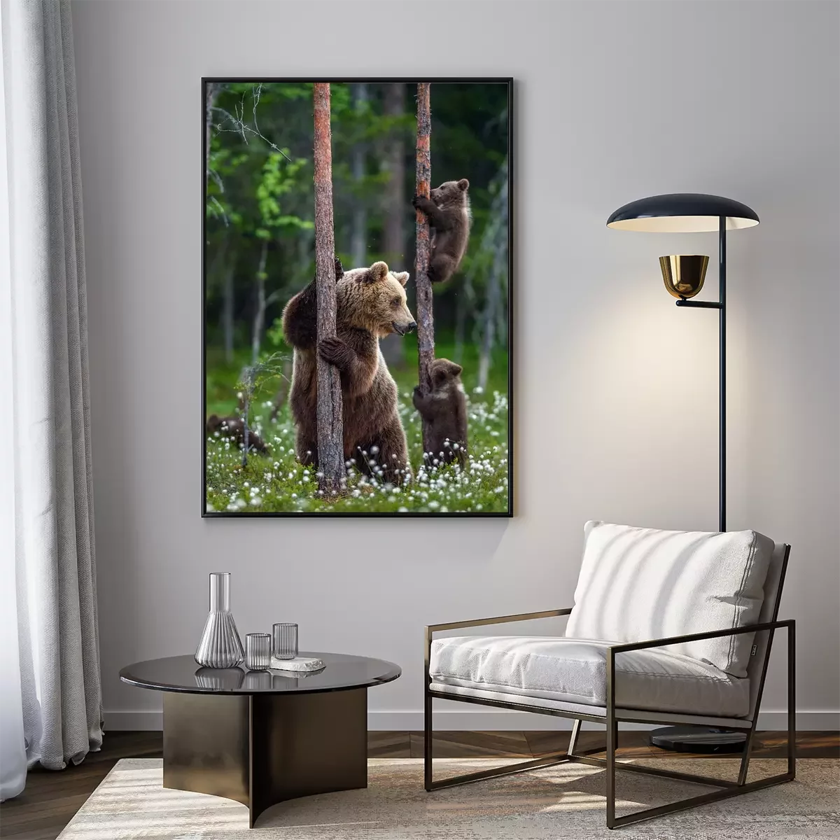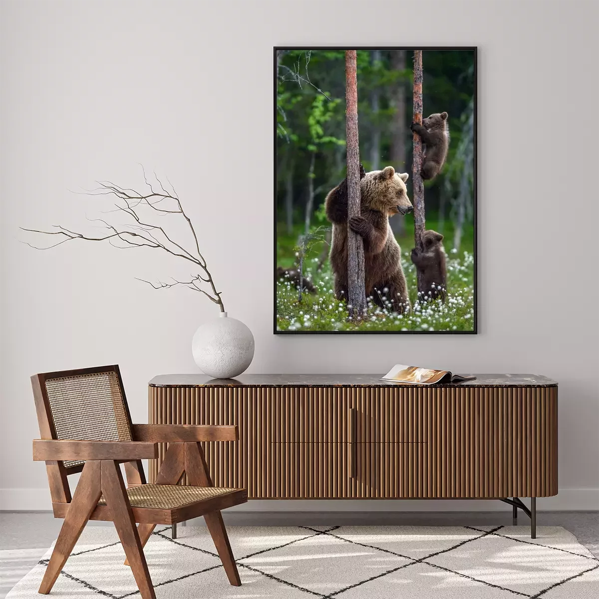 Poster  She-bear and cubs. Brown bear cubs climbs a tree. Natural habitat. In Summer forest. Sceintific name: Ursus arctos.