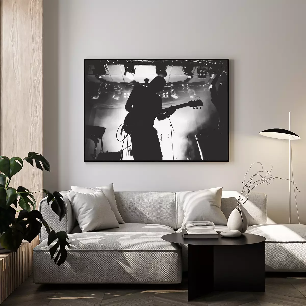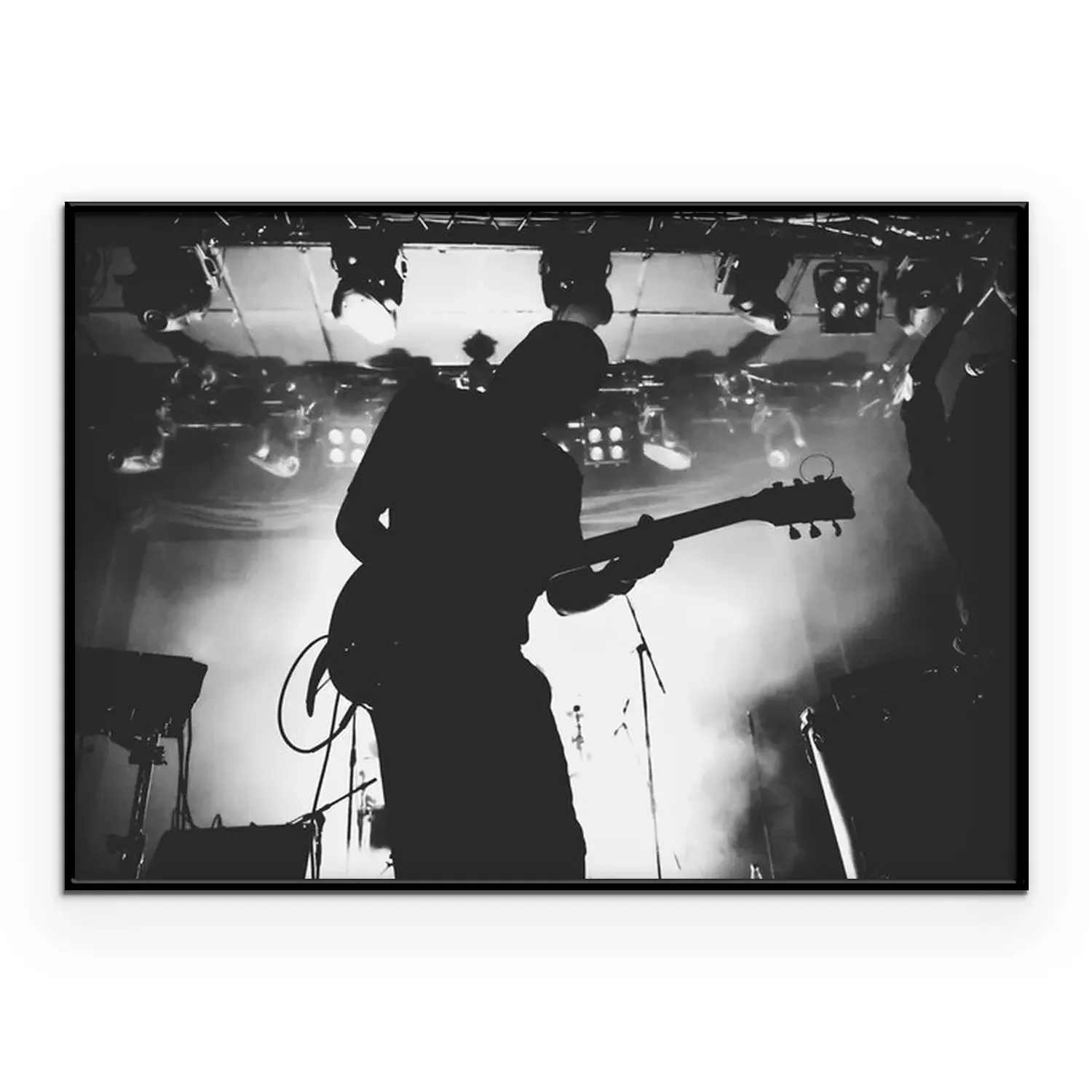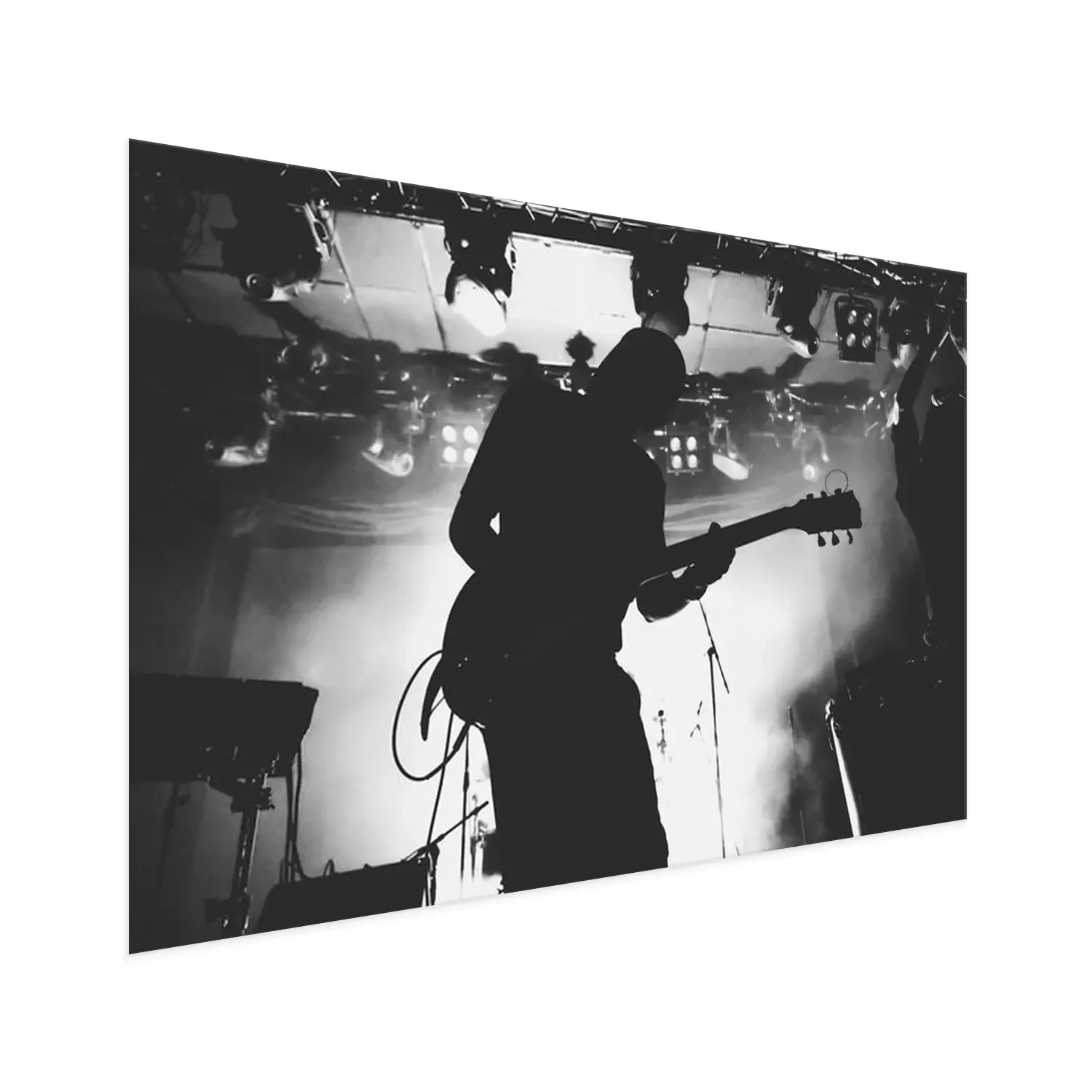 Poster : Silhouette de guitariste sur une scène dans une scène brillante s'allume. Noir et blanc